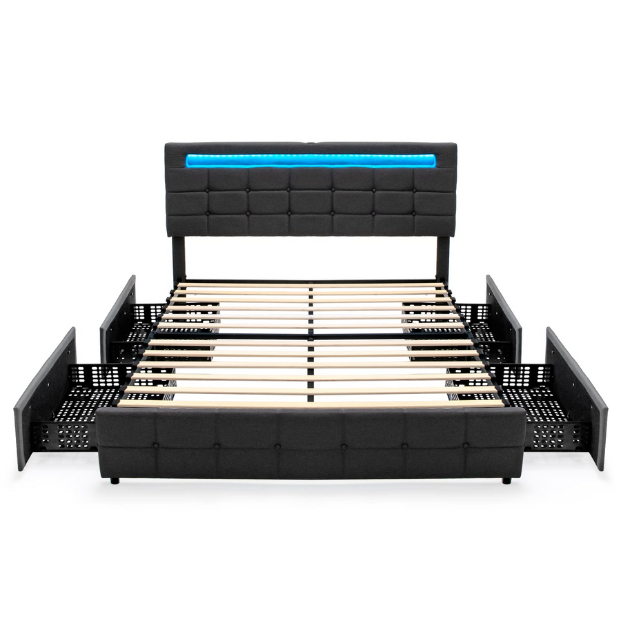 - Equipped with 4 storage drawers, the upholstered bed frame provides ample space for bedroom sundries, such as clothes, shoes, seasonal bedding and toys. More importantly, each drawer is fitted with rolling casters, so that you can easily pull them out to organize the sundries.