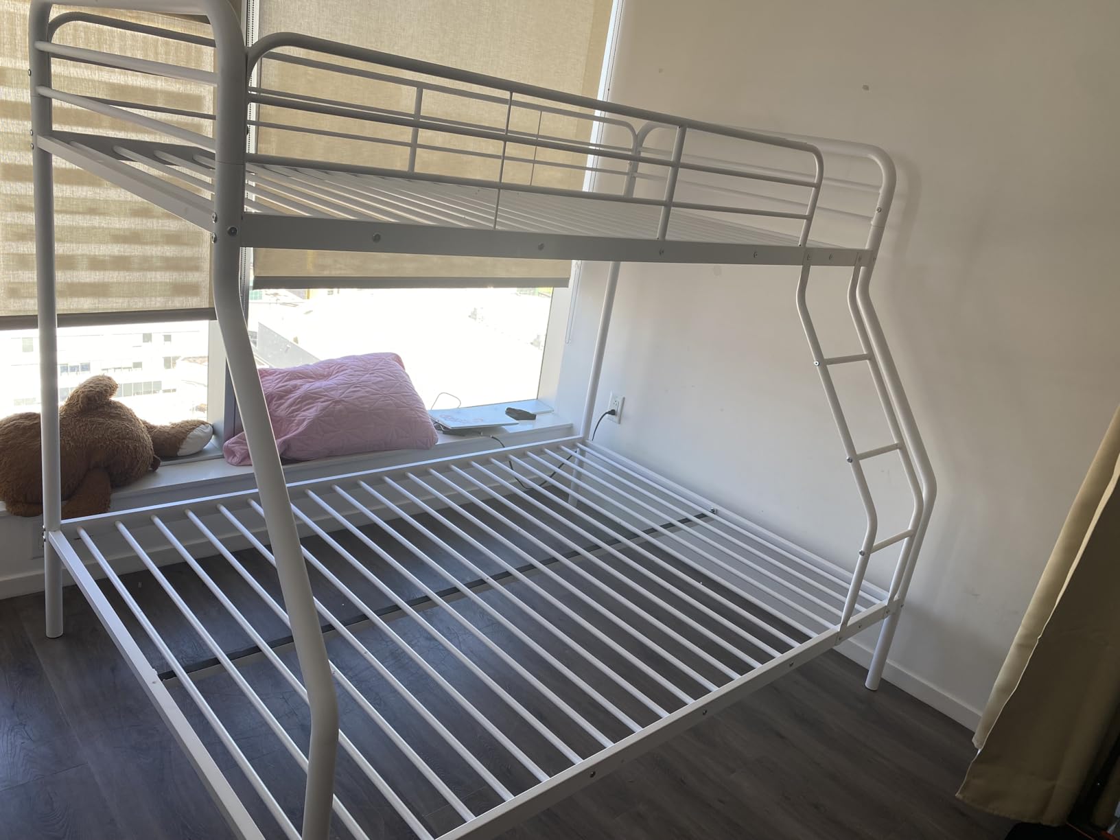 Took a while to build, but the end result is great. I was skeptical at first since it didn’t have any reviews, but it turned out to be worth it. There is a slight noise and a bit of shaking when moving on the top bunk, but nothing concerning.
