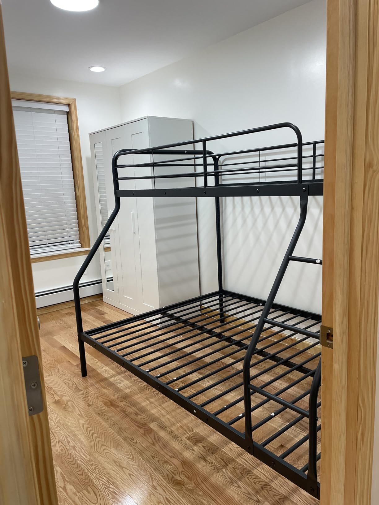 Feature: 21 + 21 powder-coated metal slats ensure durability and stability Noise-free foam reduces friction while eliminating squeaking noises Non-slip foot pads prevent the floor from scratches Full-length guardrails ensure a safe sleeping environment Integrated ladder is designed for easy and safe access to the top bunk Twin over full bunk bed is perfect for teens, adults, and guests Ample under-bed space for bedding, storage boxes and sweeping machine Space-saving vertical design makes it perfect for small rooms No box spring needed and compatible with standard mattresses More user-friendly design presents a high quality bunk bed
