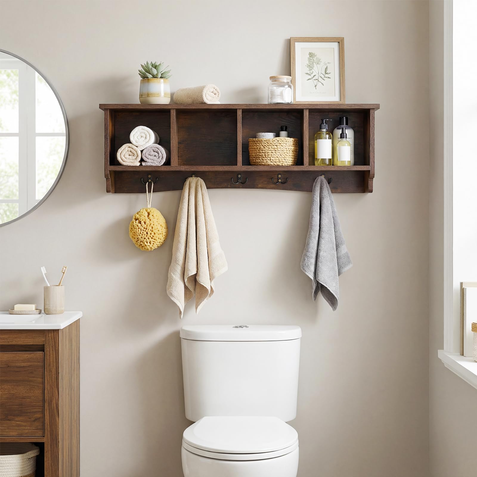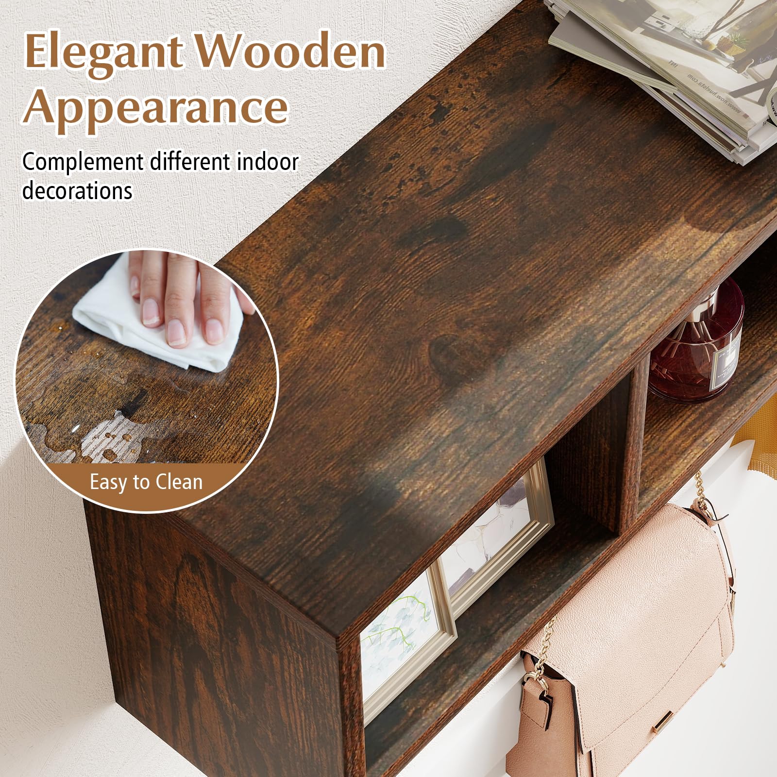 This 28.5'' wide wooden floating shelf features 4 roomy cubbies and 5 well-crafted double hooks, providing ample space to neatly store coats, bags, and everyday accessories. The space-saving wall-mounted design frees up valuable floor area, making rooms less cluttered. Moreover, the elegant wood finish complements a variety of decoration styles. Secure mounting hardware ensures a sturdy installation, making this organizer perfect for entryways, mudrooms, or even kitchens. Simplify your space with storage that works as beautifully as it looks.
