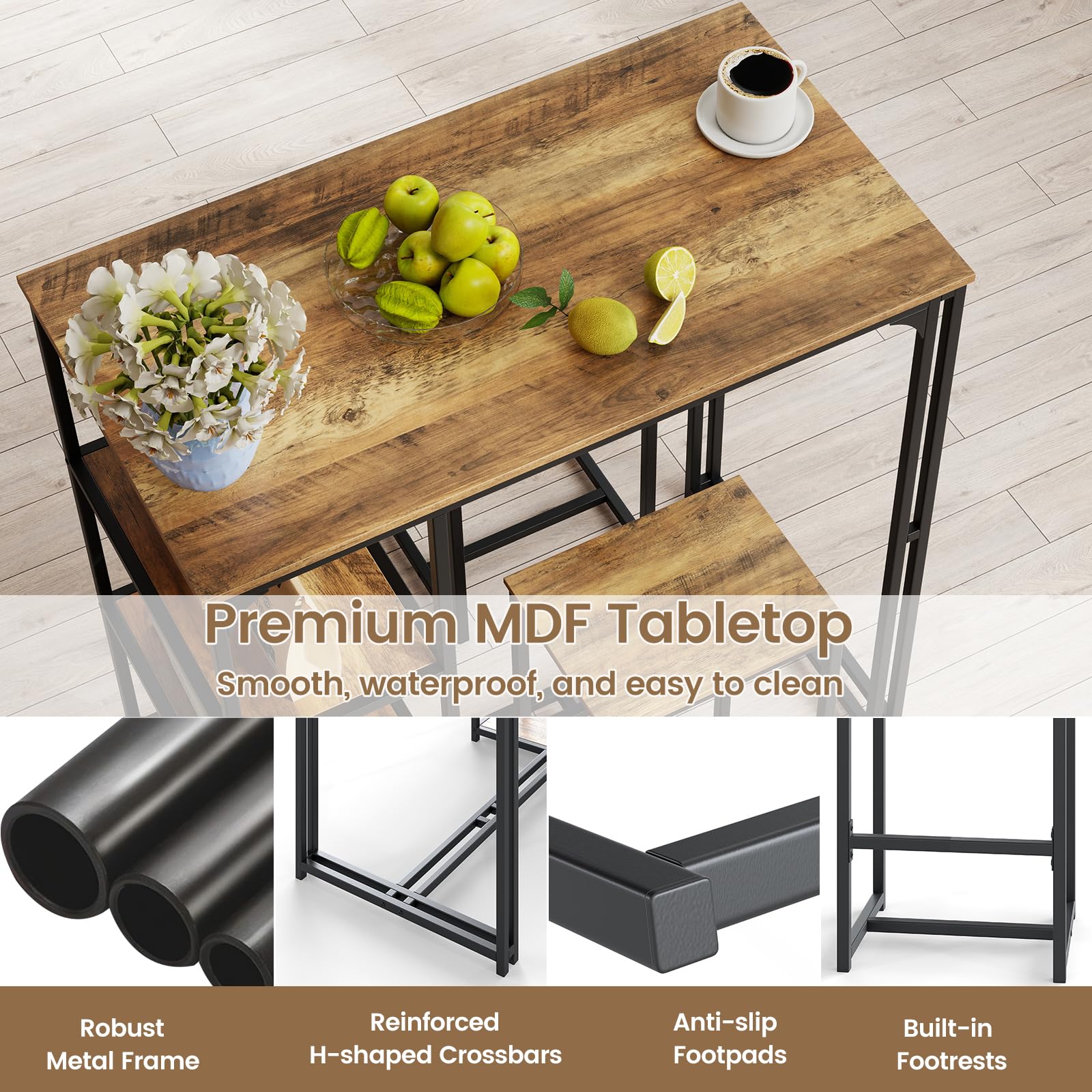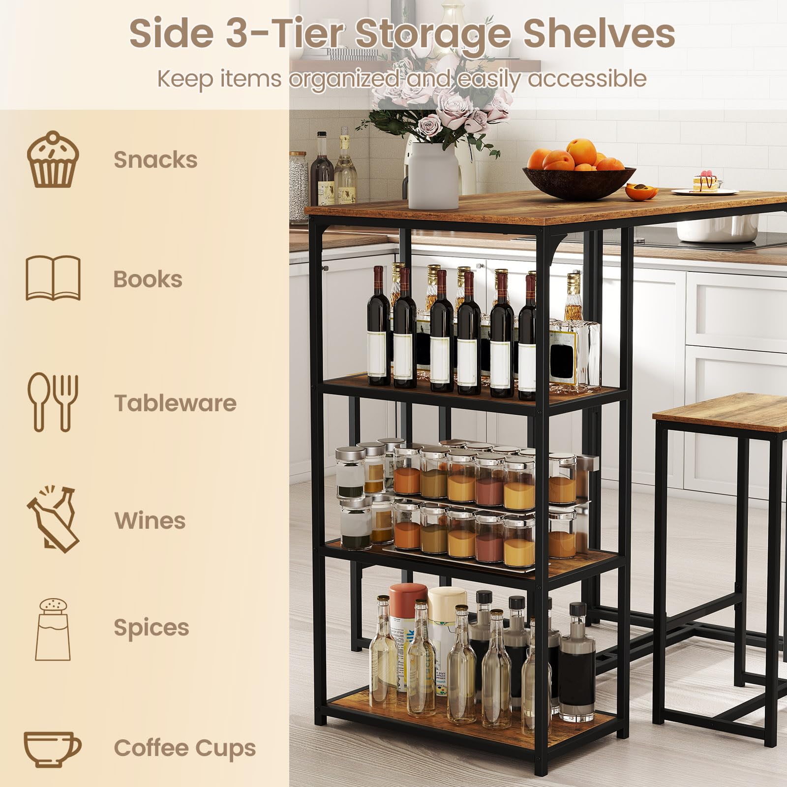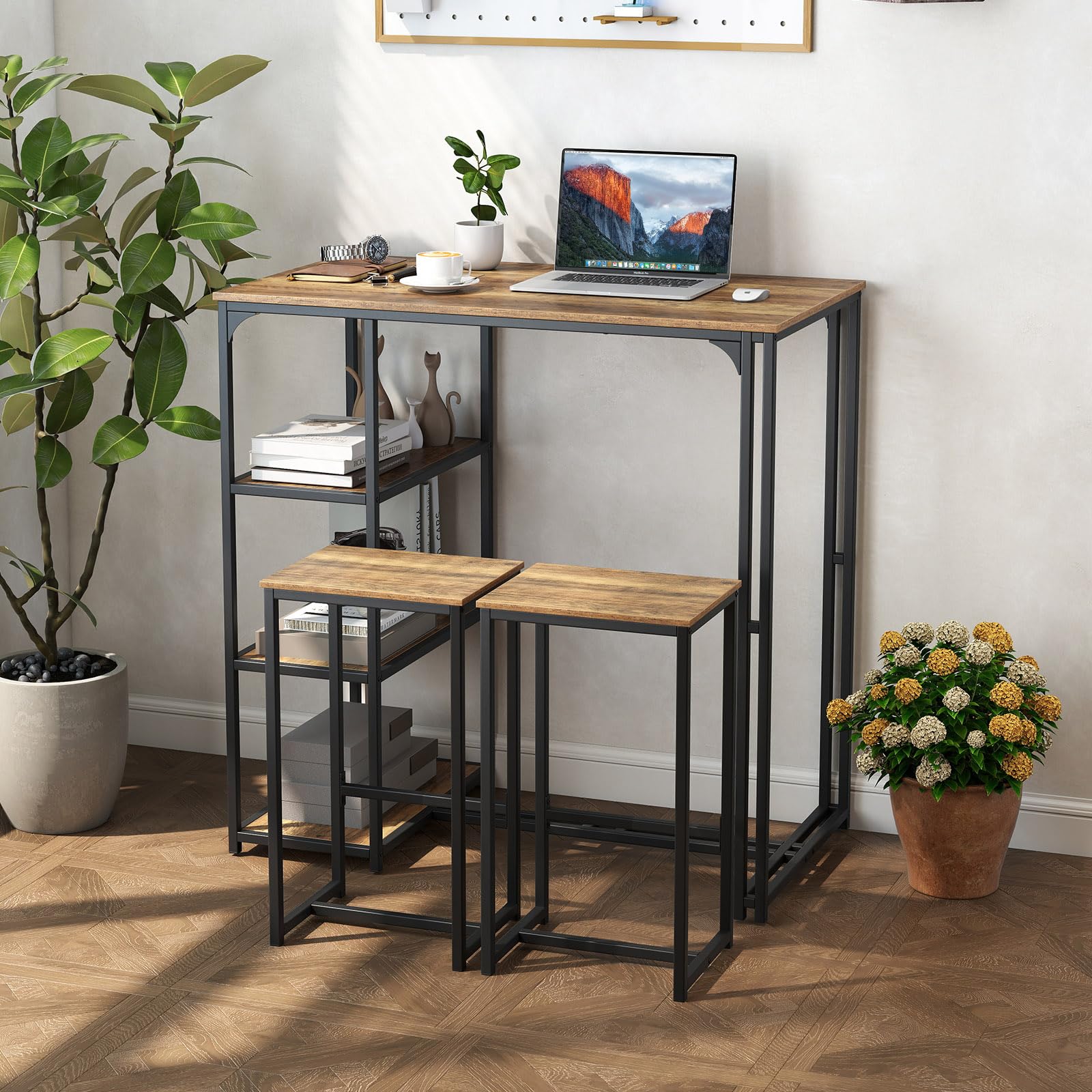 Our 3-piece bar table set includes a dining table and 2 stools, ideal for intimate gatherings, romantic dinners, casual drinks, enjoying breakfasts, or creating a cozy home office environment. And there exist 3 open compartments on the side, keeping snacks, books, tableware, wines, spices, and coffee cups within reach. When not in use, you can easily store 2 stools under the table, presenting a compact solution that keeps your living area clutter-free while maximizing your living space. The dining chairs include footrests for a relaxing dining experience. More than that, our dining set is supported by sturdy metal tubes, further reinforced by H-shaped crossbars, ensuring excellent stability and safety. Its rustic industrial style could also add a touch of charm and sophistication to any space!