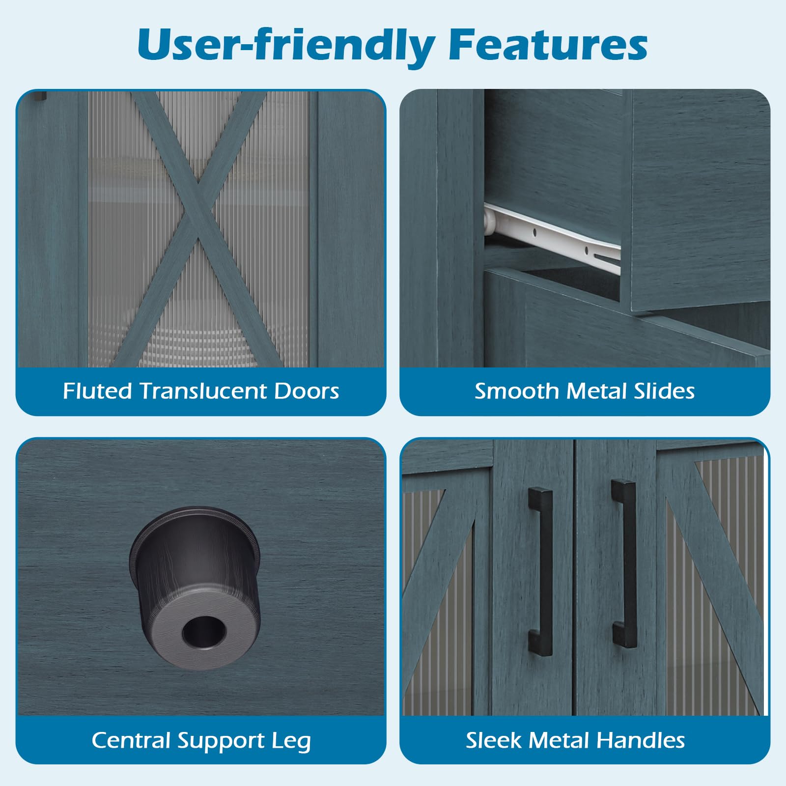 Featuring barn doors and fluted translucent panels, this sideboard cabinet creates a vintage look that stands out in any room. The spacious design includes single and double-door cabinets with matching drawers, giving you dedicated spots for everything from utensils to dinnerware. The wide top surface is perfect as a home coffee station, while 3-level adjustable shelves let you tailor storage for taller items. Designed for everyday reliability, this cabinet includes thickened panels, a central support leg, and an anti-toppling kit for extra safety.
