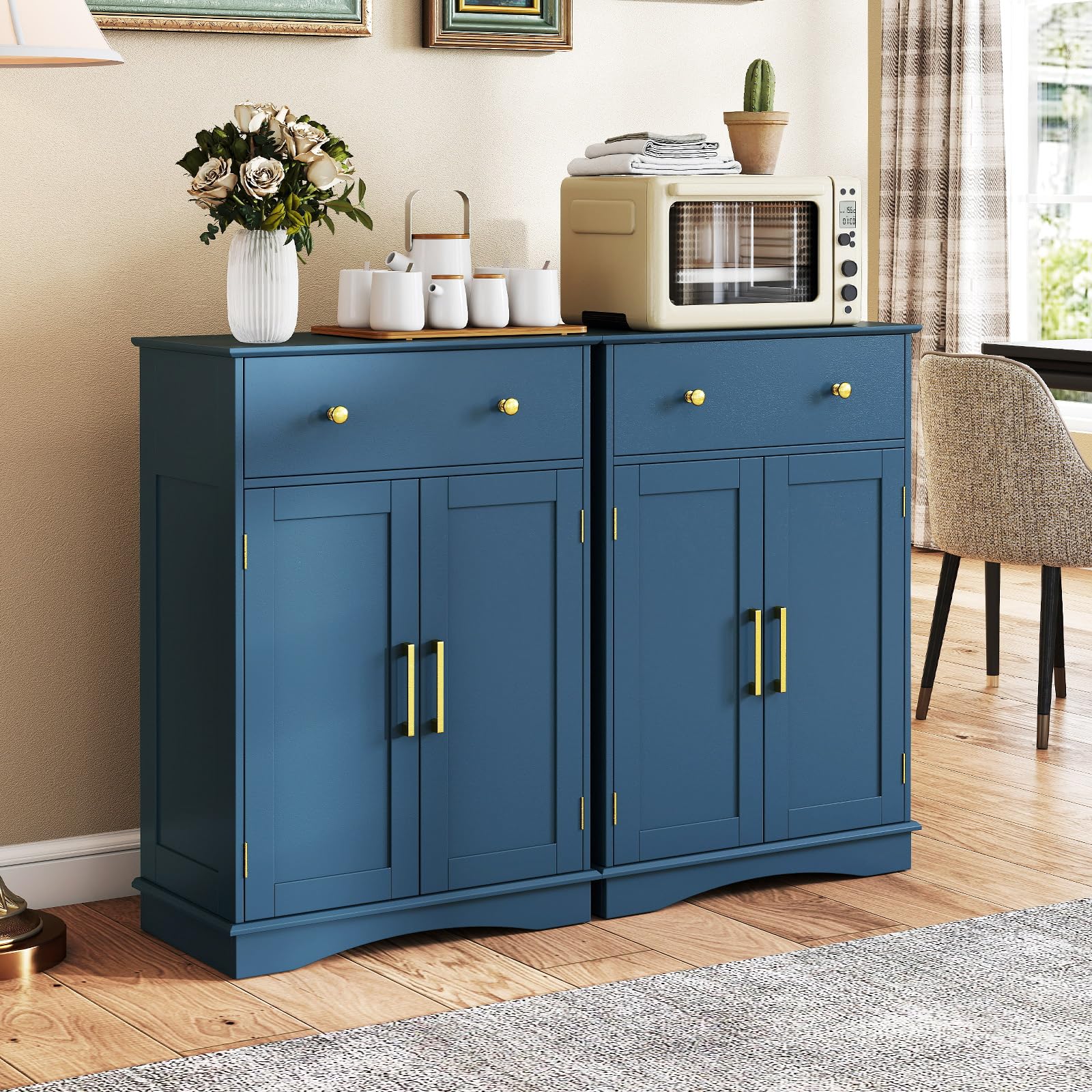 The capability of the buffet is large. Flavors, coffee beans, kitchenware, and some sundries can be stored in the cabinet freely. The material of the cabinet is wood and steel, which indicate stability and durability. You can put it in the kitchen or the dining room to keep the room tidy.