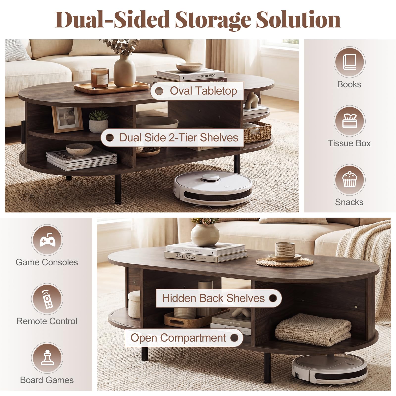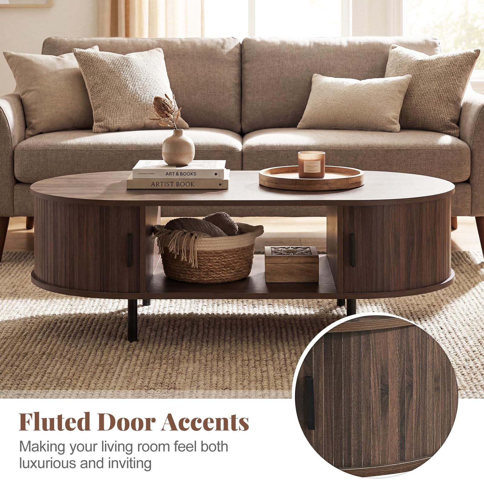 Elevate your space with this stylish wood coffee table, designed for both beauty and function. Its sleek oval top conceals ample storage, featuring dual 2-tier shelves on either side, an open compartment, and hidden rear shelves for discreet organization style. It can keep belongings out of view, ensuring your coffee table remains chic. Showcasing mid-century modern flair, the piece boasts striking fluted details and smooth-sliding tambour doors with ergonomic handles for easy access. Supported by sturdy metal legs with adjustable foot pads, this accent table ensures lasting stability and can hold up to 297 lbs. Versatile enough to enhance living rooms, lounges, or office areas, it blends timeless charm with contemporary practicality.