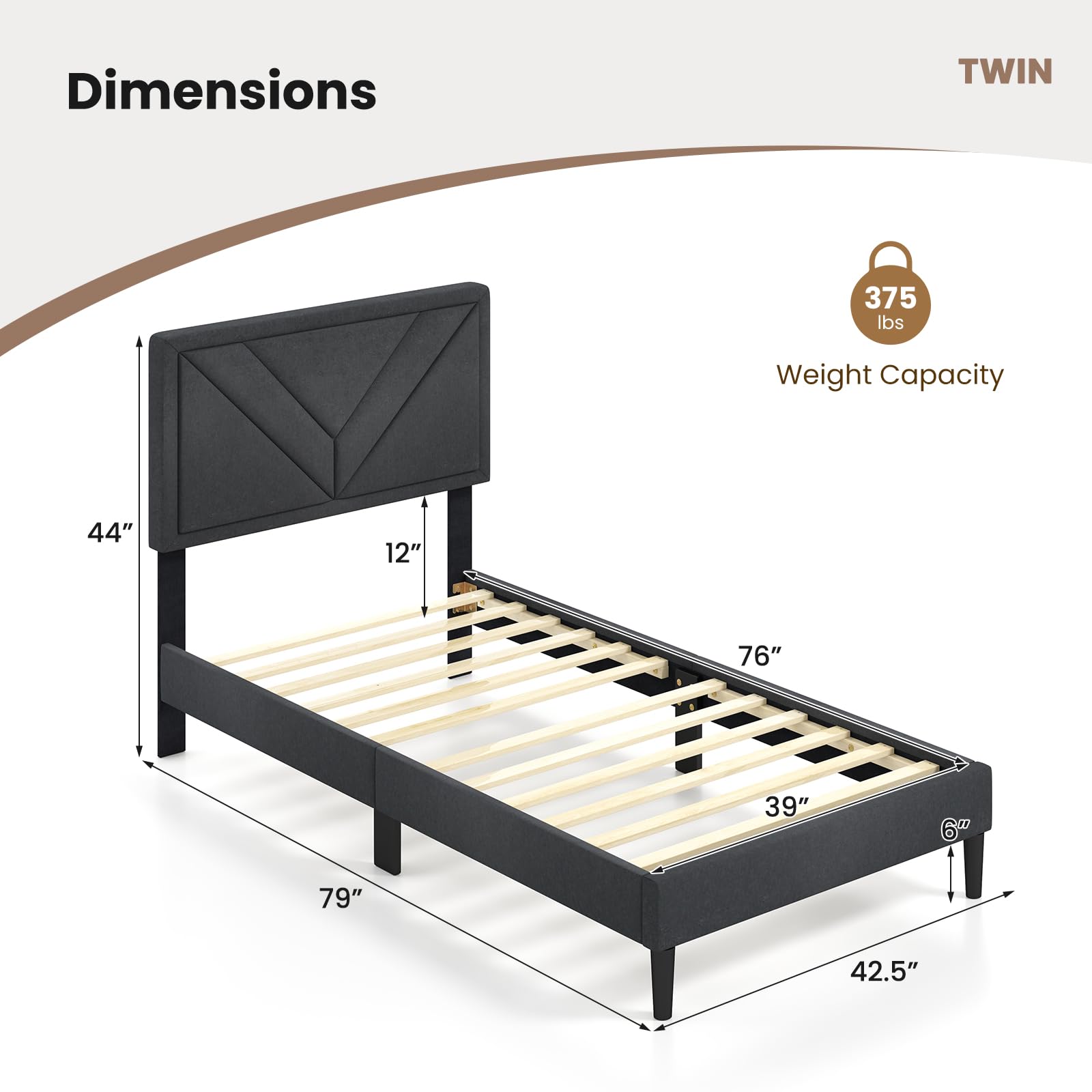 The upholstered bed comes with a high, tufted headboard for both style and support. The breathable fabric and soft padding ensure a cozy sleep experience. The platform bed's sturdy structure, including 12 long-lasting plywood slats and support legs, supports up to 375 lbs. This bed requires no box spring, thanks to the stable embedded platform. Moreover, the platform bed is ideal for 10"-12" thick mattresses. Enjoy 6" of bottom clearance for easy cleaning, maintaining a neat and organized sleeping area in your home.