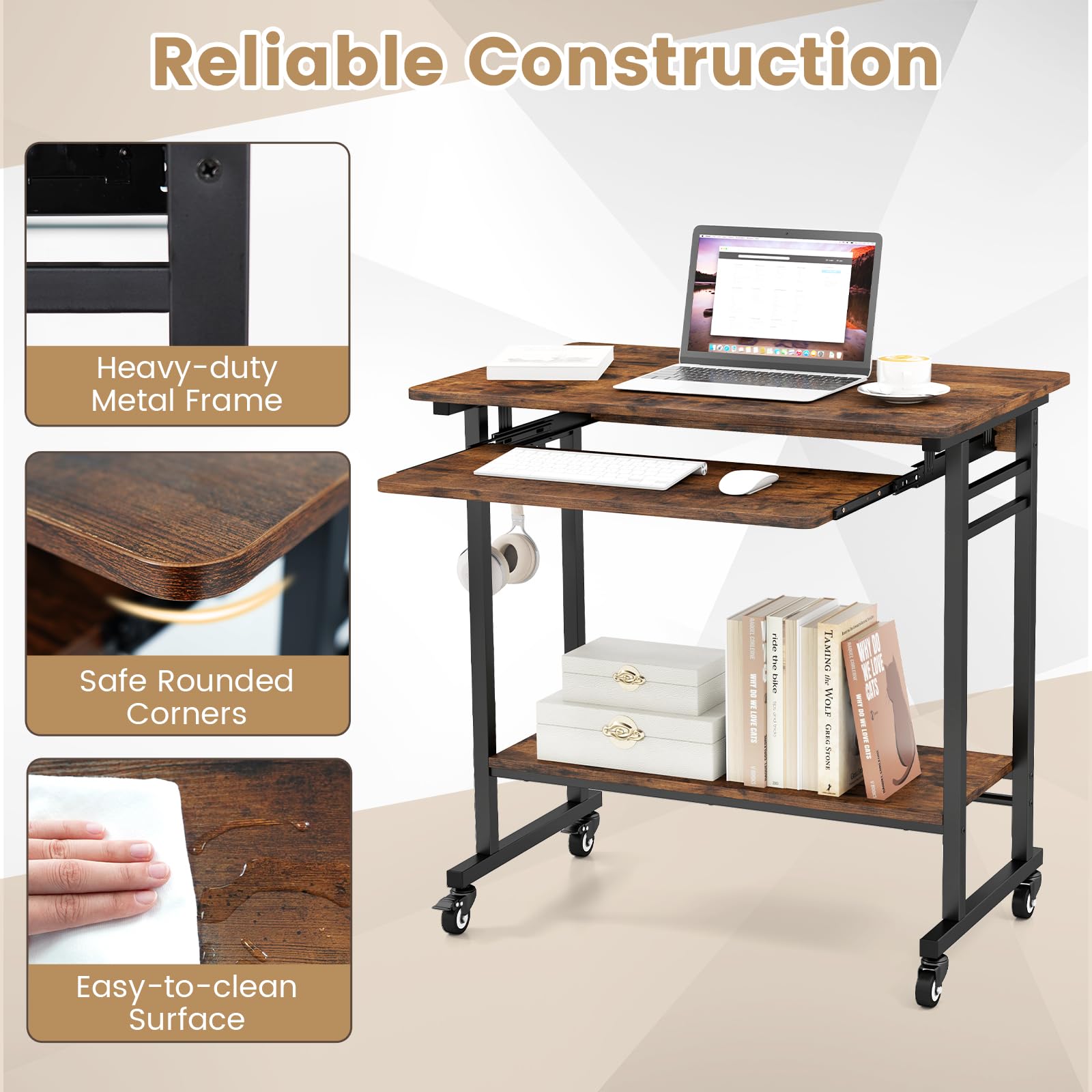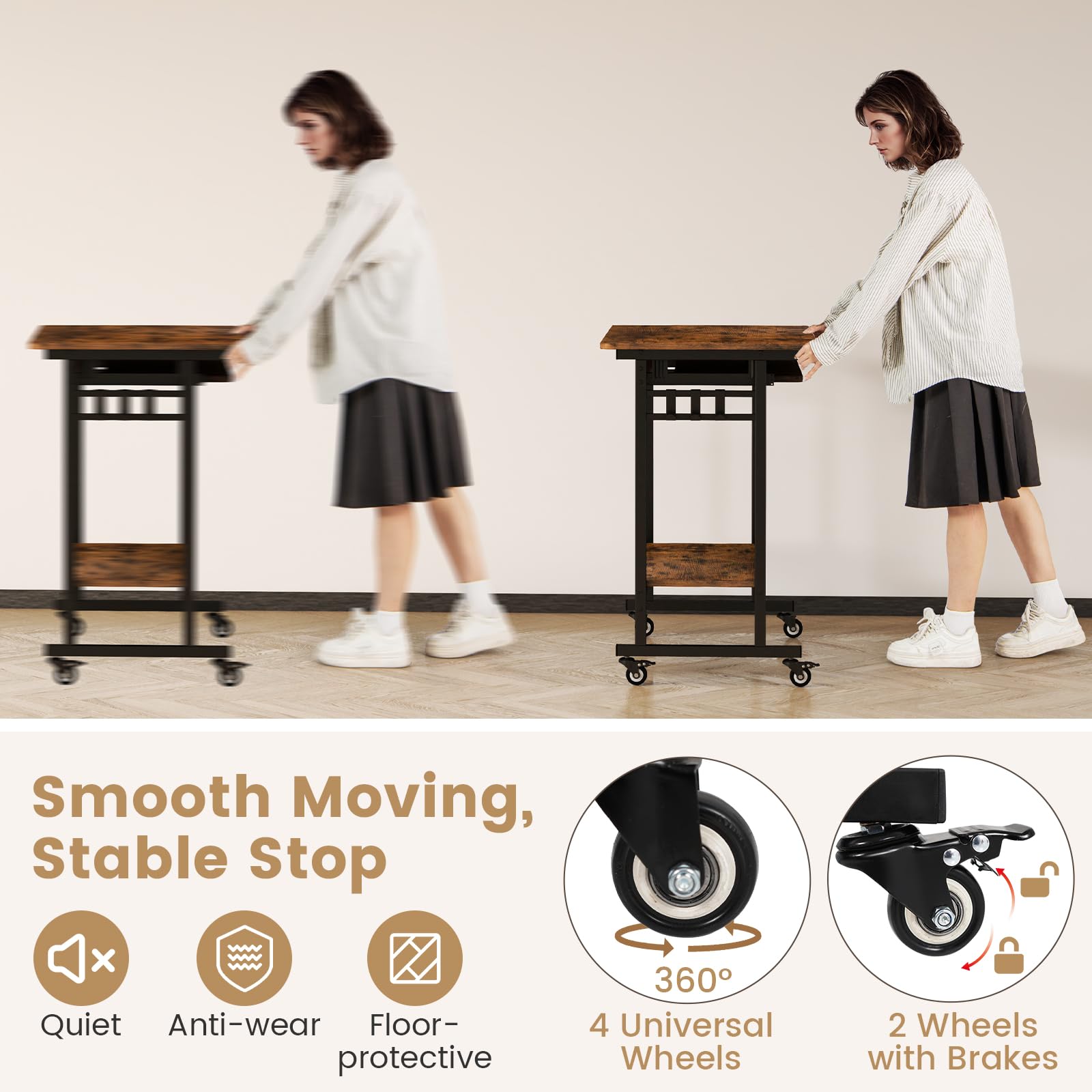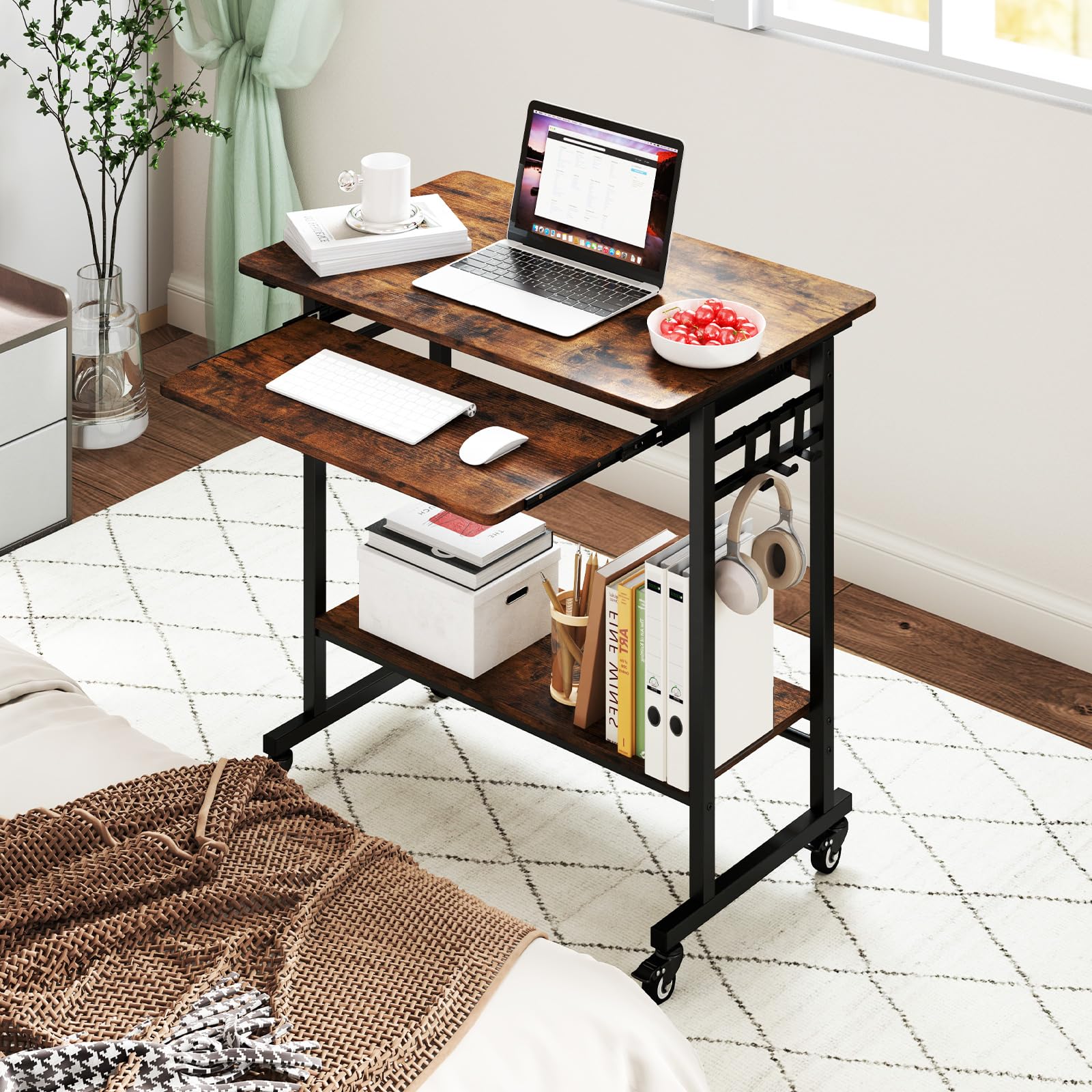 Introducing the ultimate companion of productivity - the rolling computer desk! Get ready for the efficient workflow, as the home office desk offers roomy workspace from a wide desktop & a keyboard tray. But that’s not all! It also has an open shelf & 3 hanging hooks for added storage. With lockable universal wheels, the computer cart for small space can accompany you wherever inspiration strikes in the house. Its metal frame boasts perfect welding & offers a large desktop load capacity of 160 lbs, which ensures high strength & durability. Embark on a transformative journey of productivity today!