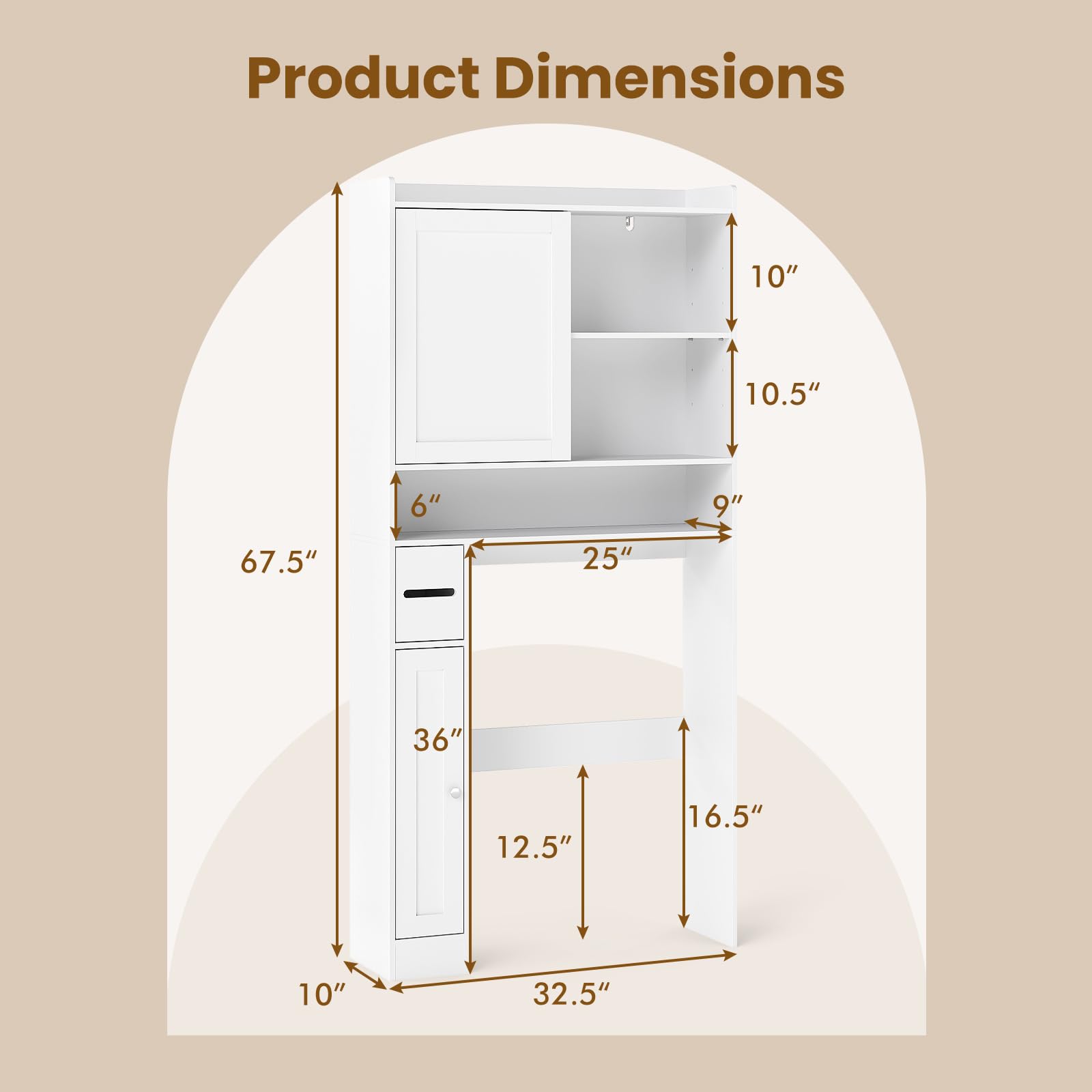 Our over-the-toilet rack has 1 top shelf, 1 single door cabinet, 1 toilet paper holder, and 1 bottom cabinet to store lots of sundries, which can keep your bathroom neatly organized. The active shelves behind the doors are adjustable in 3 positions or 5 positions, making it suitable for sundries of different heights. Moreover, it comes with a sliding door to help you find the stored items. Thanks to the solid frame and anti-toppling design, it can remain steady and reliably stable. Plus, the reinforced crossbar is included for greater strength. The toilet shelf fits neatly over standard toilets to save limited space.