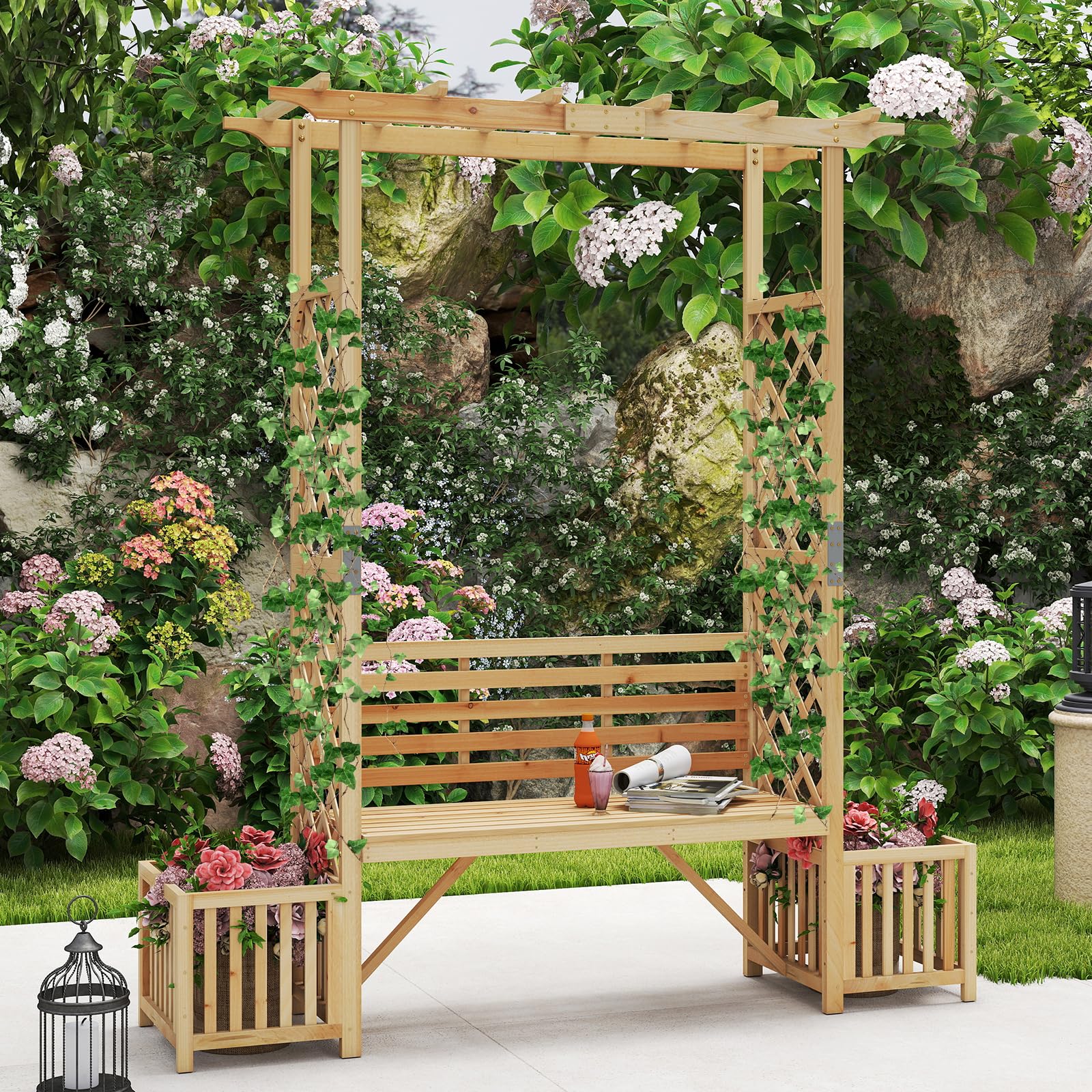 This garden arbor with bench combines planting functionality and seating convenience. Designed with side trellises, hanging roof with extended design and 2 open-ended planter boxes, this outdoor pergola provides sufficient decorative space, not only for climbing plants and vines, but also for flowers, party decorations and wedding tulle. Its solid wood frame features natural texture, adding a touch of rustic charm to your living space. Additionally, it is equipped with a 2-people seating area, perfect for intimate conversations. The overall structure is sturdy enough to hold 660 lbs, supported by firm legs and stable triangular construction.