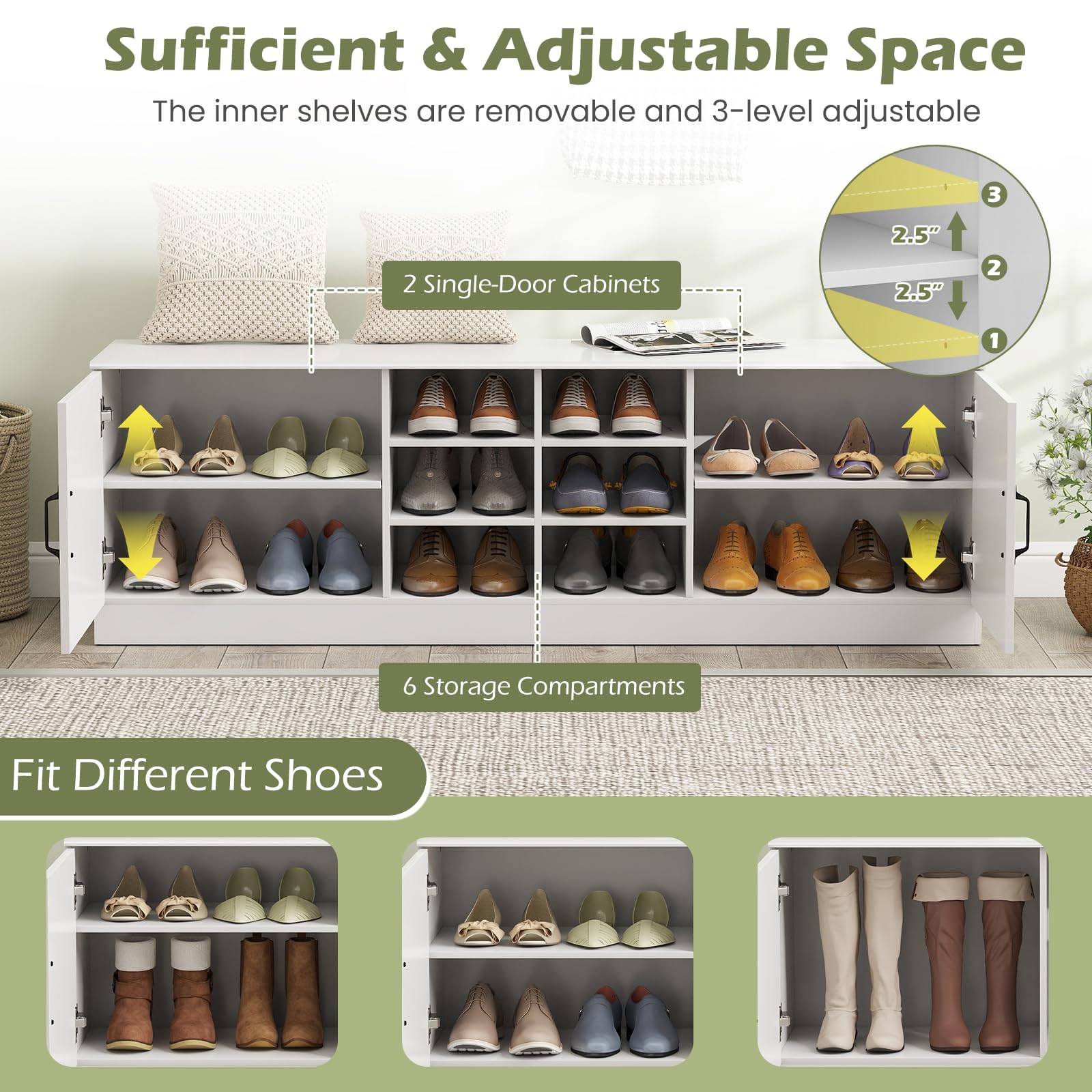 Adjustable and removable shelves fit shoes of different heights
