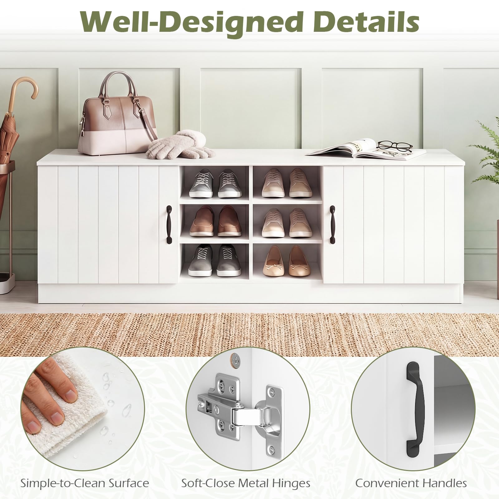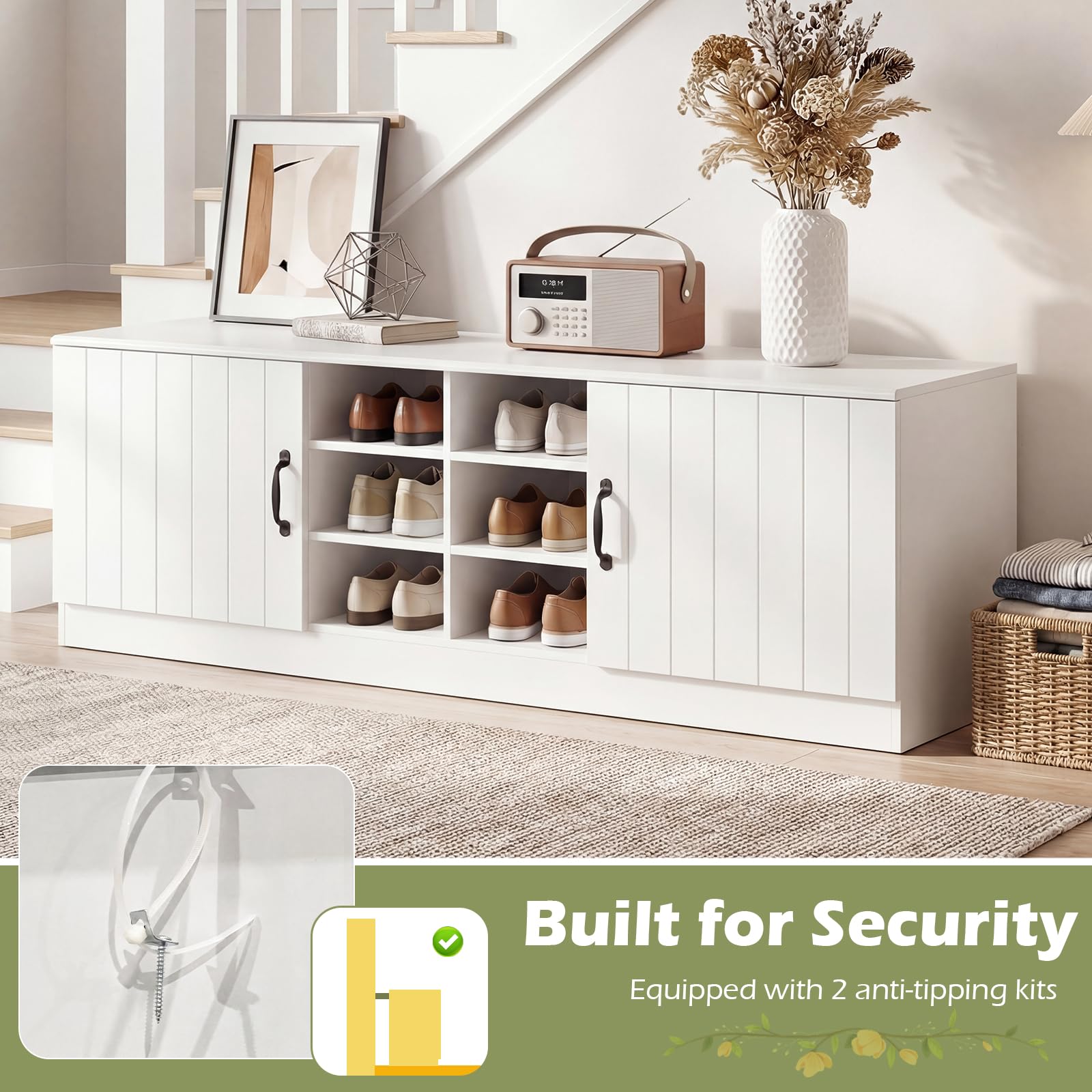 The top supports up to 300 lbs, allowing you to sit comfortably while putting on shoes. The inner shelves are removable and 3-level adjustable, adapting to shoes of different heights. Built with safety in mind, it includes anti-tip hardware for secure wall anchoring. Its smooth, easy-clean surface and contemporary look fit perfectly in entryways, bedrooms, or living rooms. This shoe organizer with well-designed details is a smart, stable solution that keeps clutter out of sight and seating always ready.