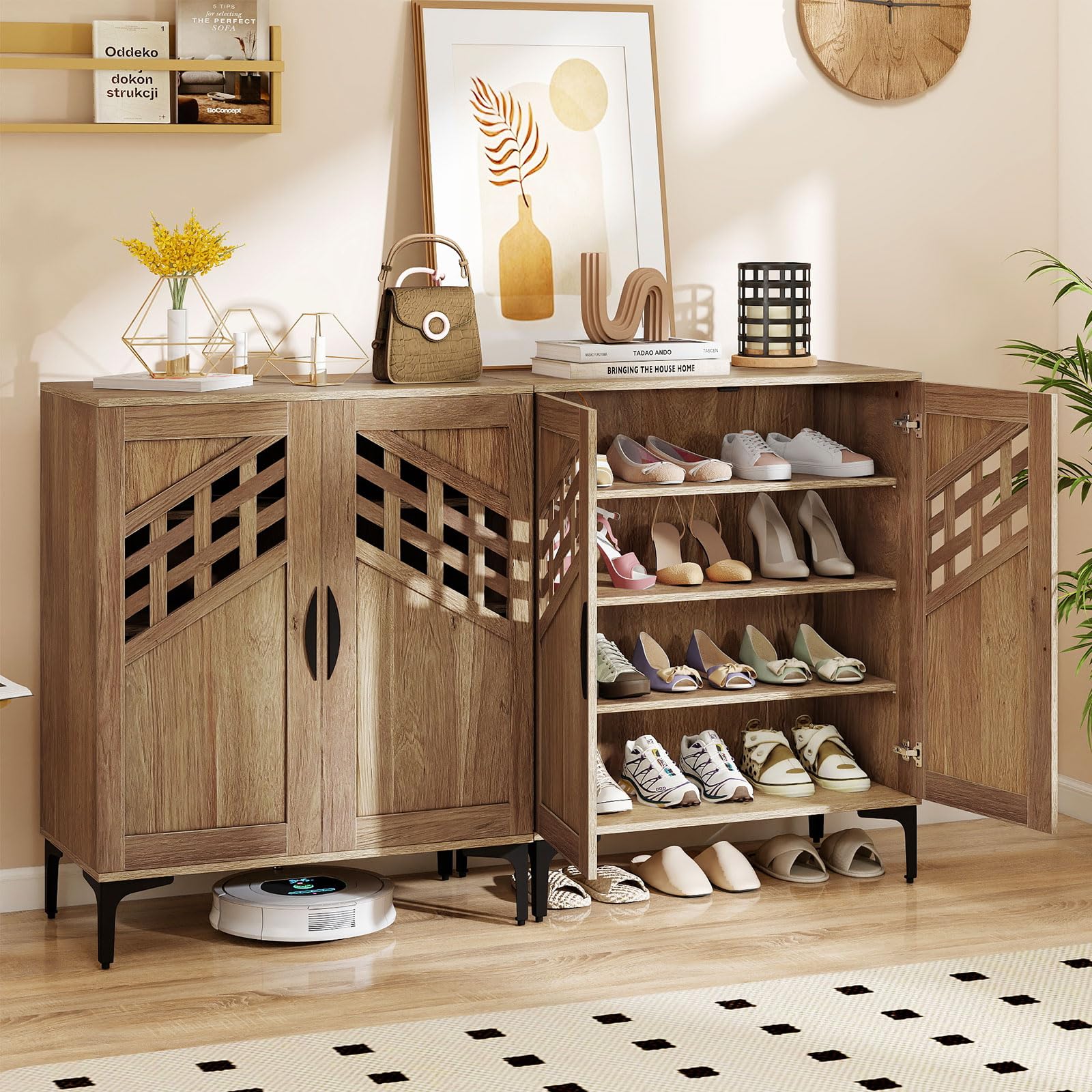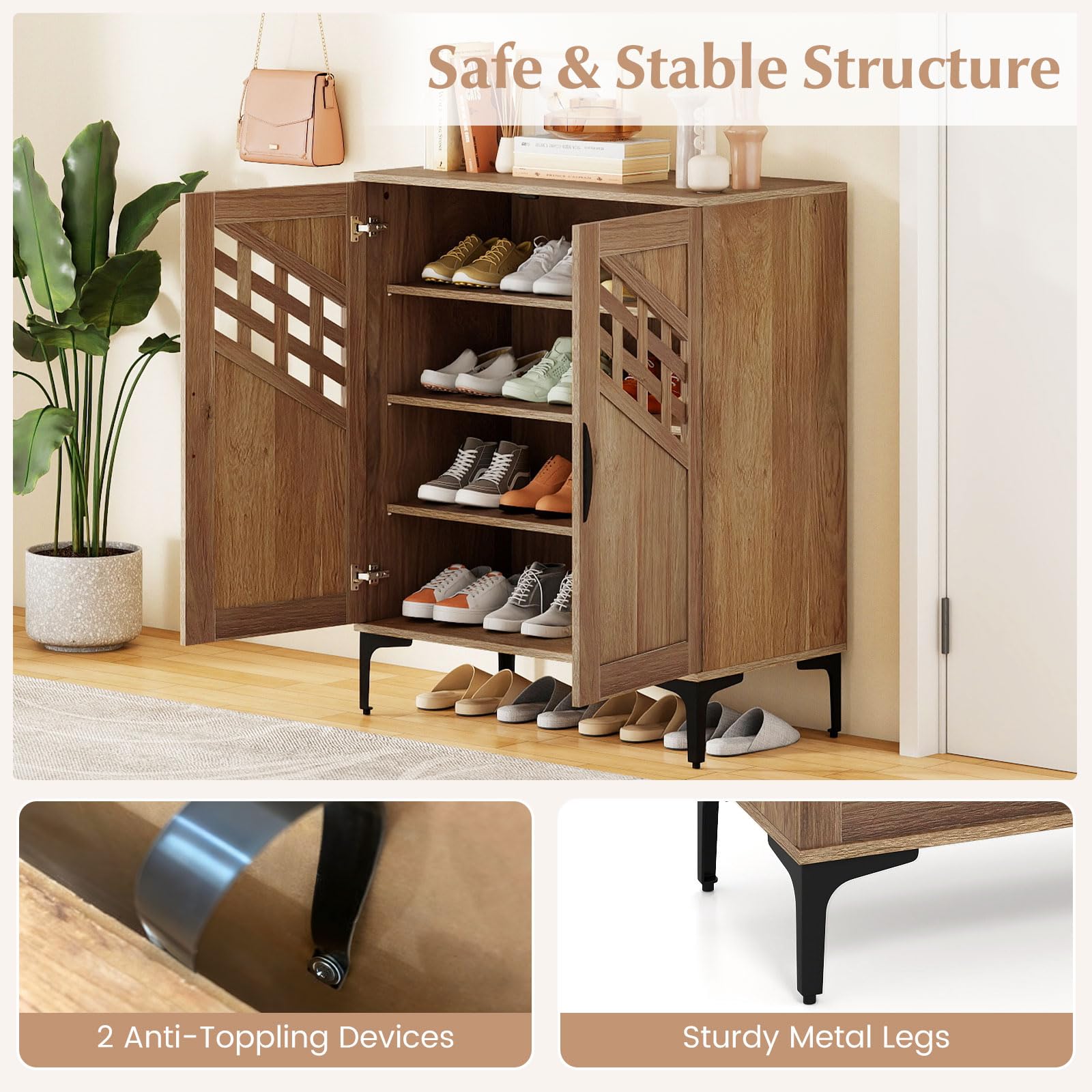 This wooden shoe rack organizer combines timeless charm with practical design, making it a stylish and functional addition from your entryway to the bedroom. Featuring 3 removable shelves, the wooden storage cabinet holds various shoes, while the open top shelf offers additional storage space. Supported by stable metal legs, this shoe cabinet can be secured to the wall with dual anti-toppling devices for added safety. Attention to user convenience is evident in the easy-grip handles and sturdy metal hinges.
