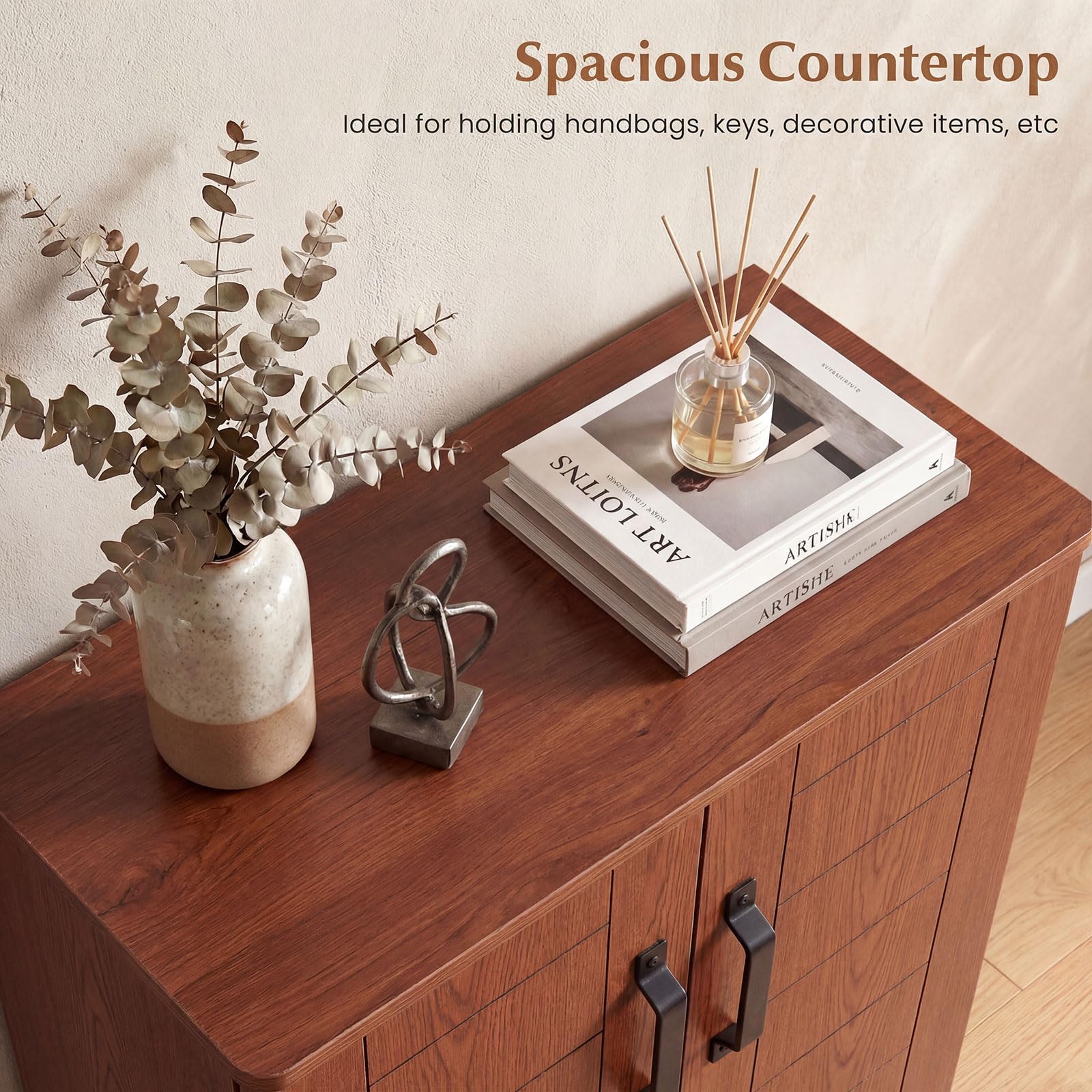 Spacious countertop ideal for handbags, keys, and decorative items