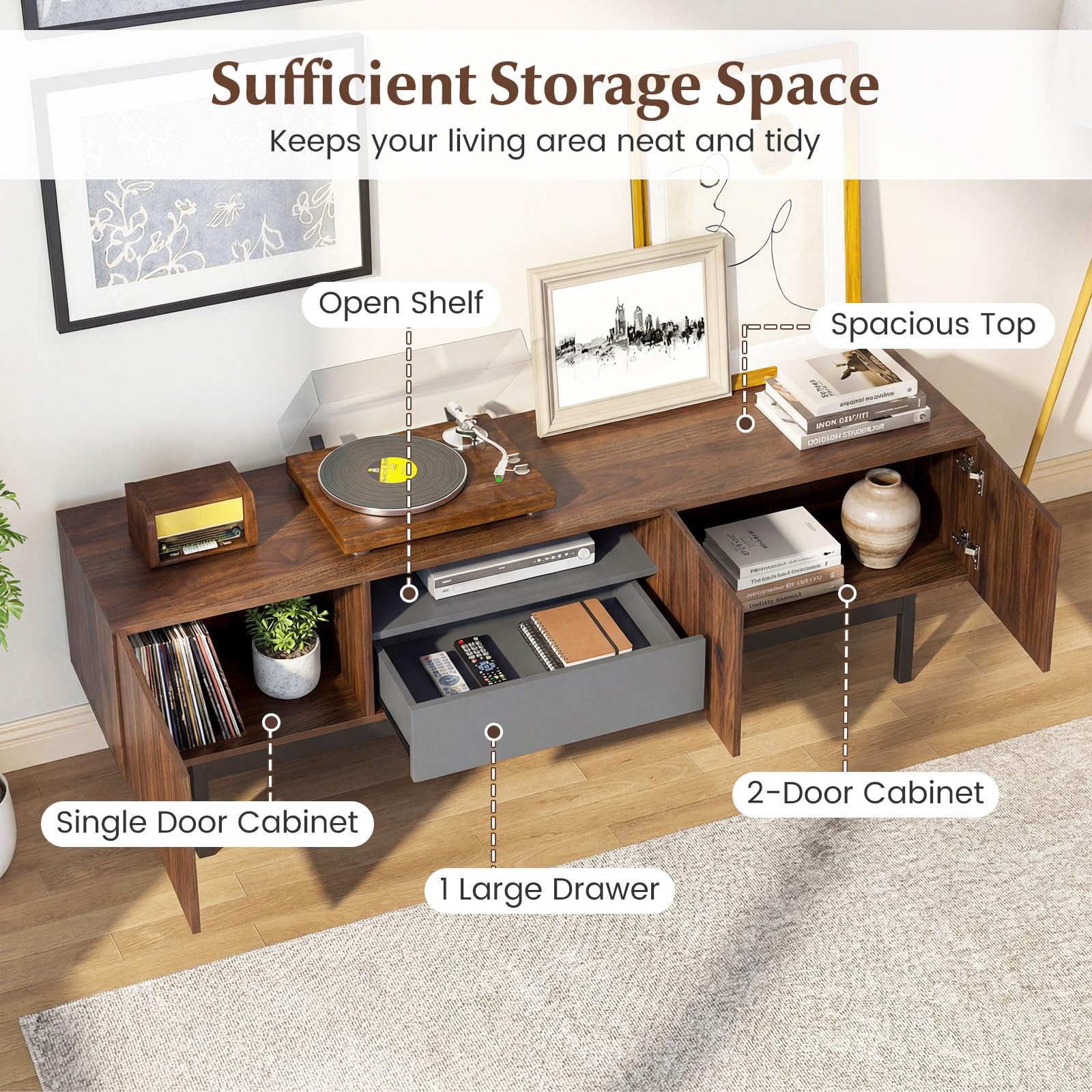 Combining mid-century style with modern functionality, this entertainment center offers versatile storage options to keep your space organized and stylish. It features a spacious top, a drawer, an open shelf, a single-door cabinet and a two-door cabinet, providing ample room for media devices, gaming consoles, DVDs, and other accessories. The built-in cable hole helps maintain a clutter-free appearance by keeping cords neatly tucked away. Elevated on 6.5” metal legs, this media console table ensures great stability while allowing for easy floor cleaning underneath. Whether for casual viewing or social gatherings, this entertainment center supports both comfort and style in your home.