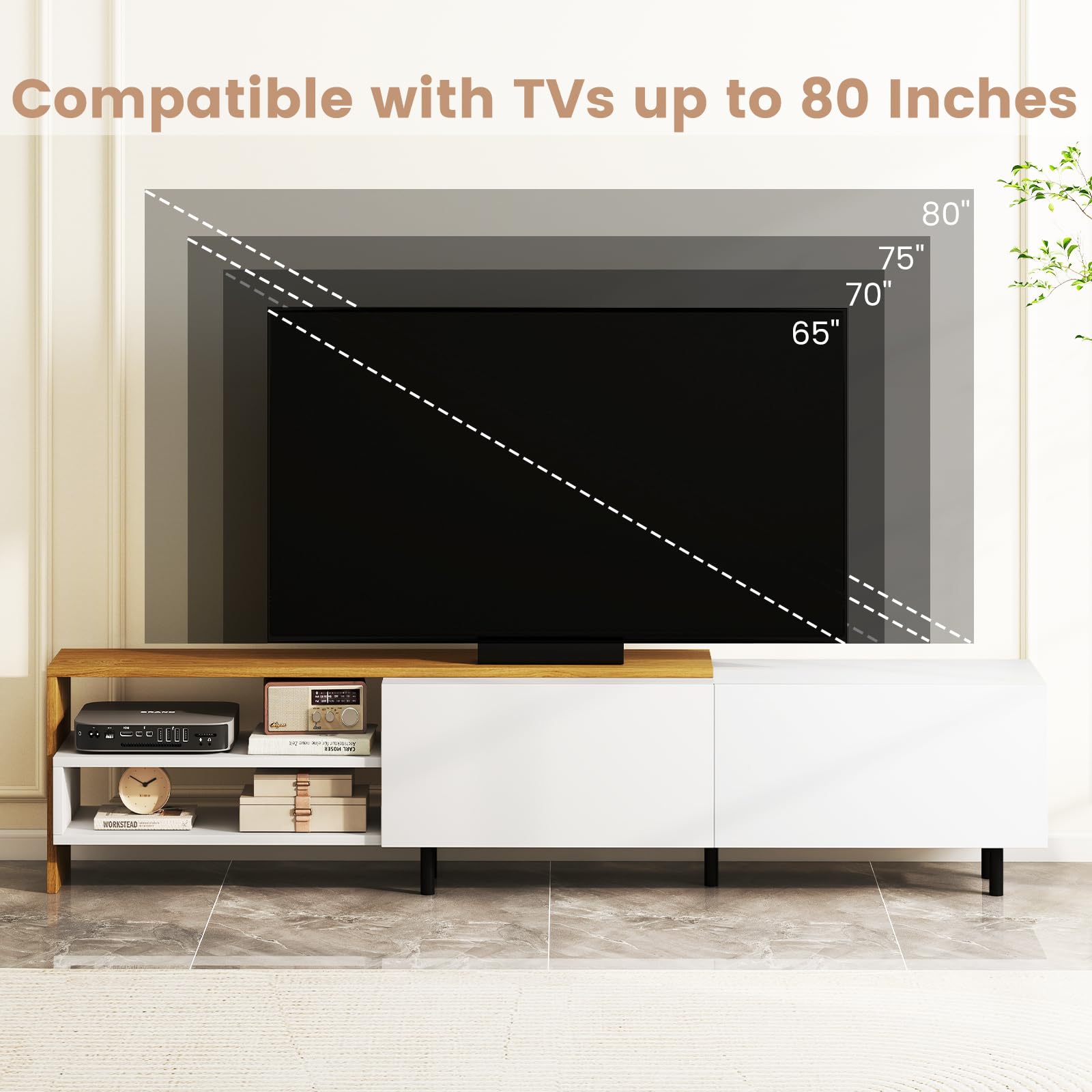 Elevate your entertainment space with the 71.5" long TV stand. Perfect for TVs up to 80 inches, this stylish unit offers ample storage with 2 open shelves and 2 cabinets, keeping clutter at bay. Strong metal legs and a sturdy countertop can support up to 121 lbs, making it versatile for various uses. Its modern design, complete with discreet screw hole covers, seamlessly fits into any room decorations. The great sturdiness of the stand ensures optimal stability, whether you place your DVD players, soundbars, or gaming consoles on it. You can also store your magazines in the cabinets, keeping everything neatly organized. Enjoy user-friendly features like easy-to-clean surfaces, adjustable hinges, and protective foot pads.