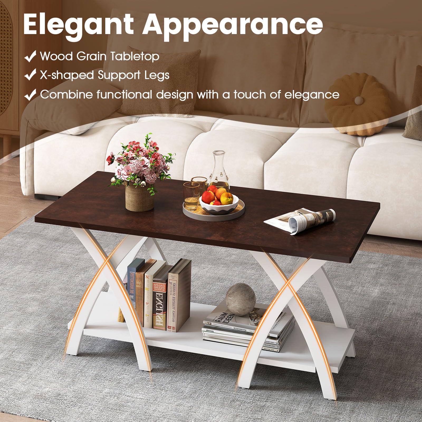 Crafted from solid rubber wood for durability, this table features a spacious tabletop and an additional shelf below, offering ample storage for all your essentials, from books to laptops. The wood grain finish and X-shaped support legs not only provide stability but also enhance the aesthetic, seamlessly incorporating a touch of elegance into your space. With thoughtful details such as elevated design, non-slip foot pads, and rounded corners, this versatile coffee table is ideal for dining, working, or socializing, making it a must-have in any modern living area.