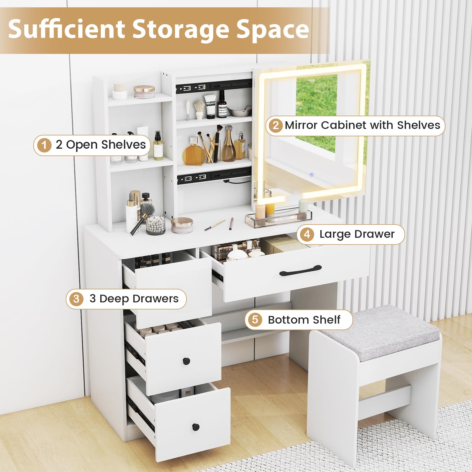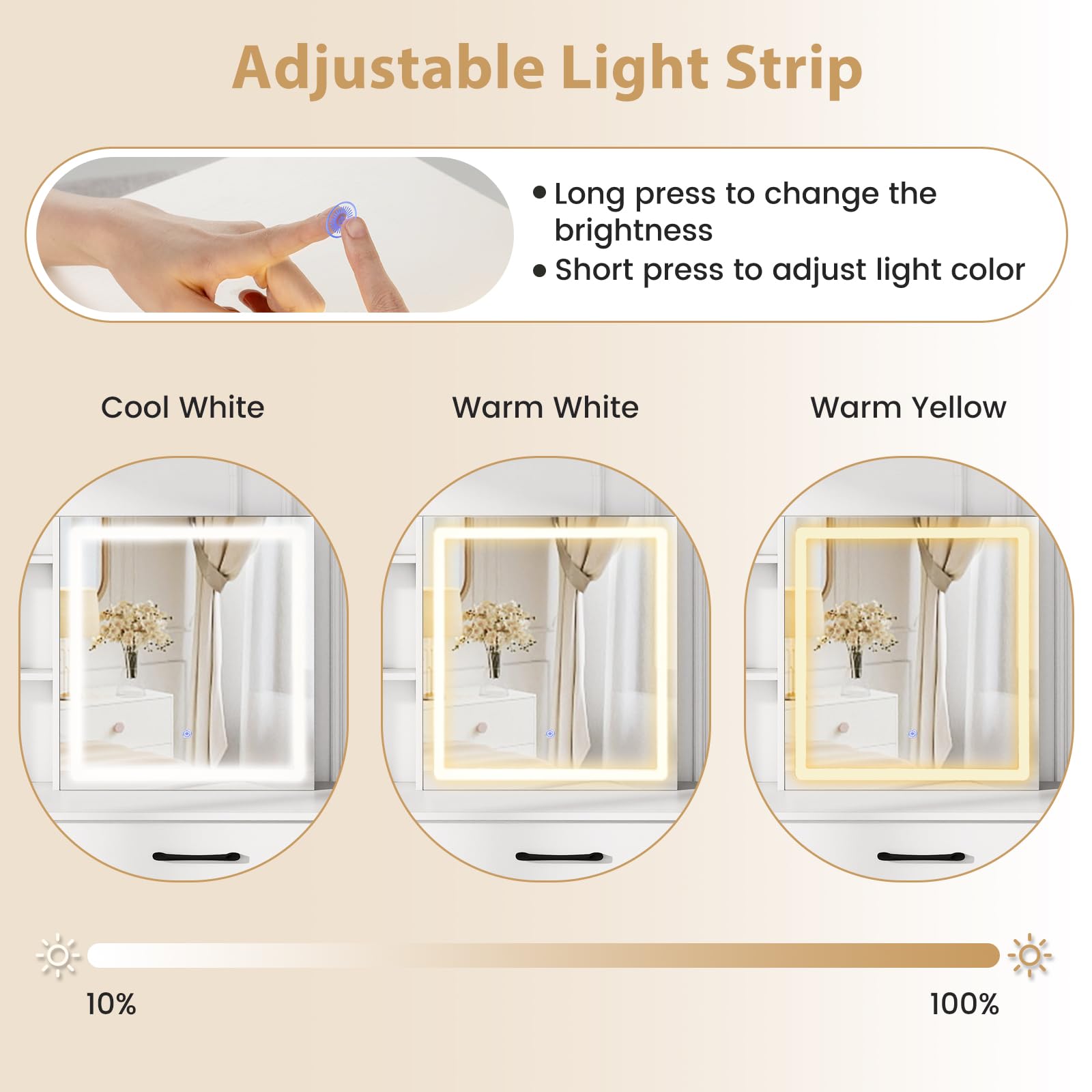 Elevate your dressing space with this stylish vanity table and stool set. The lighted mirror features 3 color modes with adjustable brightness, while the smooth-gliding sliding mirror reveals hidden storage for your beauty essentials. Ample drawers and shelves help keep your space organized and clutter-free. Built for daily use, the table includes anti-toppling devices, smooth rounded edges, and metal drawer slides for durability. Its minimalist design adds a clean, elegant touch to any bedroom or dressing area.