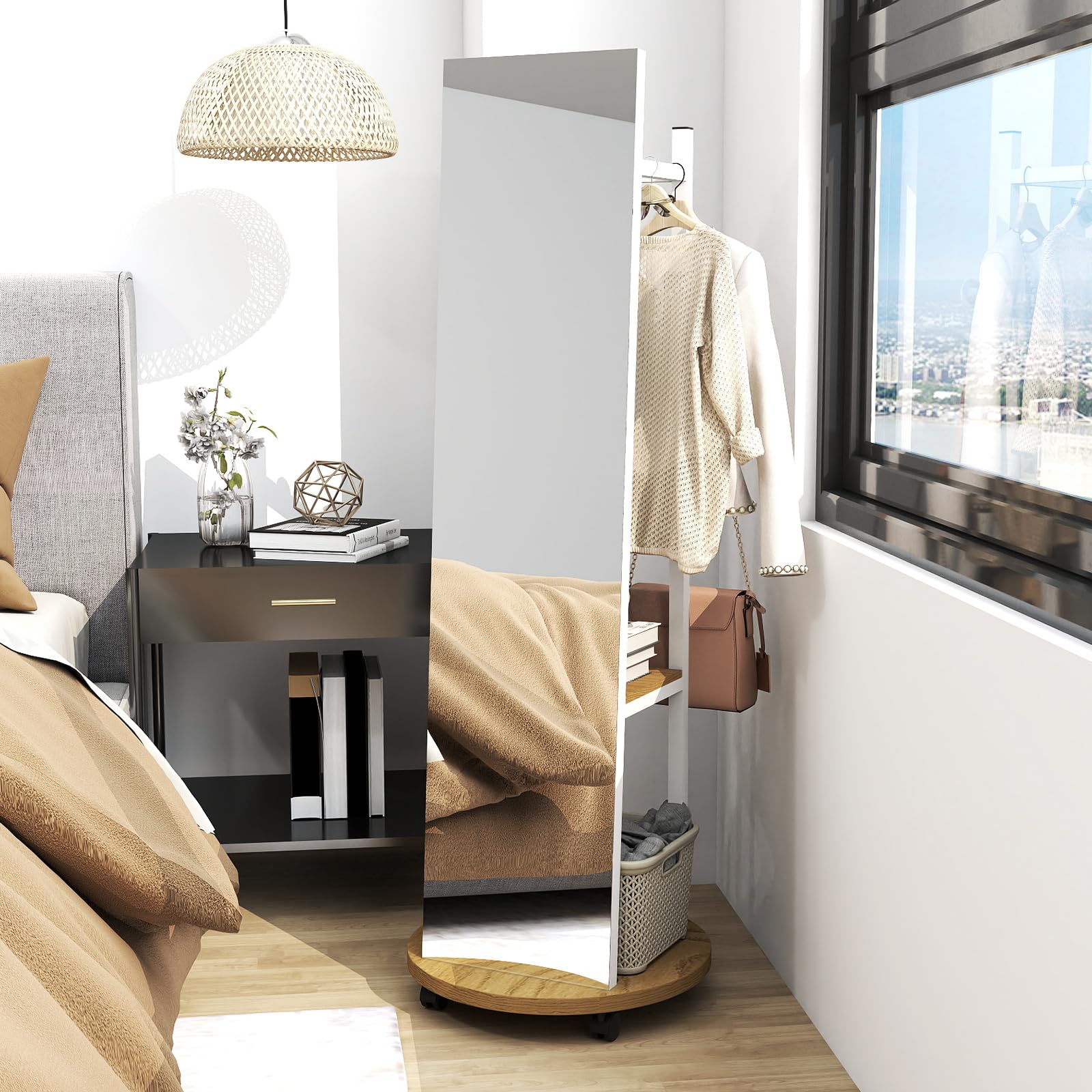 Upgrade your daily routine with this multifunctional full length mirror with coat rack. The HD mirror features explosion-proof film for a safe, full view of your outfit. Freestanding design includes hanging rods, 3 hooks, and 2 storage shelves to keep coats, hats, bags, shoes, and accessories organized in one convenient location. Move it effortlessly with 4 universal wheels, 2 of which lock for stability. The sturdy metal frame ensures long-lasting durability. Perfect for bedrooms, closets, or entryways.