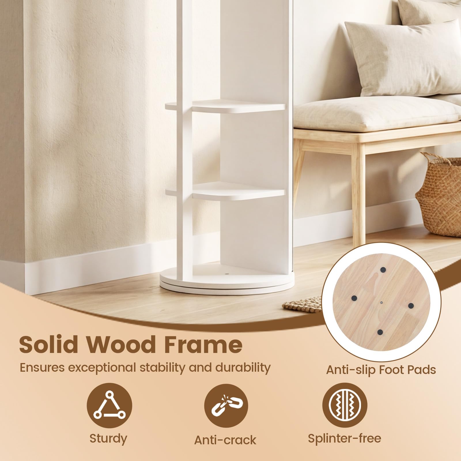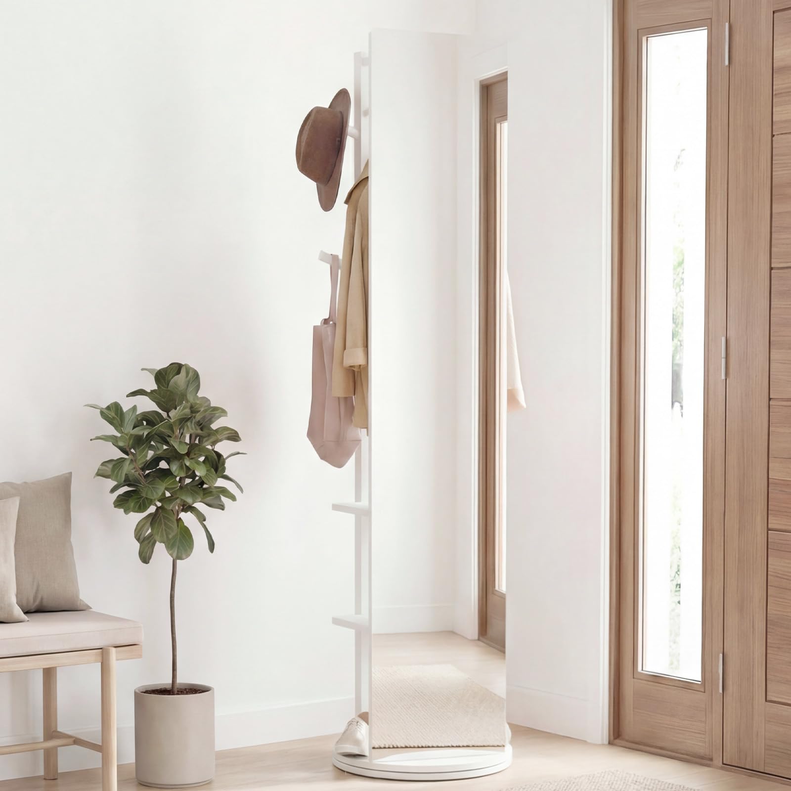 Upgrade your home organization with this 3-in-1 full-length mirror coat rack. Designed to combine a swivel standing mirror, coat rack and storage shelves, it offers a clear, distortion-free reflection while keeping your daily essentials neatly organized. The solid wood frame delivers reliable stability and durability, complemented by a white finish that blends effortlessly into bedrooms, living rooms, closets or entryways. Thoughtfully designed with anti-slip foot pads and smooth, splinter-free edges, this floor standing mirror ensures both safety and everyday comfort.