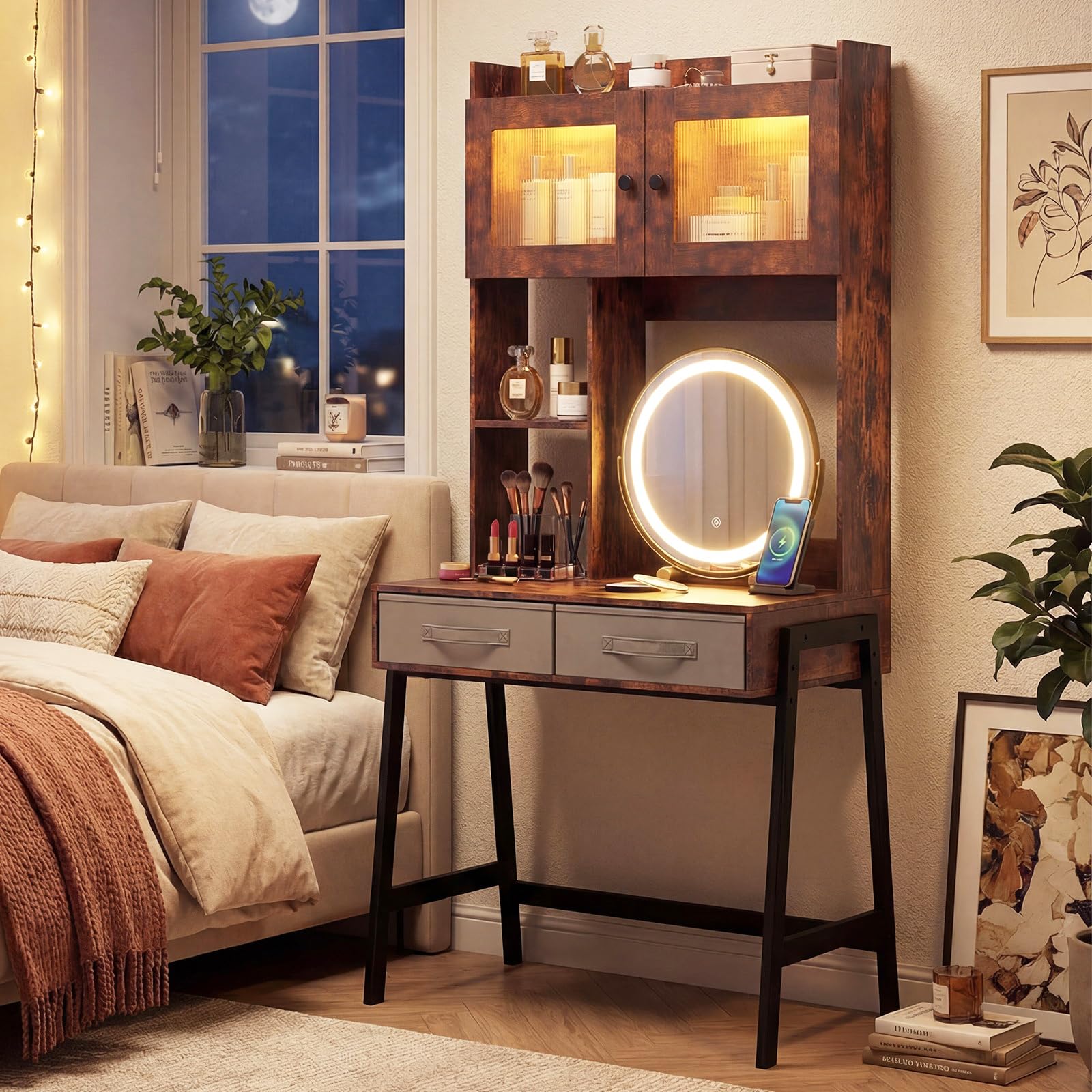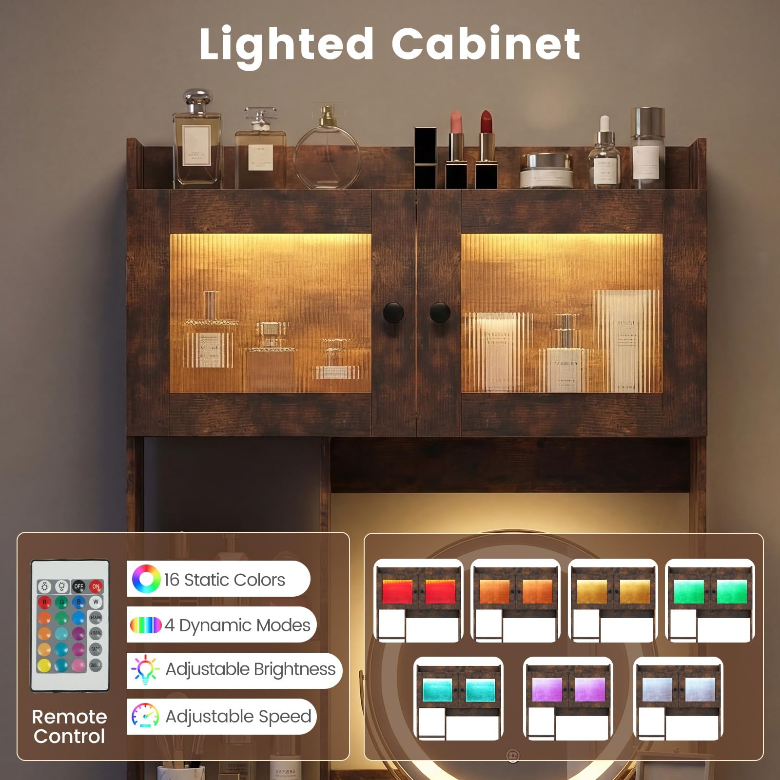 Upgrade your bedroom or dressing space with this modern makeup vanity desk. The 360° rotatable lighted mirror lets you adjust color temperature and brightness for flawless makeup or hair styling. The RGB lighted cabinet adds a chic touch while displaying perfumes and skincare. With a spacious tabletop, open shelves, and 2 fabric drawers, your essentials stay organized and within reach. A built-in charging station powers beauty tools and devices for a smoother daily routine. The metal frame, anti-slip pads, and anti-toppling kit ensure stability and safety for long-term use.