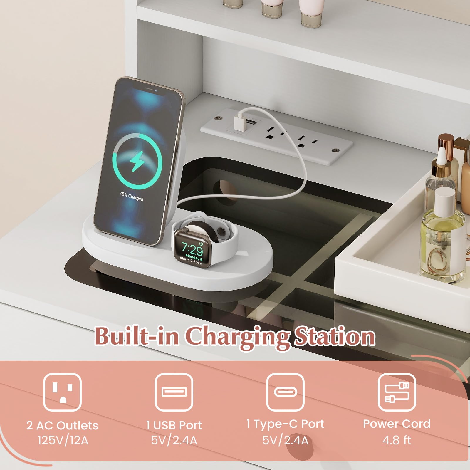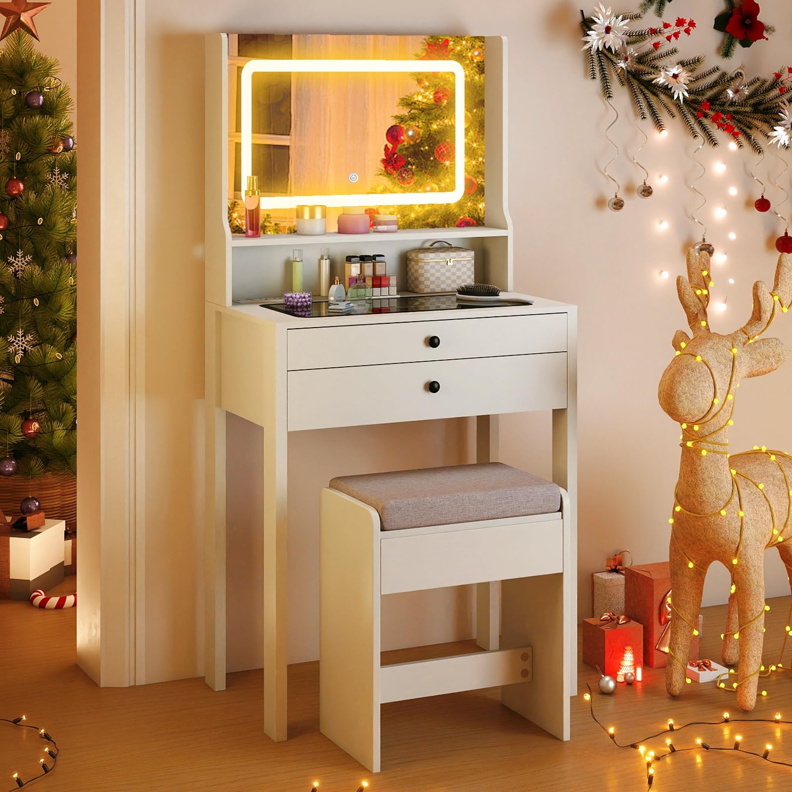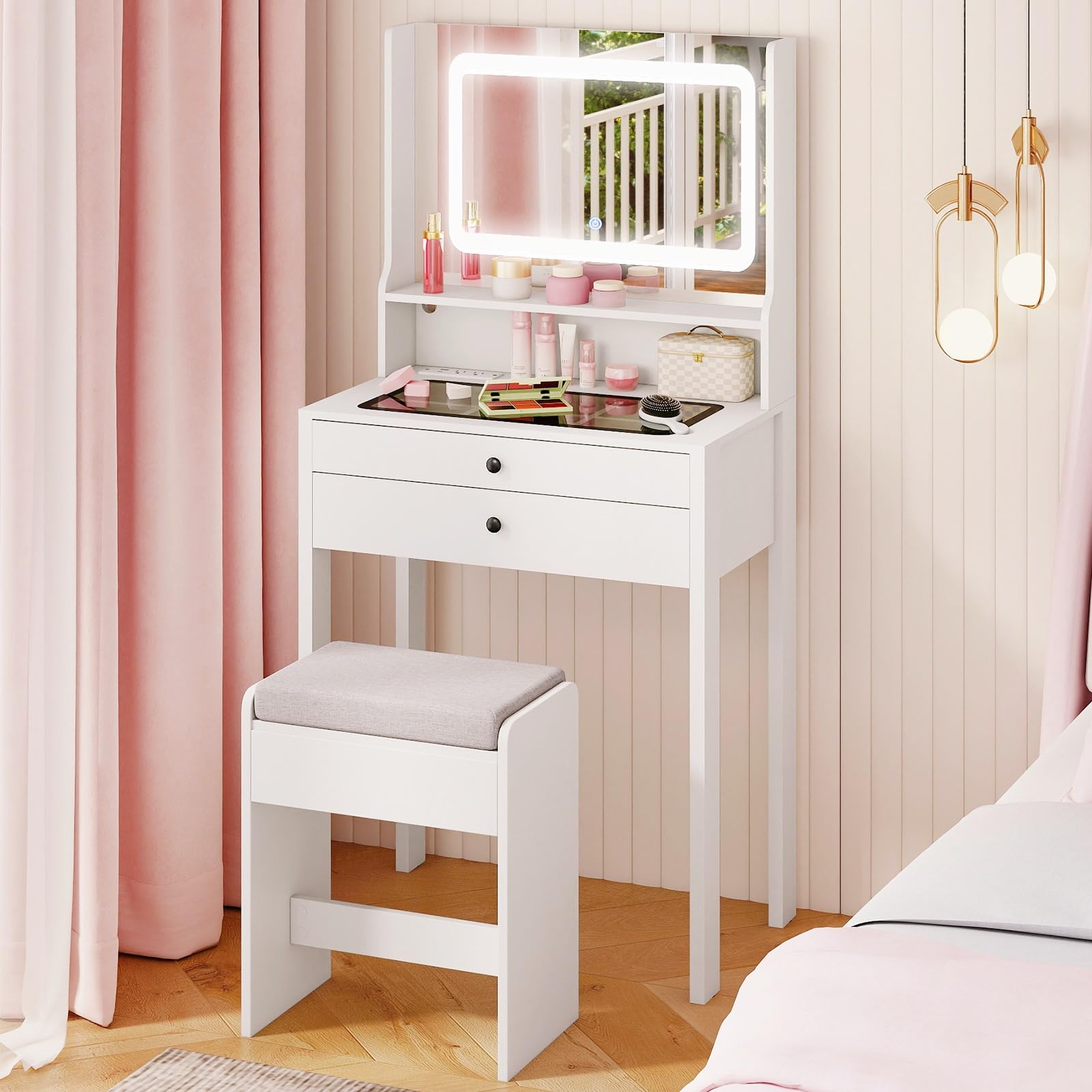 Perfect for small spaces, this compact vanity set combines style and functionality. The lighted mirror offers 3 color modes with adjustable brightness, while the built-in charging station keeps your devices and styling tools powered. Two drawers, an open shelf, and a glass-top desktop provide organized storage for cosmetics and accessories. Durable construction, anti-toppling devices, and a cushioned stool ensure safety and comfort. Ideal for bedrooms, apartments, or dorms.
