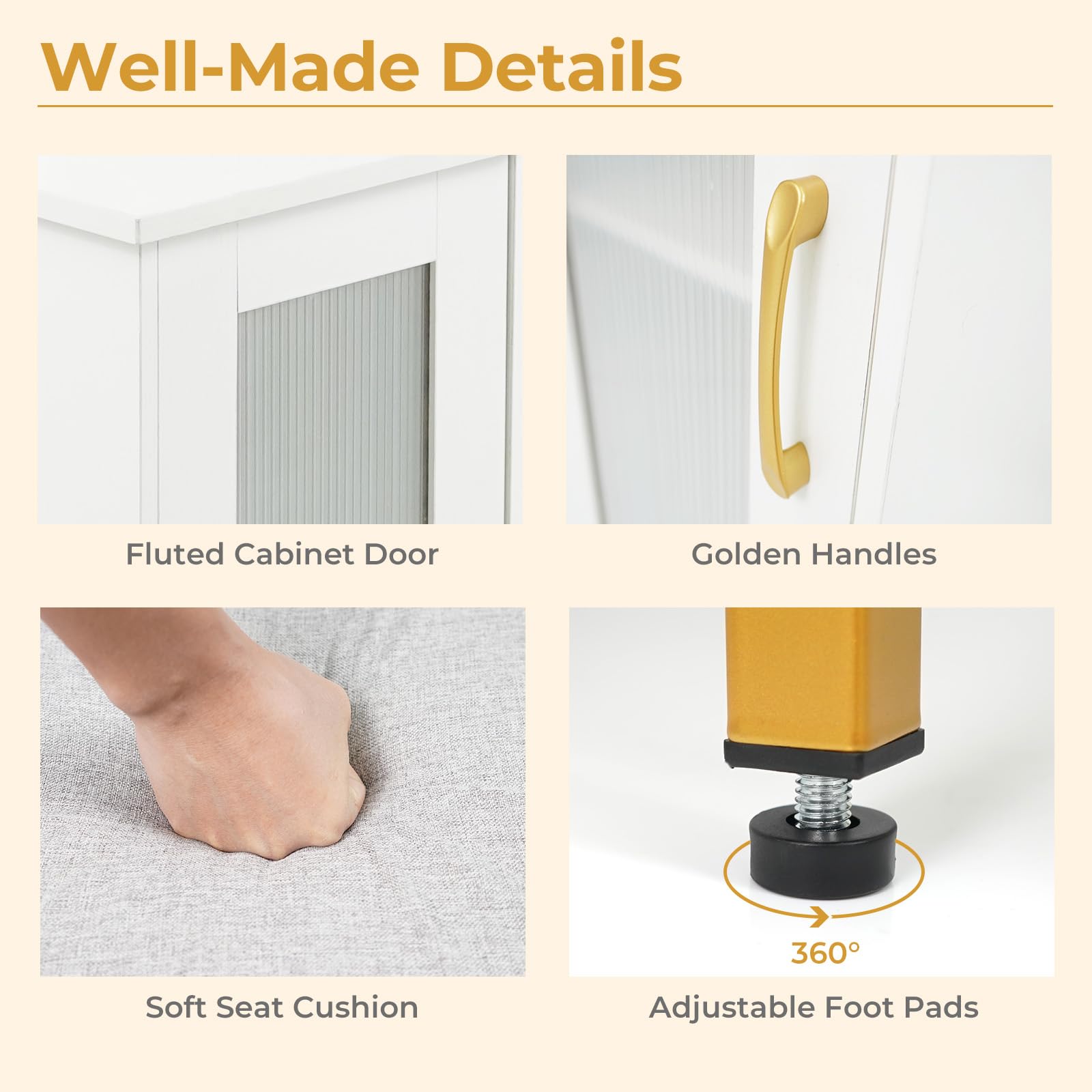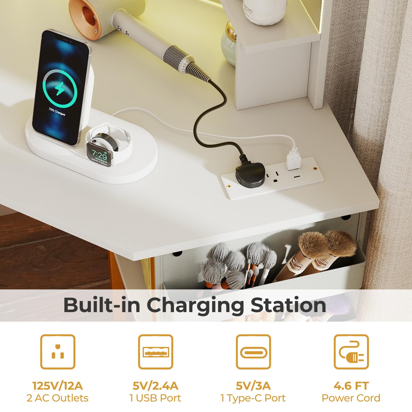Create a stylish and organized beauty corner with this space-saving corner vanity desk and stool set. The tri-fold lighted mirror offers 3 color lighting modes and adjustable brightness to suit your makeup and skincare needs. With multiple shelves, a cabinet with adjustable shelf, and a side storage bag, it provides ample room for cosmetics and accessories. The built-in charging station (2 AC outlets, USB, Type-C) keeps devices and styling tools conveniently powered. Finished with gold-tone handles and a metal frame, this vanity set adds a touch of modern elegance to any bedroom or dressing room.