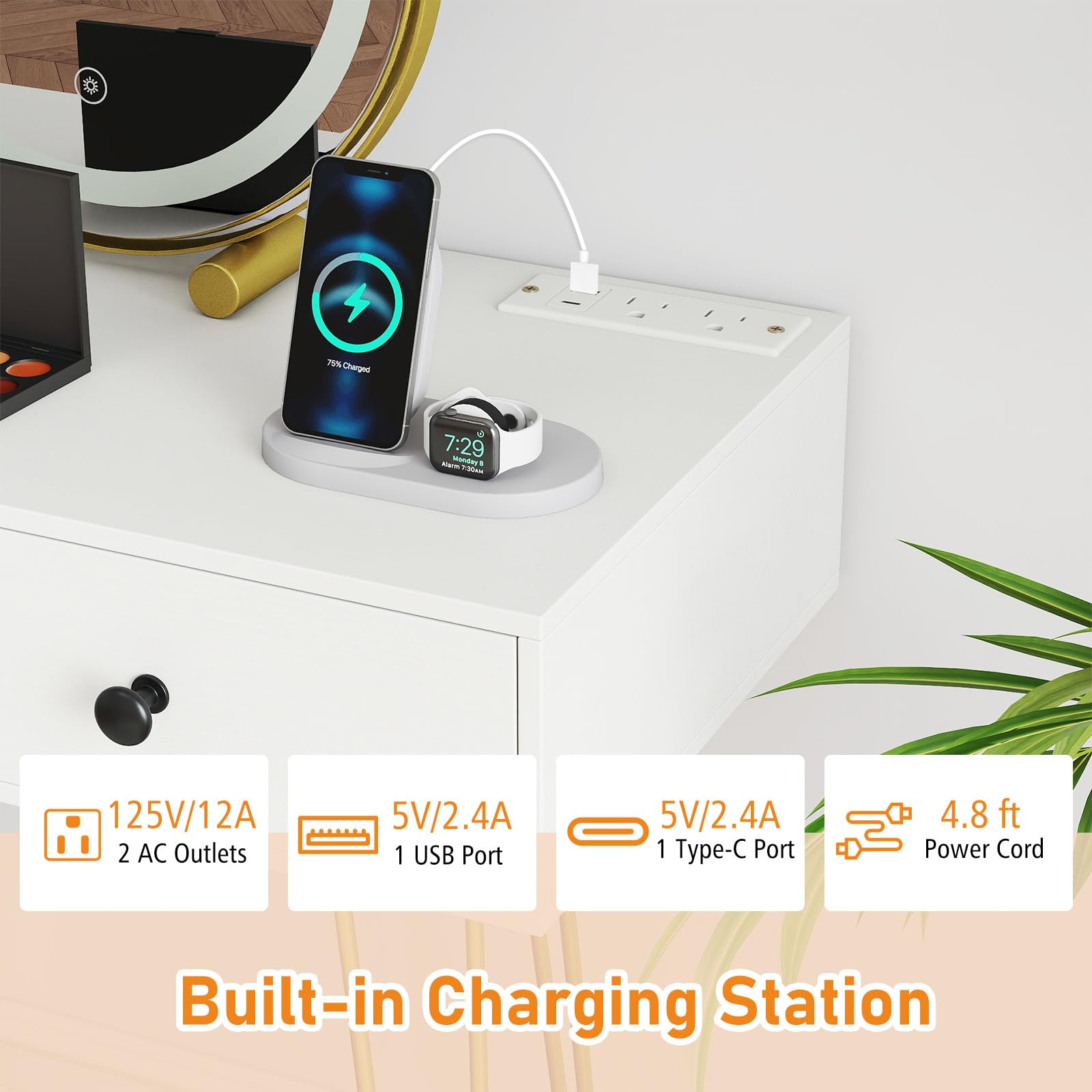 The include vanity mirror features 3 color lighting modes and adjustable brightness. The mirror's 360° free rotation lets you find the perfect angle every time. Equipped with built-in charging station, this vanity desk allows you to conveniently charge your phone, tablet, or styling devices while getting ready. Moreover, you can keep your space organized with a spacious desktop, open compartment, and 4 drawers. Golden metal legs provide strong support and a touch of elegance, making this makeup table set a statement piece in any bedroom or dressing area.
