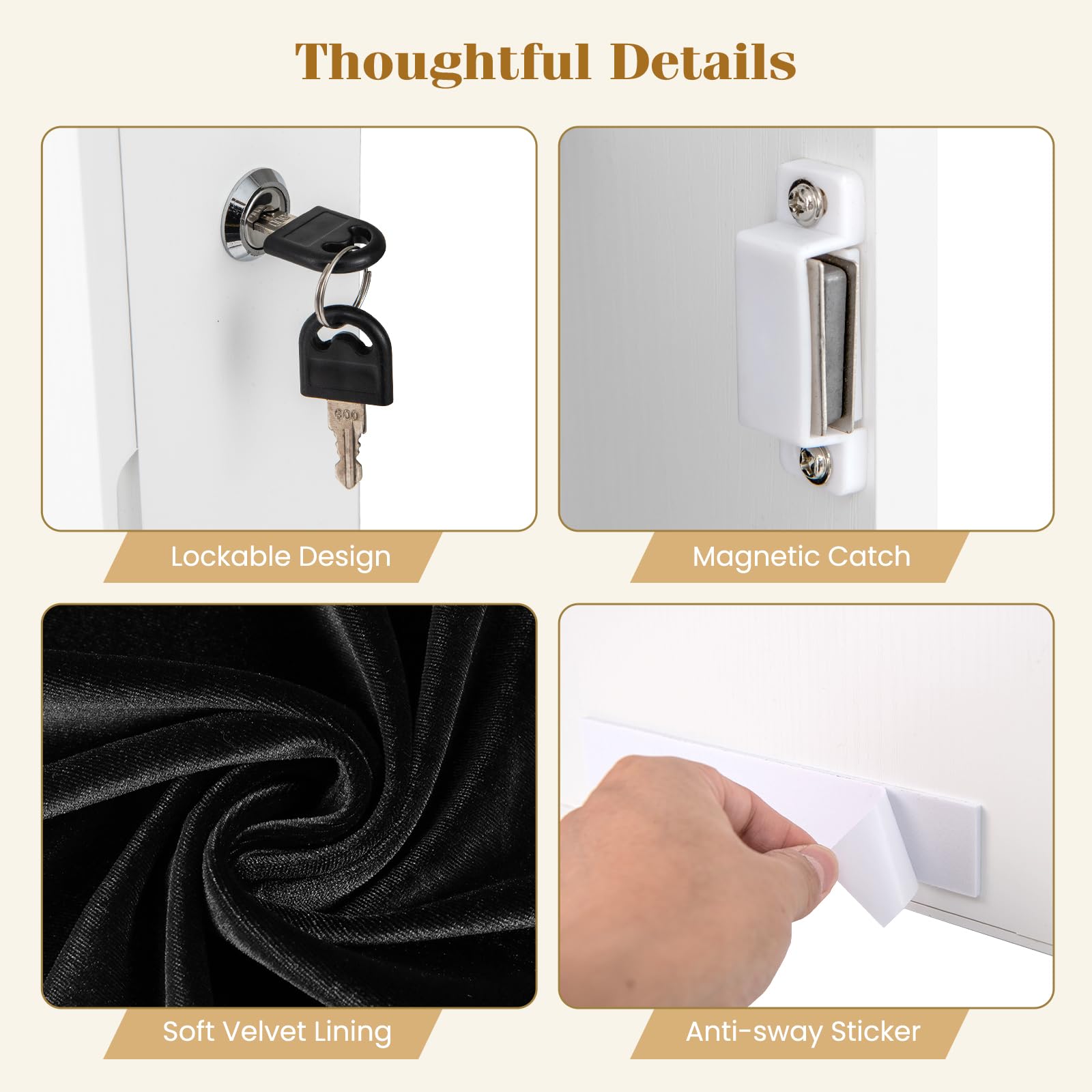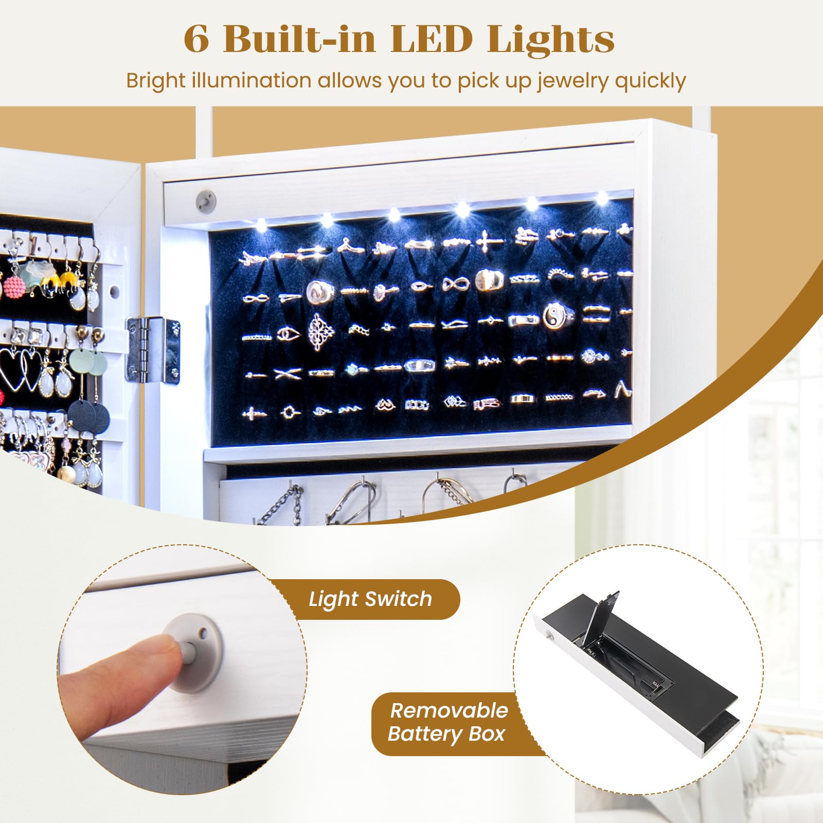 Keep your jewelry organized and ready to wear with this versatile mirrored jewelry cabinet. The lockable design and full-length mirror make it easy to try on jewelry and check your outfit. Inside, you'll find ample storage with dedicated spaces for earrings, rings, necklaces, bracelets, and more. Soft velvet lining protects your pieces from scratches, while magnetic catches keep the door securely closed. 6 bright LED lights illuminate your collection, and the cabinet can be wall-mounted or hung over a door to save space in any bedroom or closet.