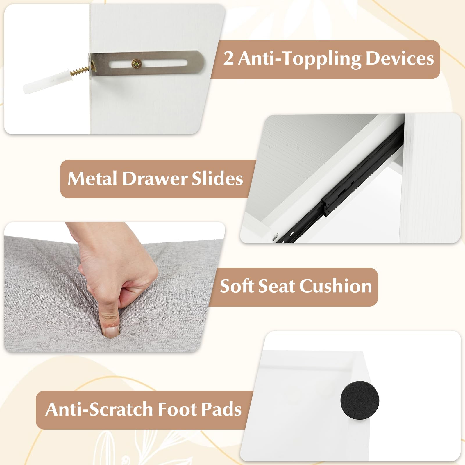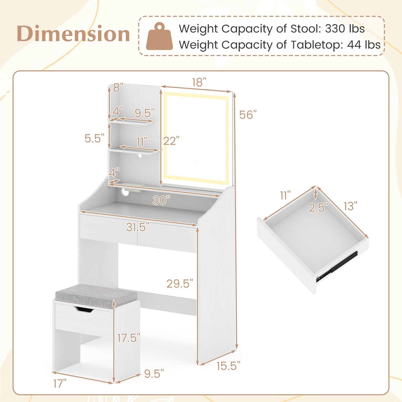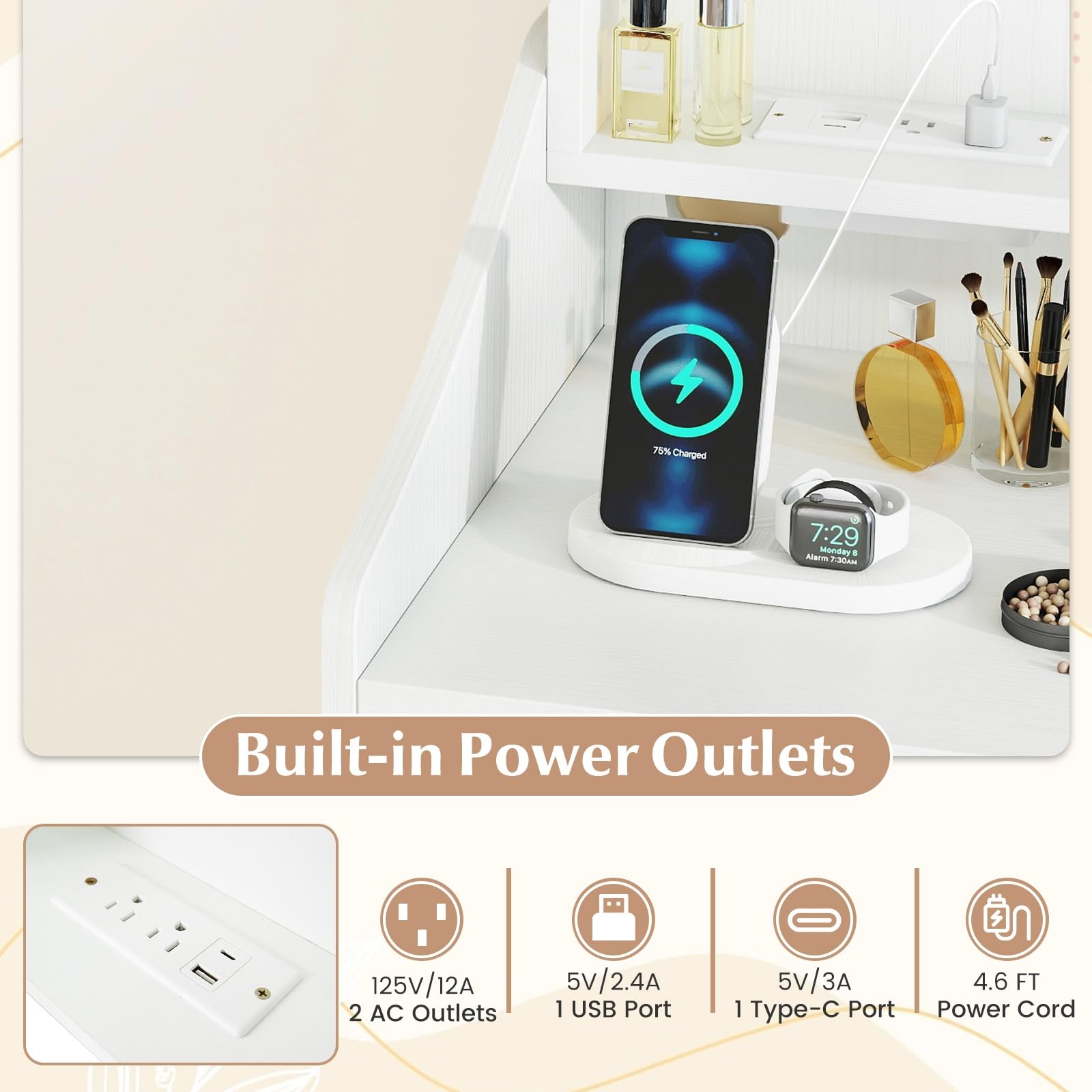 Create your perfect beauty space with this modern vanity desk and stool set. The LED mirror offers 3 adjustable lighting modes and customizable brightness for flawless makeup and skincare. Stay organized with 3 open shelves, 2 drawers, a spacious tabletop, and hidden storage under the stool. Built-in AC outlets, USB, and Type-C ports keep your devices and beauty tools charged. Sleek, compact, and stylish—ideal for bedrooms, apartments, or dressing areas.