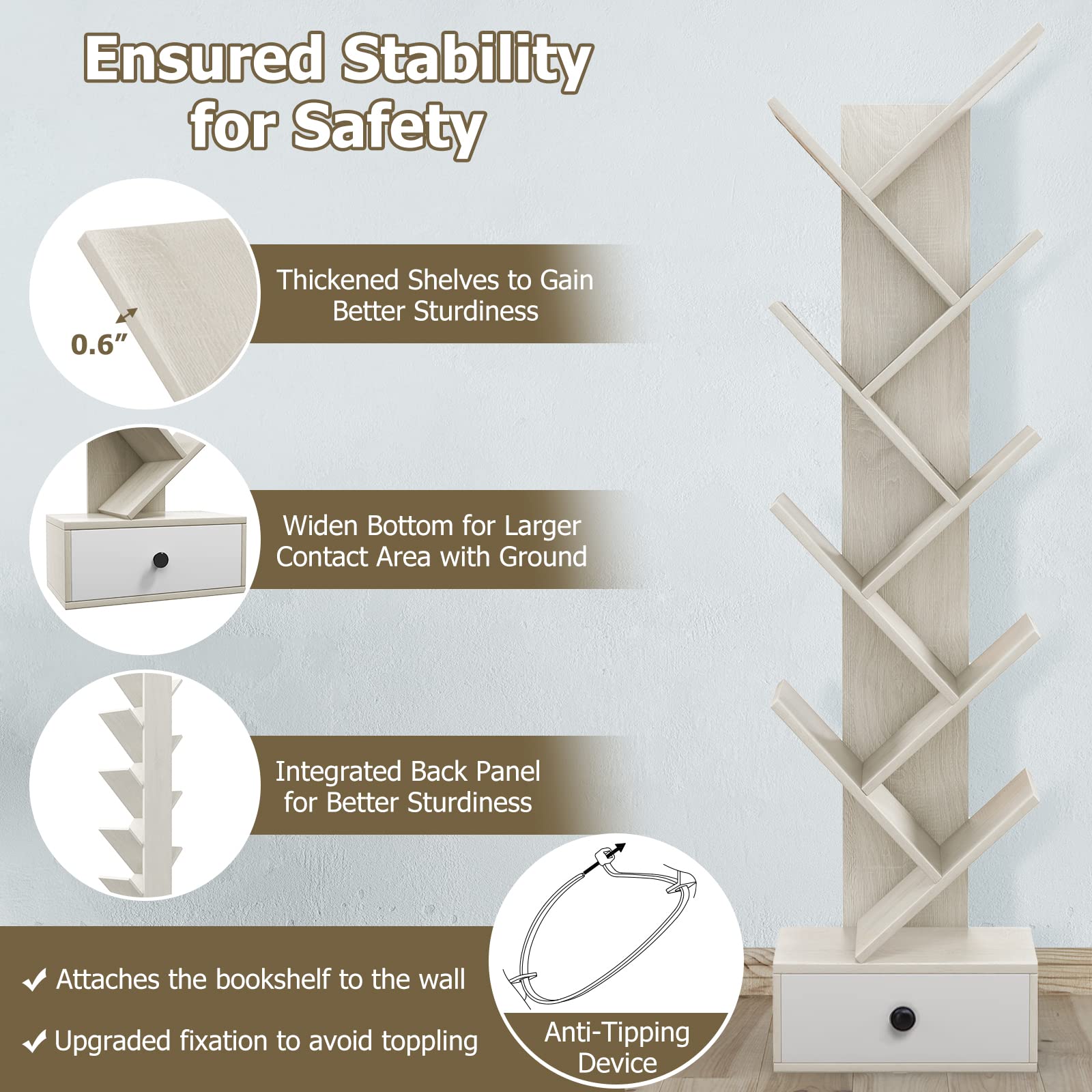 • Stable Frame & Anti-toppling Device: Our tree bookshelf features an integrated back panel to firmly connect 0.6" thick shelves. Thus, the entire structure becomes much stabler. Plus, it also comes with a wider base for a larger ground support area. Together with an anti-tipping kit at the top, sudden toppling or falling will be highly avoided.