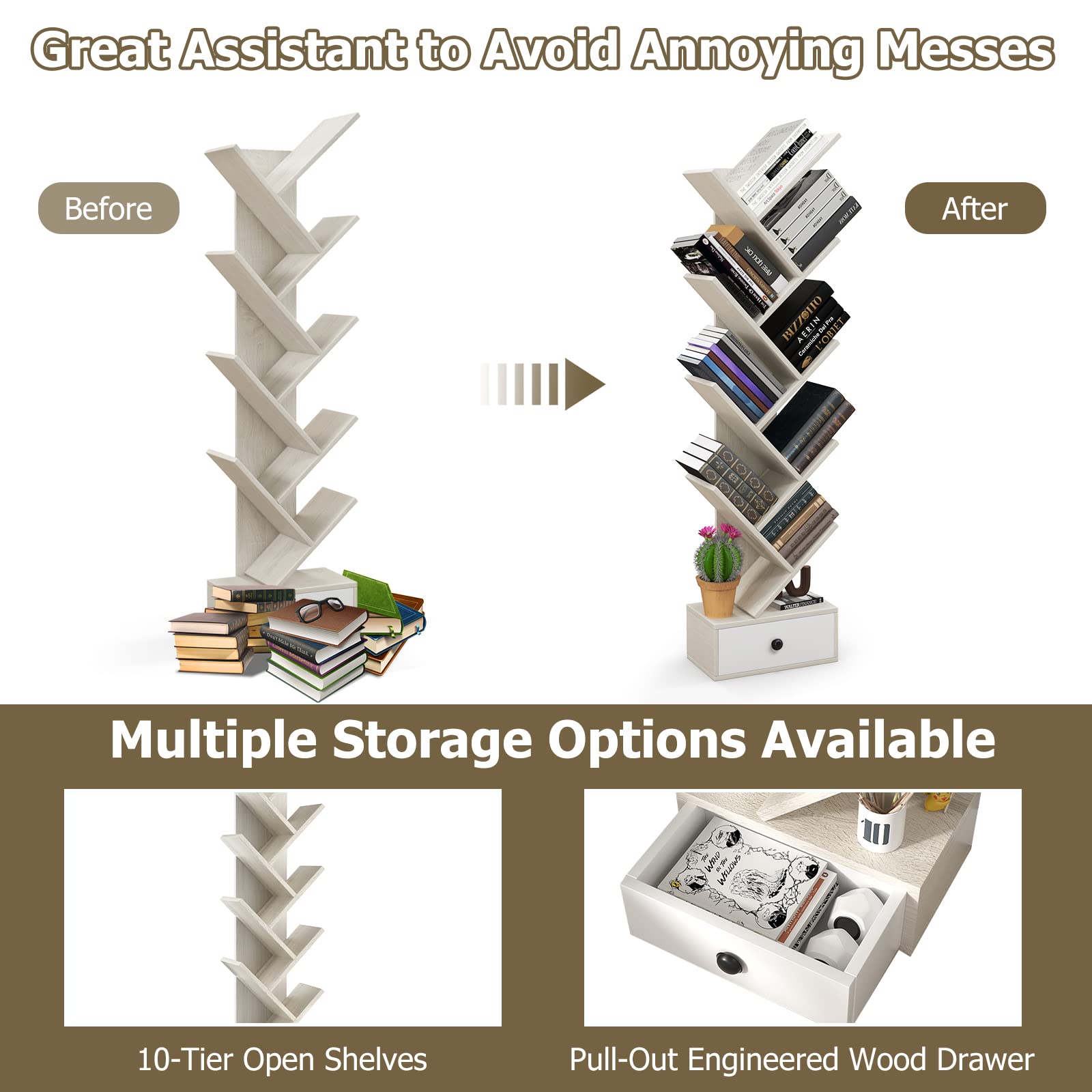 • 10-Tier Bookshelf with Drawer: Giantex tree bookcase is designed with 10 wide shelves in total, you can stack books based on different classification rules on each shelf. More, there is a pull-out wooden drawer at the bottom, allowing you to gain privacy for keys.