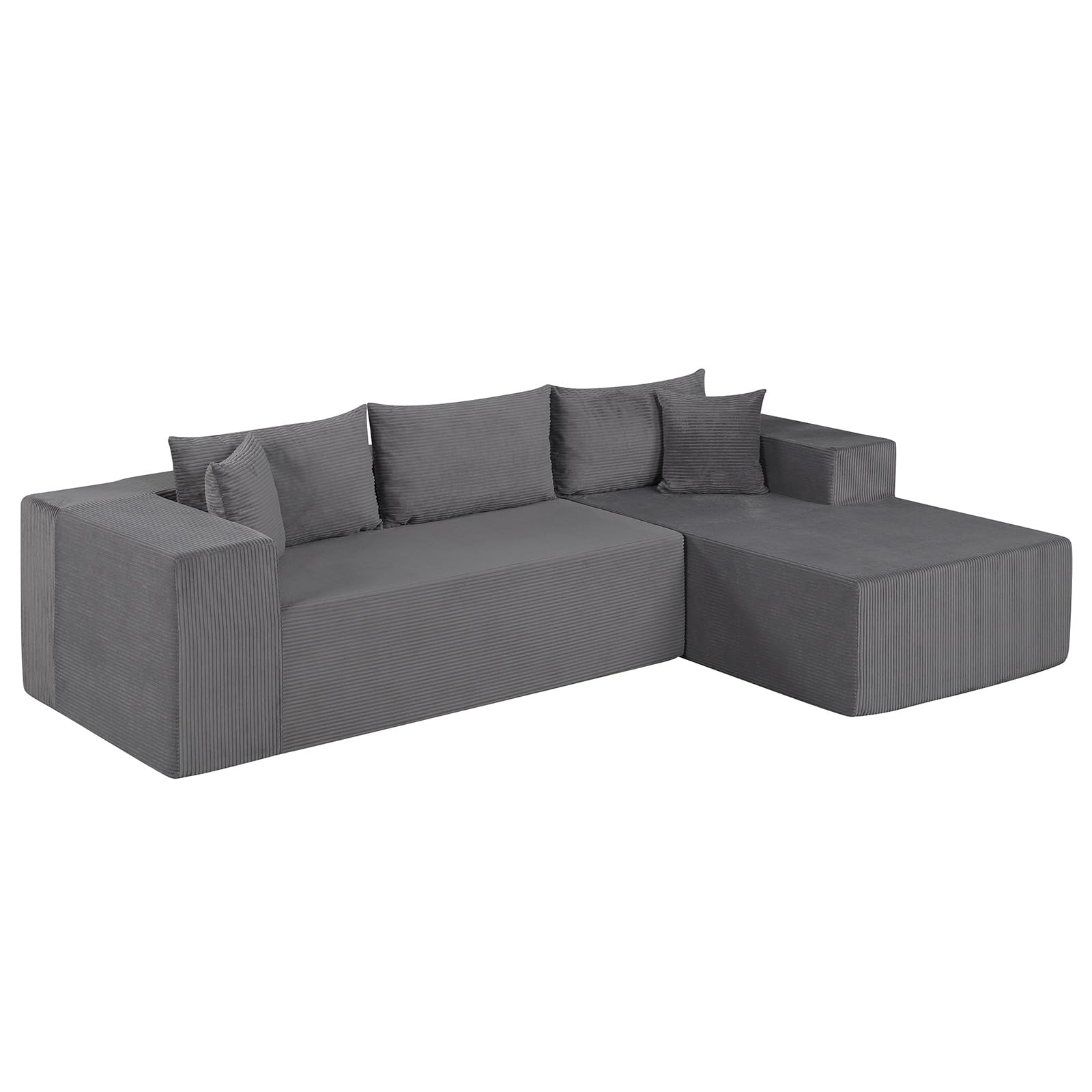 No assembly is required. You just need to wait it to recover to its original shape and use it in your living room or bedroom. Our modular sofa features skin-friendly corduroy covers and sponge fillings for a cozy sitting experience. Deep seat, supportive backrest, armrests, and 5 pillows bring full-body comfort. The sofa couch is 86” x 69.5” x 23”(L x W x H), offering ample sitting space for 4 people. Furthermore, anti-slip bottom keeps the sofa stable on any floor. After use, the zippered covers can be easily removed and cleaned by the washing machine.