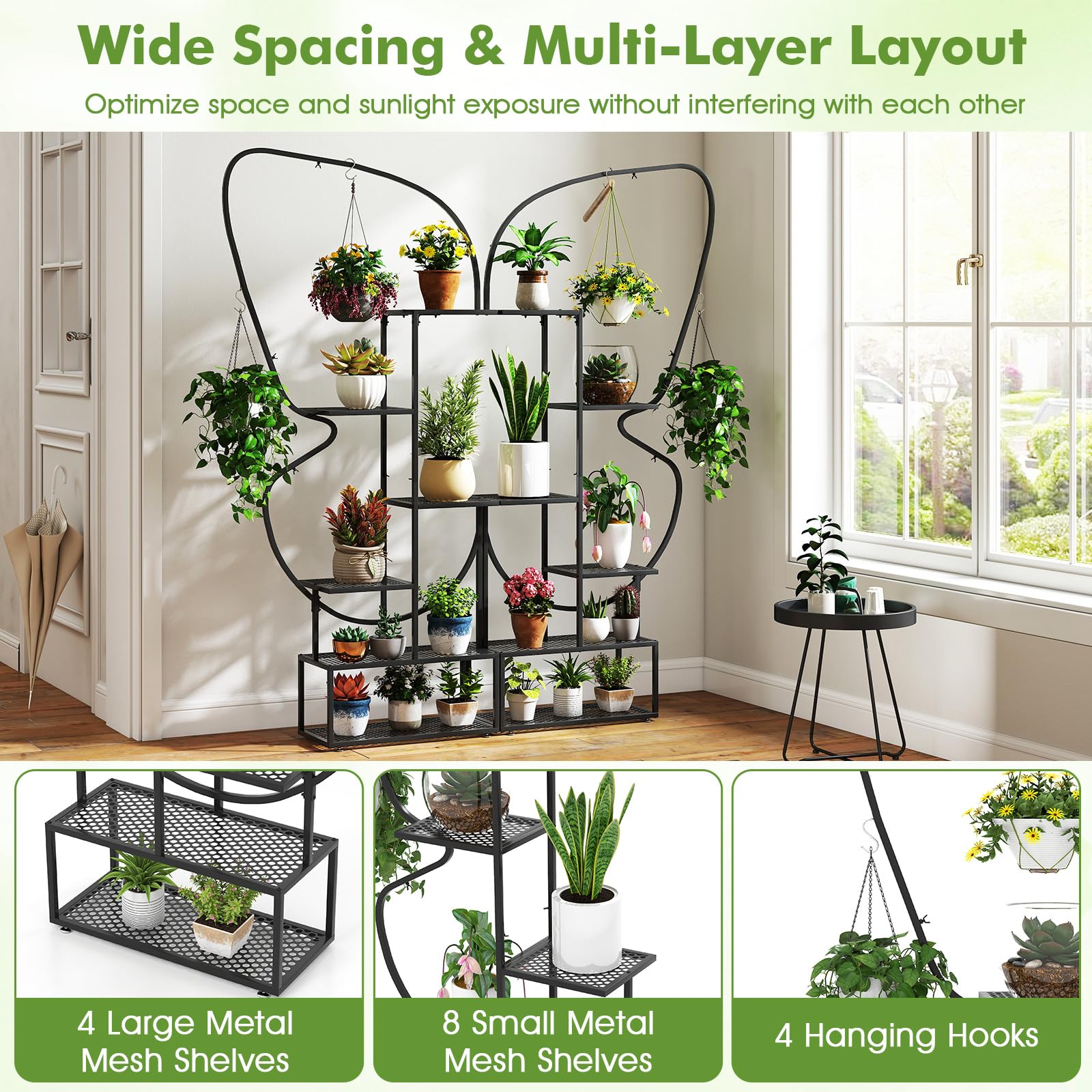 Our 6-tier metal plant shelf set includes 2 stands, each measuring 22” x 10.5” x 73”(L x W x H), which can be used as two separate units or as one harmonious piece in a unique butterfly shape, making it a striking addition to any space. Each of the 6 tiers is optimally spaced allowing for abundant sunlight, promoting healthy plant growth across the multiple large and small shelves. Constructed from a robust metal frame, complemented with adjustable foot pads and anti-toppling devices, our plant stand ensures your plants stay upright and secure in any environment. Not just for plants, this versatile stand can also showcase a variety of items like books, photos, and crafts, making it an ideal choice for your living room, balcony, or studio. Thanks to its metal mesh shelves, maintenance is also a breeze while effectively preventing water accumulation. Elevate your decoration while keeping your plants thriving with this elegantly crafted plant stand.