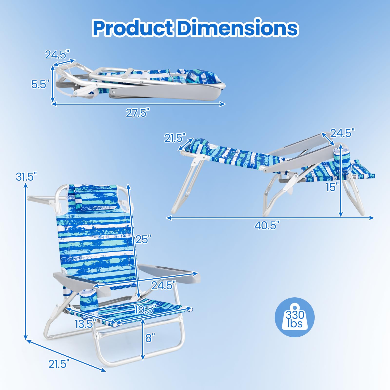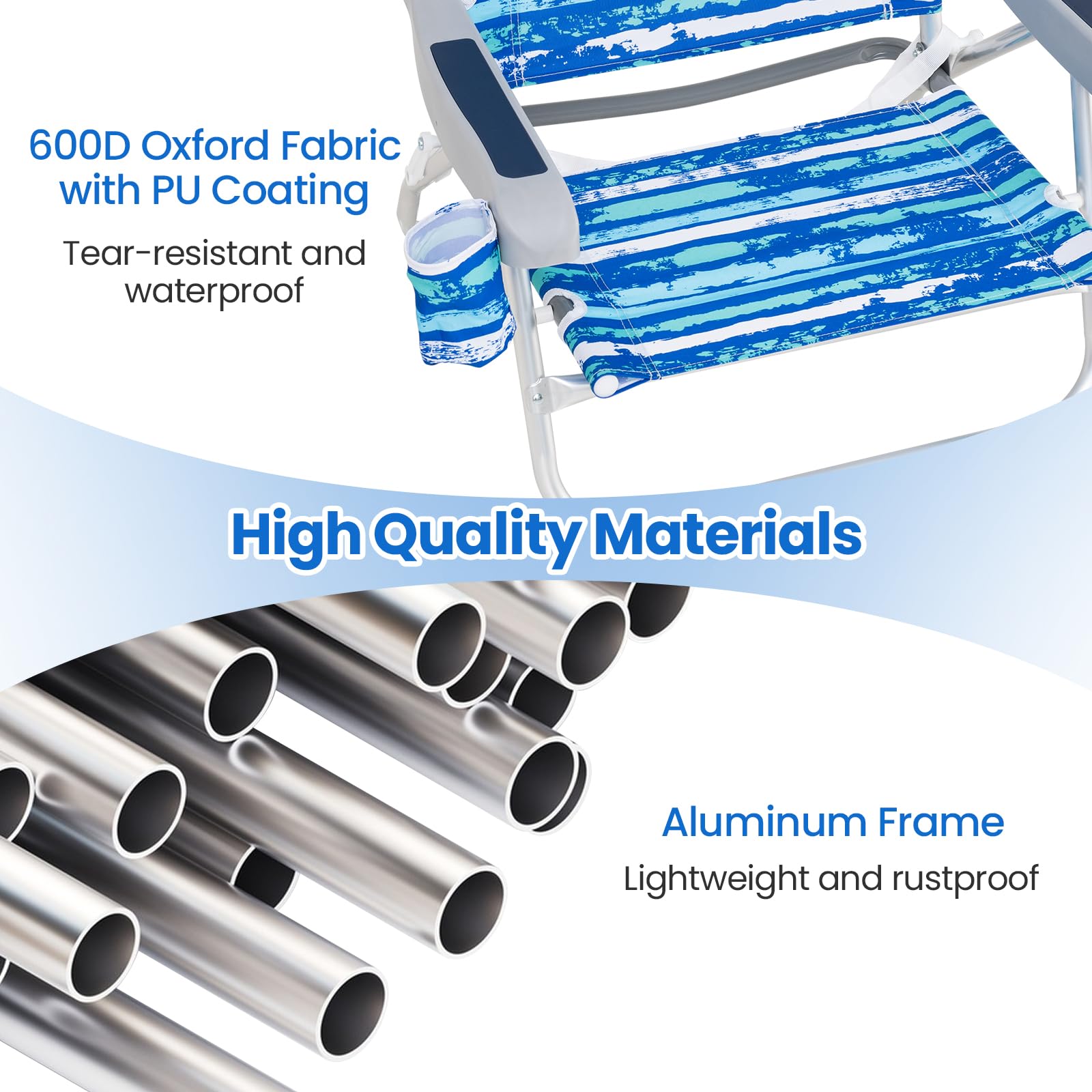 The beach chair allows you to adjust the backrest to 5 different positions, ensuring that you can find the perfect sitting angle for reading, napping or sunbathing. The built-in cup holder and towel bar will make your beach day more enjoyable. Equipped with a padded headrest and armrests, the foldable camping chair allows you to indulge in ultimate relaxation. Crafted with high-quality 600D oxford fabric with a PU coating, the beach chair is tear-resistant and waterproof, making it ideal for outdoor use. The aluminum frame is lightweight yet rustproof for durability. Moreover, the 5-position picnic chair is equipped with a shoulder strap, allowing you to carry it wherever your outdoor adventures take you. Whether you're planning a picnic in the park, a beach party with friends, or a camping adventure, the lay flat camp chair is the portable companion you need.