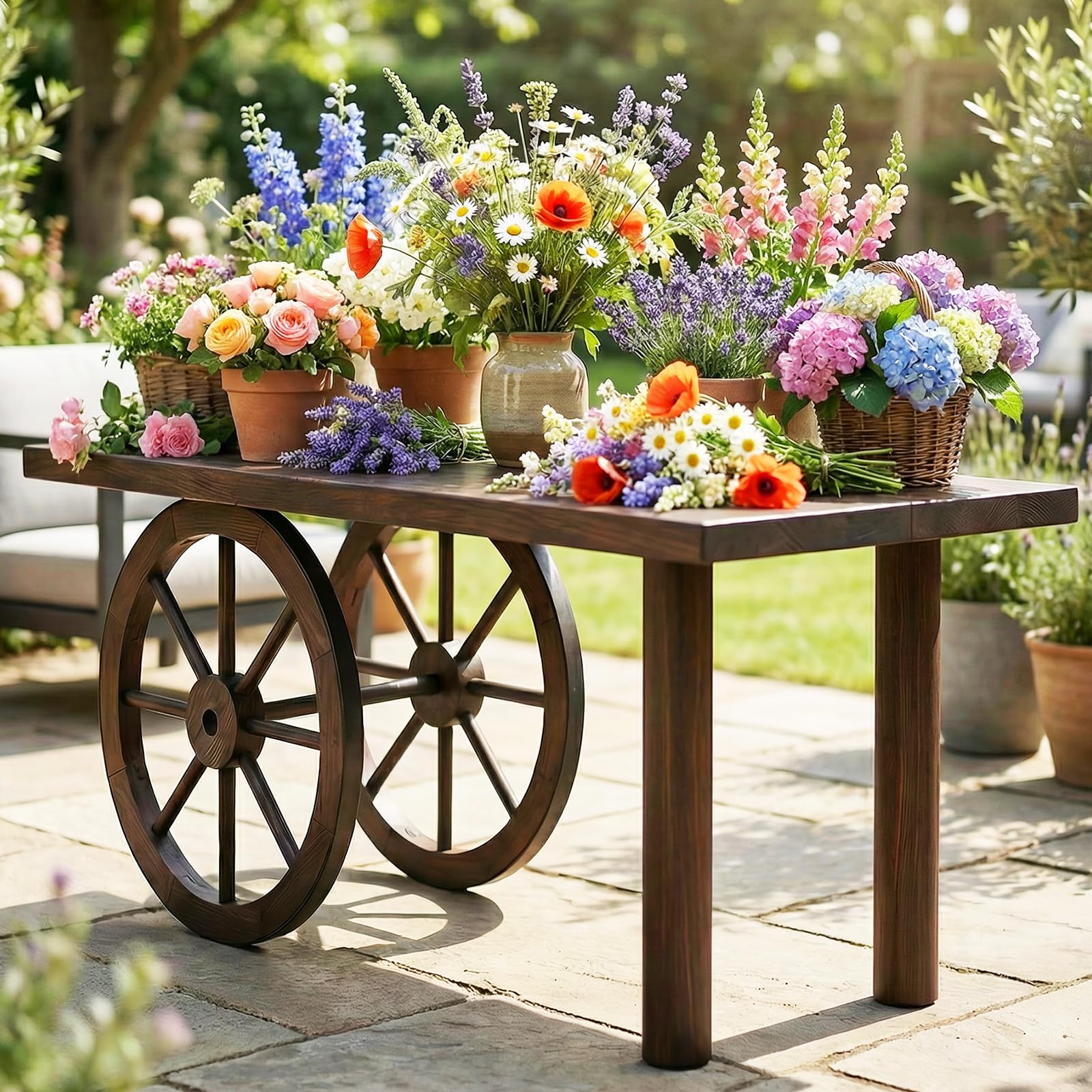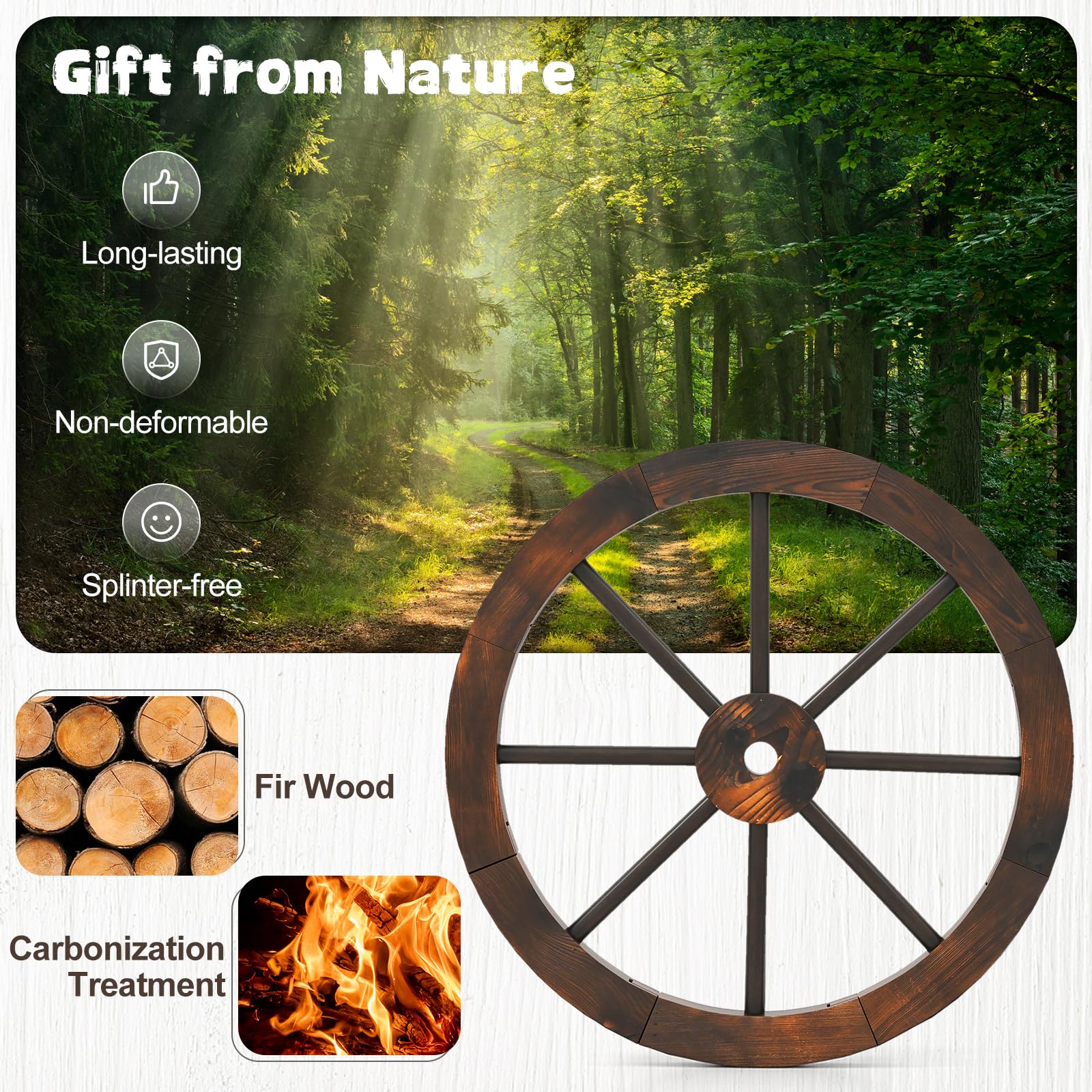 Add authentic Western character to any space with these rustic wooden wagon wheels. Crafted from durable, non-deformable fir wood and finished with a carbonized treatment, they’re built to withstand outdoor conditions while retaining their vintage charm. Each wheel features 8 sturdy spokes, a thickened structure, and a reinforced metal rim for long-lasting strength. Versatile in use, they work beautifully as classic wagon décor, striking wall art, or even as the base for a DIY chandelier (hanging accessories and bulbs not included). Perfect for enhancing coffee shops, living rooms, gardens, patios, or garages with a timeless frontier feel.
