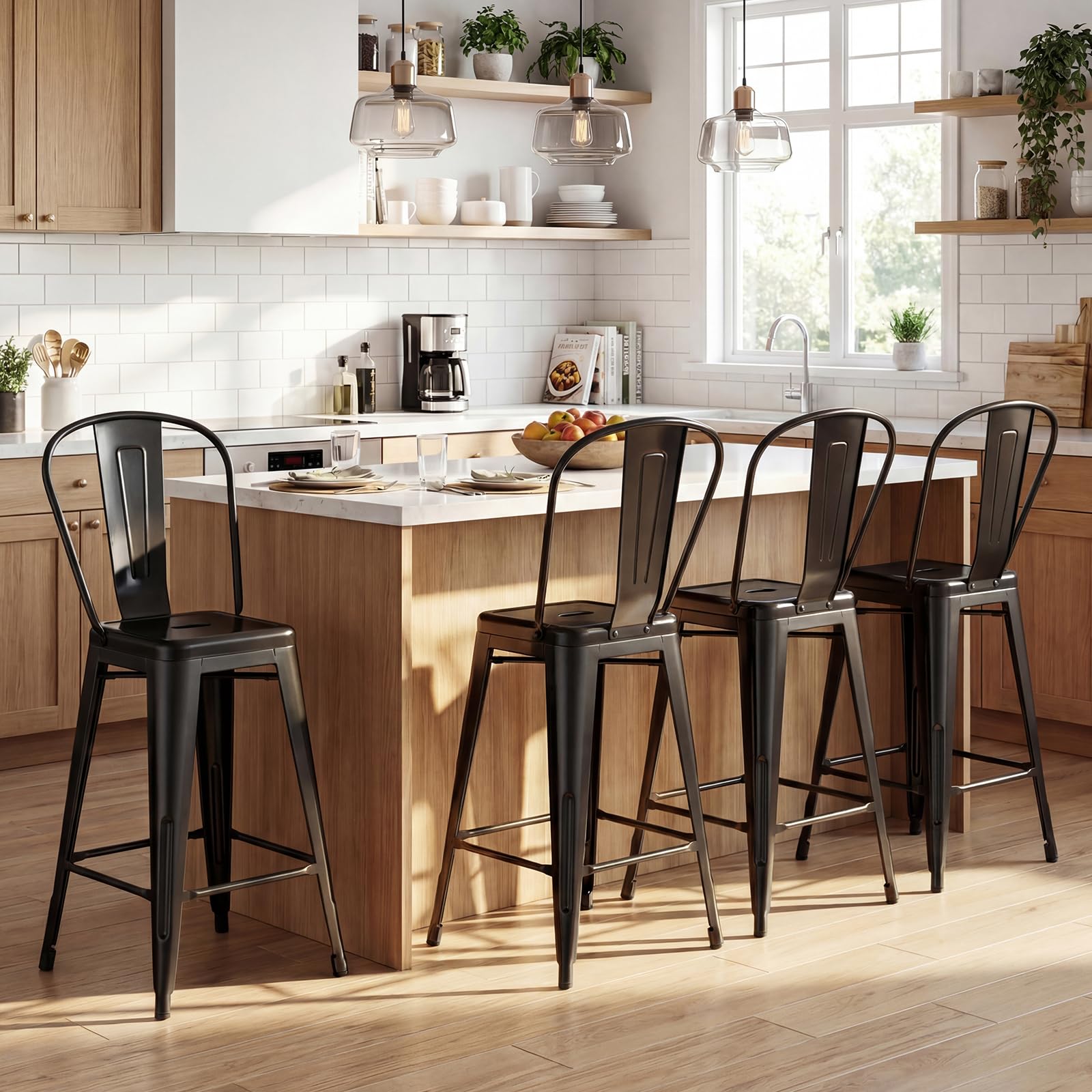 Upgrade your counter seating with these sleek industrial stools designed for all-day comfort. A tall, gently angled back plus an integrated footrest helps you sit more naturally, while the airy seat opening keeps things cooler. Made for 35"–39" counters, the 24" seat height fits kitchen islands and home bars perfectly. Want more flexibility? Detach the backrest in seconds for a backless look, then stack the stools away to free up space—scratch-resistant pads help keep surfaces pristine. Heavy-duty metal construction with an under-seat support brace delivers reliable strength, and non-skid feet protect your floors. Assembly is effortless: fasten the back with the included hardware, then enjoy easy-clean, modern style anywhere.