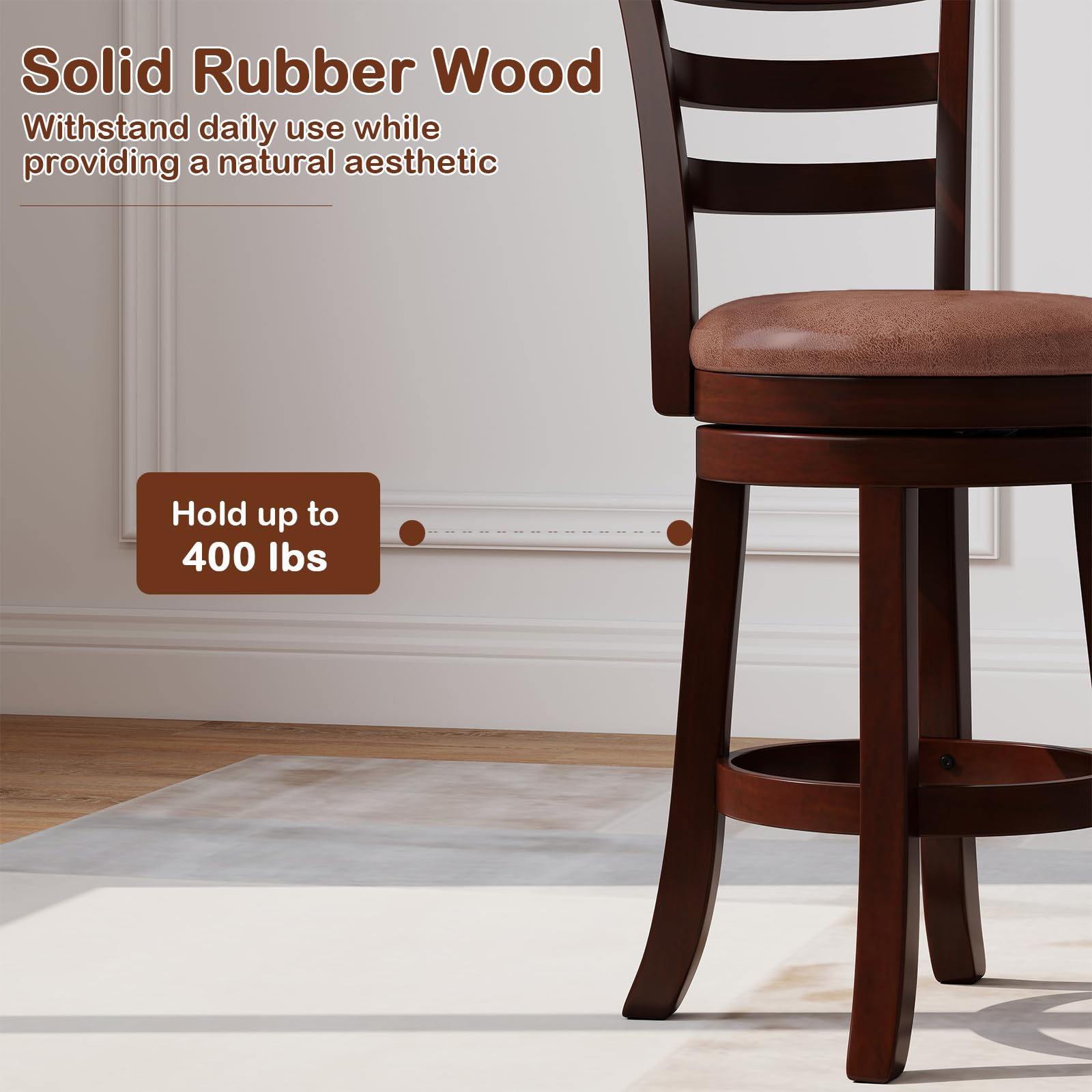 Featuring a robust rubber wood frame, these high bar chairs for kitchen island are constructed to support up to 400 lbs, ensuring long-lasting stability and strength. The seats offer luxurious comfort, upholstered in skin-friendly faux leather and padded with soft sponge, ideal for spending long hours seated at the bar or dining area. For added versatility and ease of use, each of these tall barstools incorporates a 360° swivel function and is equipped with ergonomically designed backrests and footrests, making them a practical addition to your living space.