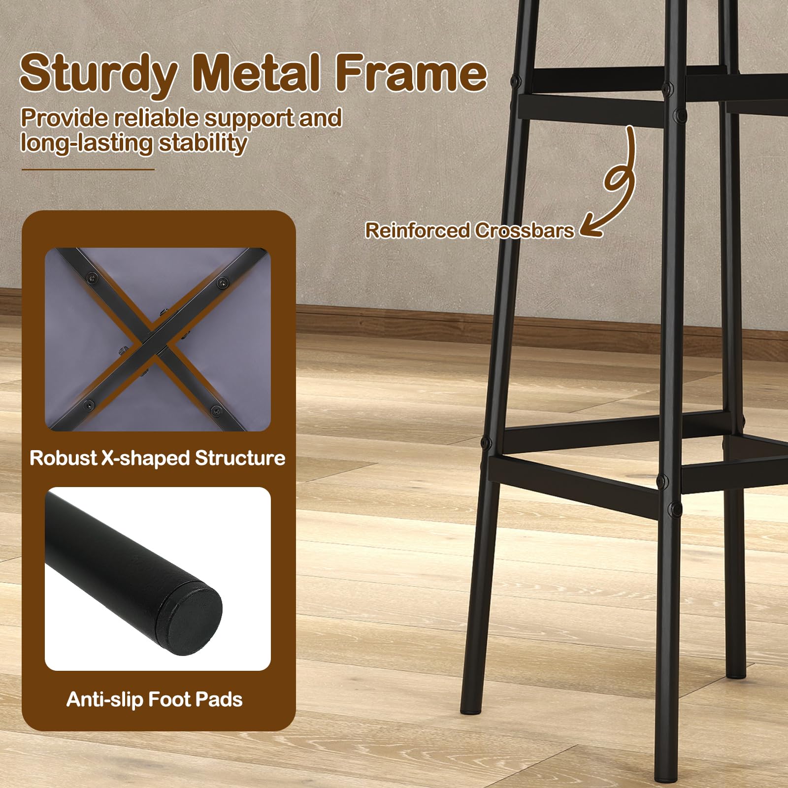 These kitchen island stools feature a sturdy metal frame with an X-shaped structure and reinforced crossbars, supporting up to 330 lbs for exceptional stability and durability. The breathable linen fabric upholstered seats are padded with soft sponges, providing comfortable seating for long periods. Their backless design and 29-inch seat height make these kitchen breakfast chairs perfect for 40" to 43" high tables, allowing you to tuck them neatly under the table to save space. Additionally, the built-in footrests are positioned at different heights for ergonomic support.