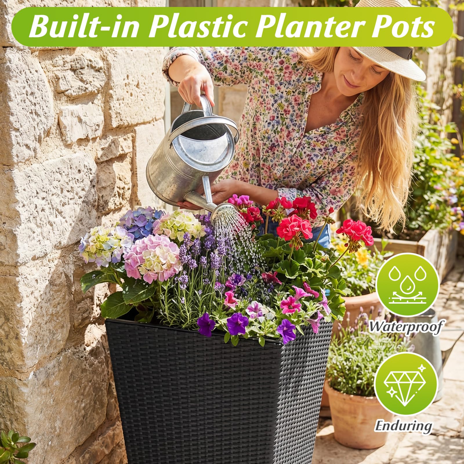 Each planter includes a removable plastic inner bucket, allowing you to adjust plants, refresh soil, or clean the containers without lifting the entire pot. The sturdy metal frame increases overall stability. Built with breathable and long-lasting PP rattan material, it gives you a low-maintenance gardening solution. In addition, with a stackable construction and versatile placement options, this planter set enhances porches, patios, balconies, gardens, and indoor living spaces effortlessly.