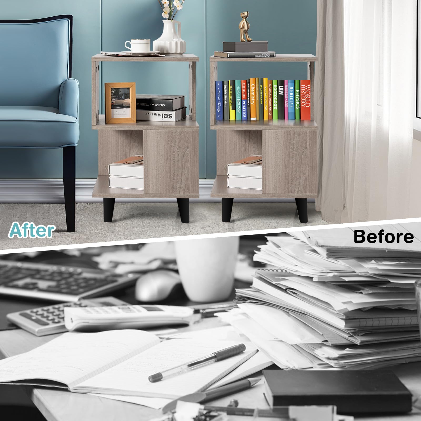 Supported by 4 solid wood legs and made of thickened boards, our end table enjoys the merit of high stability, bearing your various items without structural distortion. 2 tiers and a top provide you with ample storage space to organize your books, photos and other accessories. The unique asymmetrical design is eye-catching, which can show your good taste.