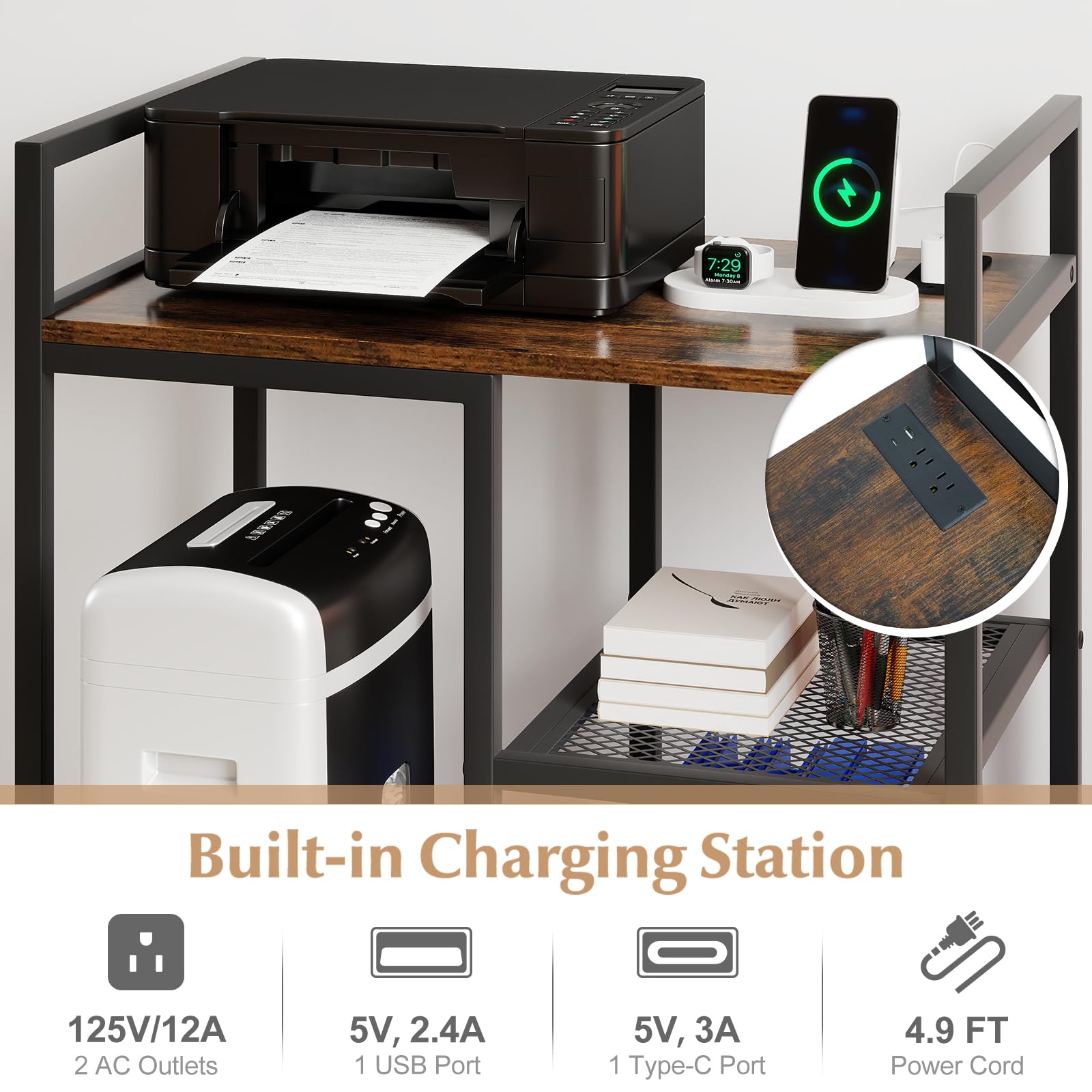 No worried about low battery or messy wires! The printer stand features a built-in charging station that allows you to charge multiple devices simultaneously. For storage convenience, this practical 3-tier printer table not only supports your printer but also organizes your office supplies efficiently with its mesh storage shelves. Moreover, you can use it as a paper shredder stand or CPU stand. Constructed with strength and durability in mind, the printer table is supported by a robust powder-coated metal frame. Adjustable foot pads offer additional stability. All in all, this printer stand caters to a variety of needs with ease and style.