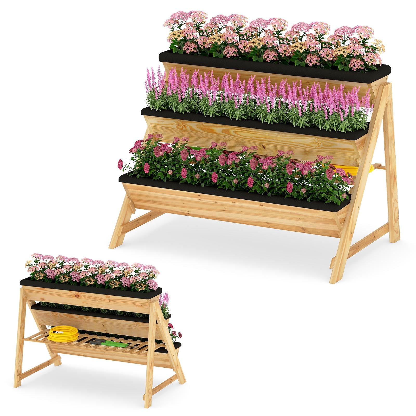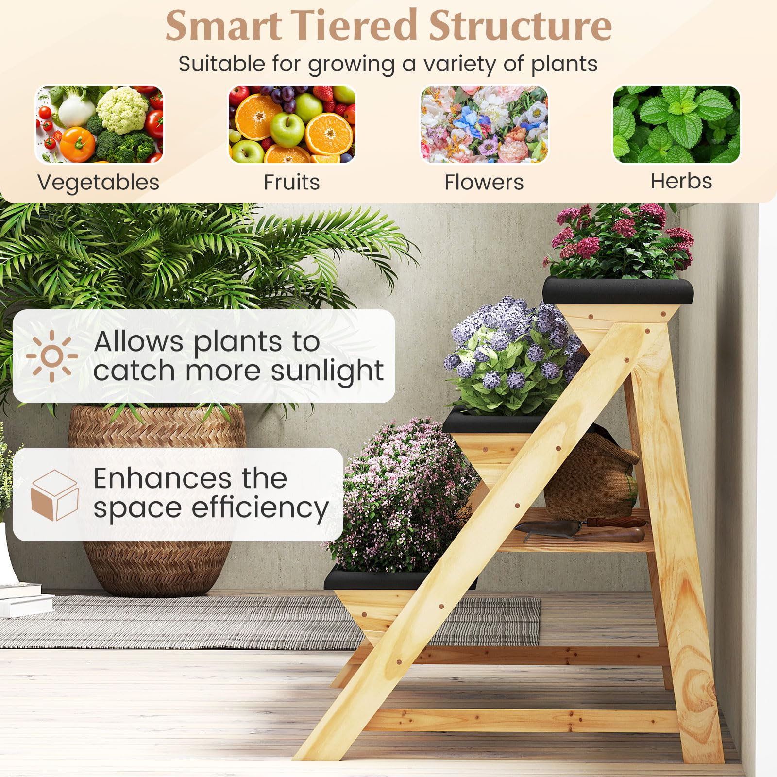 Crafted from premium pine wood, the 3-tier garden bed combines durability with a natural, timeless look that resists deformation over the seasons. Its intelligent tiered design maximizes sun exposure, giving your flowers, herbs, or vegetables the best chance to thrive. Meanwhile, the vertical layout enhances the space efficiency. The water-based paint not only extends the life of the planter but also allows for easy customization to suit your unique garden aesthetic. Each level includes a removable liner, effectively preventing soil loss and protecting the integrity of your display. For added convenience, a spacious slatted shelf underneath is perfect for organizing gardening tools or displaying succulents, ensuring everything you need is within easy reach as you nurture your plants. The solid A-shaped frame provides outstanding stability, keeping your garden bed secure and wobble-free.