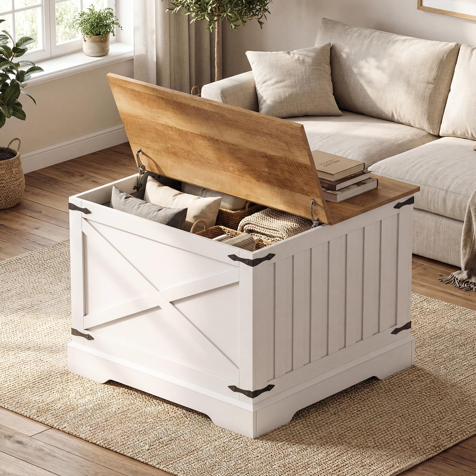 Featuring a hydraulic lifting mechanism, the square center table effortlessly transitions from a standard coffee table to a raised workstation or dining area. For storage convenience, the large hidden storage compartment beneath the hinged flip-top lid helps keep your living room clutter-free. Details determine quality. Built with heavy-duty metal sheets and stable base, this wooden coffee table withstands long-lasting use. The farmhouse design merges classic aesthetic with modern functionality, making it a great centerpiece in any room.