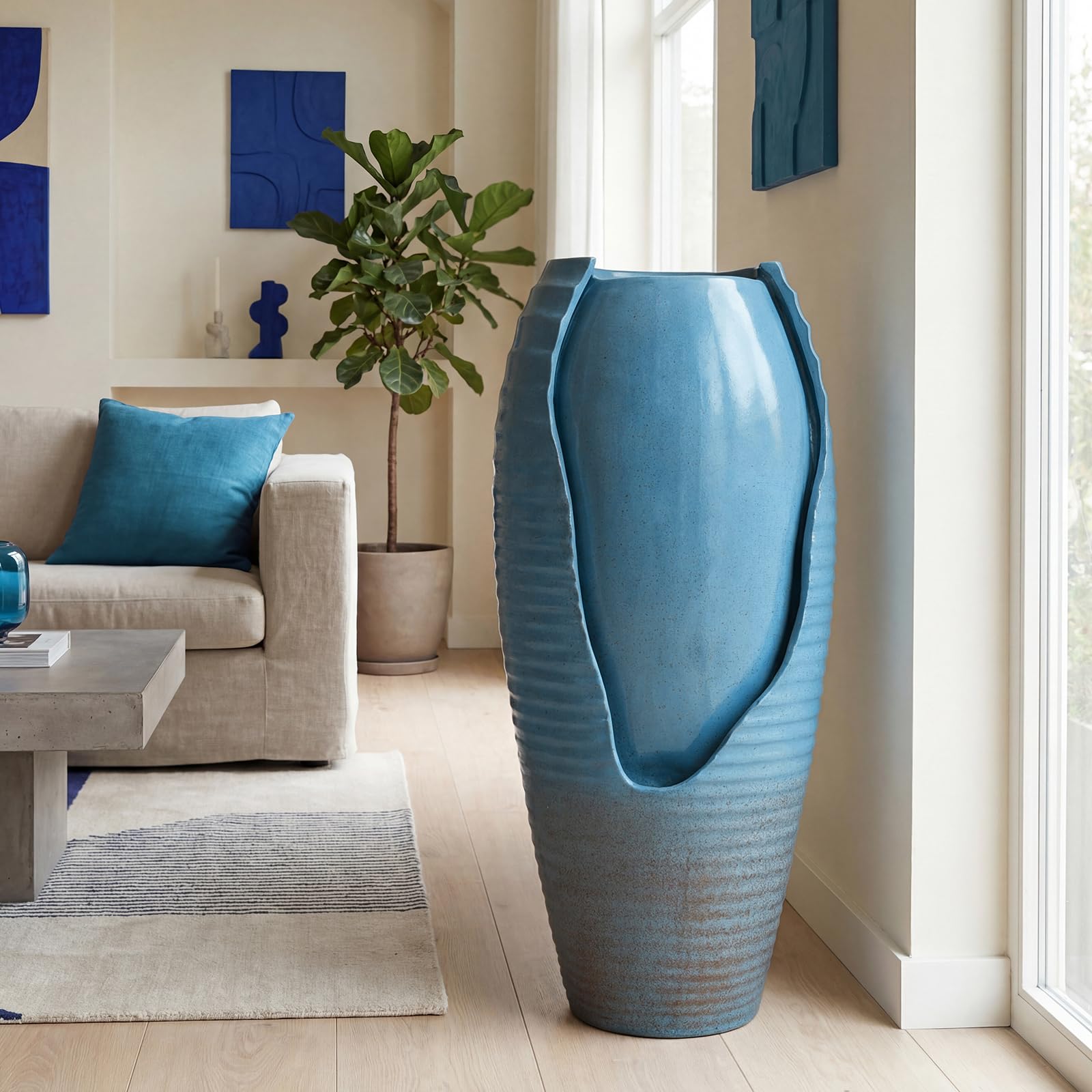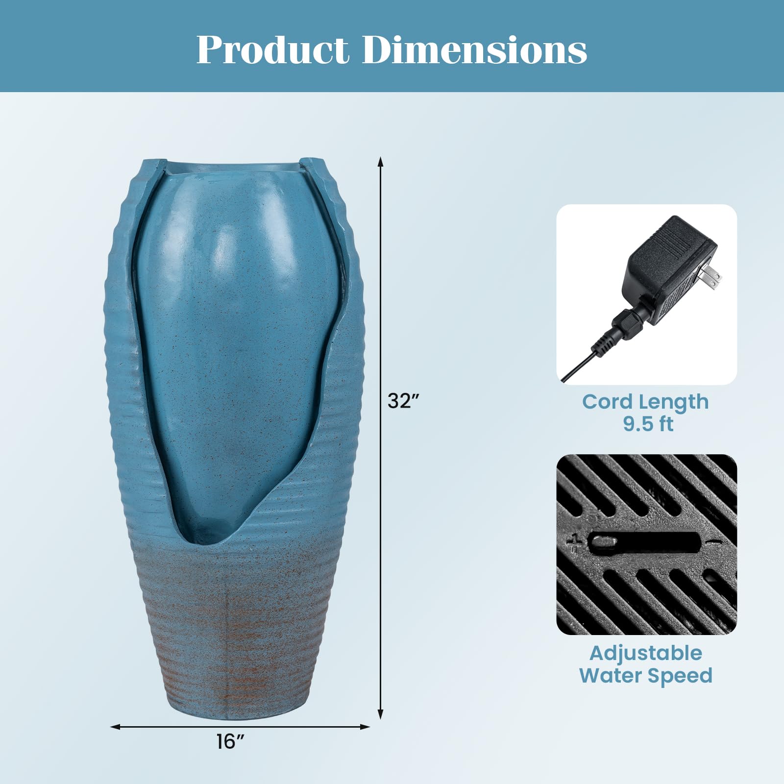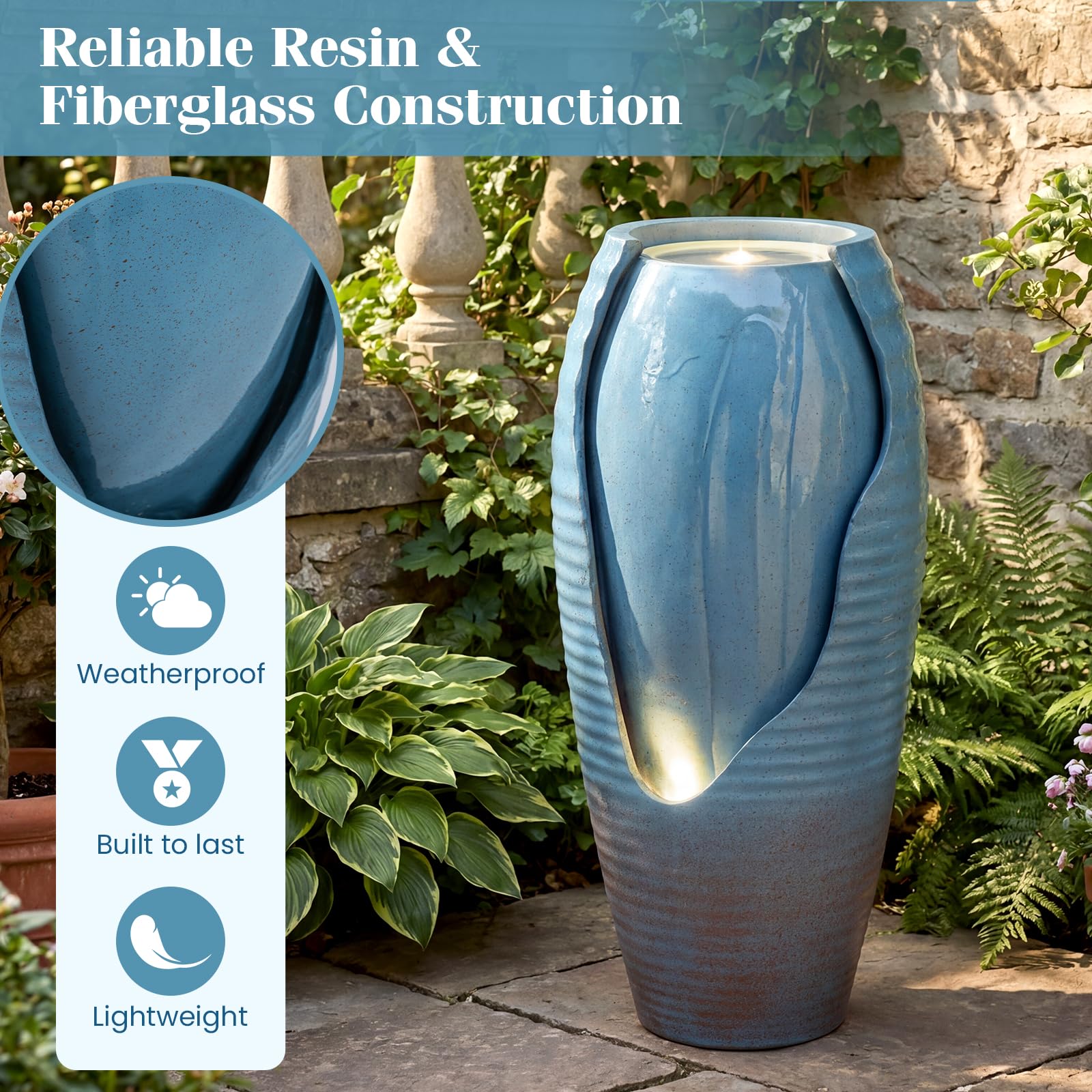 Transform your garden, patio, or indoor space with this charming vintage jar water fountain. Featuring 12 built-in warm white LED lights, it creates a soft night glow that beautifully highlights flowing water. The built-in pump produces gentle, relaxing stream sounds with adjustable flow speed for a serene ambiance. Crafted from durable resin and fiberglass, this fountain resists rust, sun, and frost, while the vintage blue cracked jar design with intricate wave patterns adds timeless artisan appeal. Lightweight and compact, it's easy to place anywhere with a 9.5 ft power cord.