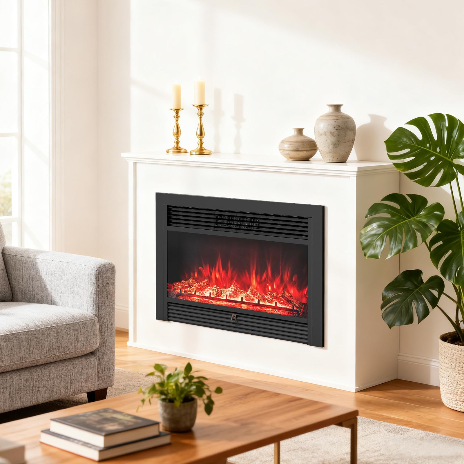 - [Various Installation Modes]: Inserting the electric fireplace into cabinet or wall are all convenient ways to enjoy comfort of a crackling fireplace without taking up too much space. This embedded fireplace will add a touch of sleek into your living room, bedroom and office. Please pay attention to the dimensions of your TV stand and cabinet.