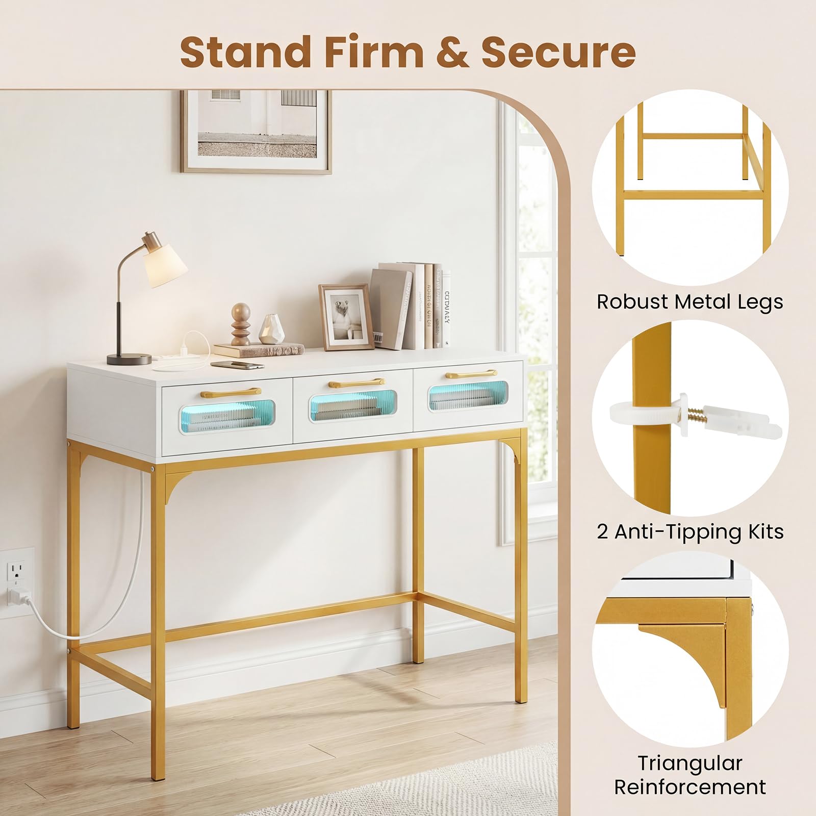 Designed for both function and atmosphere, this console table features a built-in LED light strip with 16 colors and adjustable modes to suit any mood. 3 spacious drawers and a wide top keep daily essentials neatly organized without clutter. And the fluted front panels of the drawers bring more elegance. The integrated power hub, with AC outlets and USB ports, makes charging devices effortless and within reach. Supported by sturdy metal legs with added reinforcement, it stays stable for everyday use. With well-crafted details, this narrow console table is a practical and stylish addition to any home.
