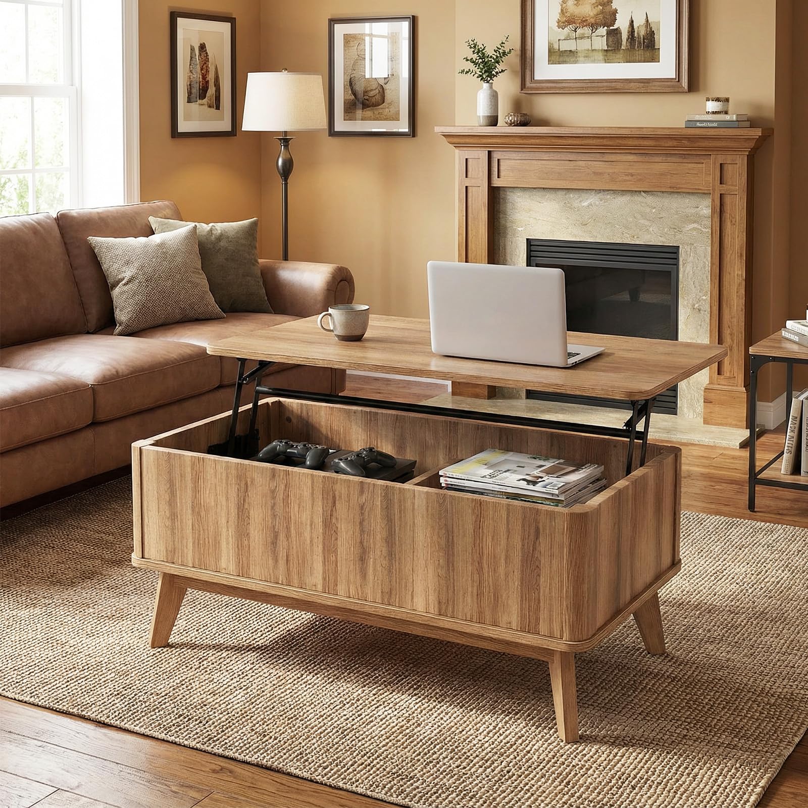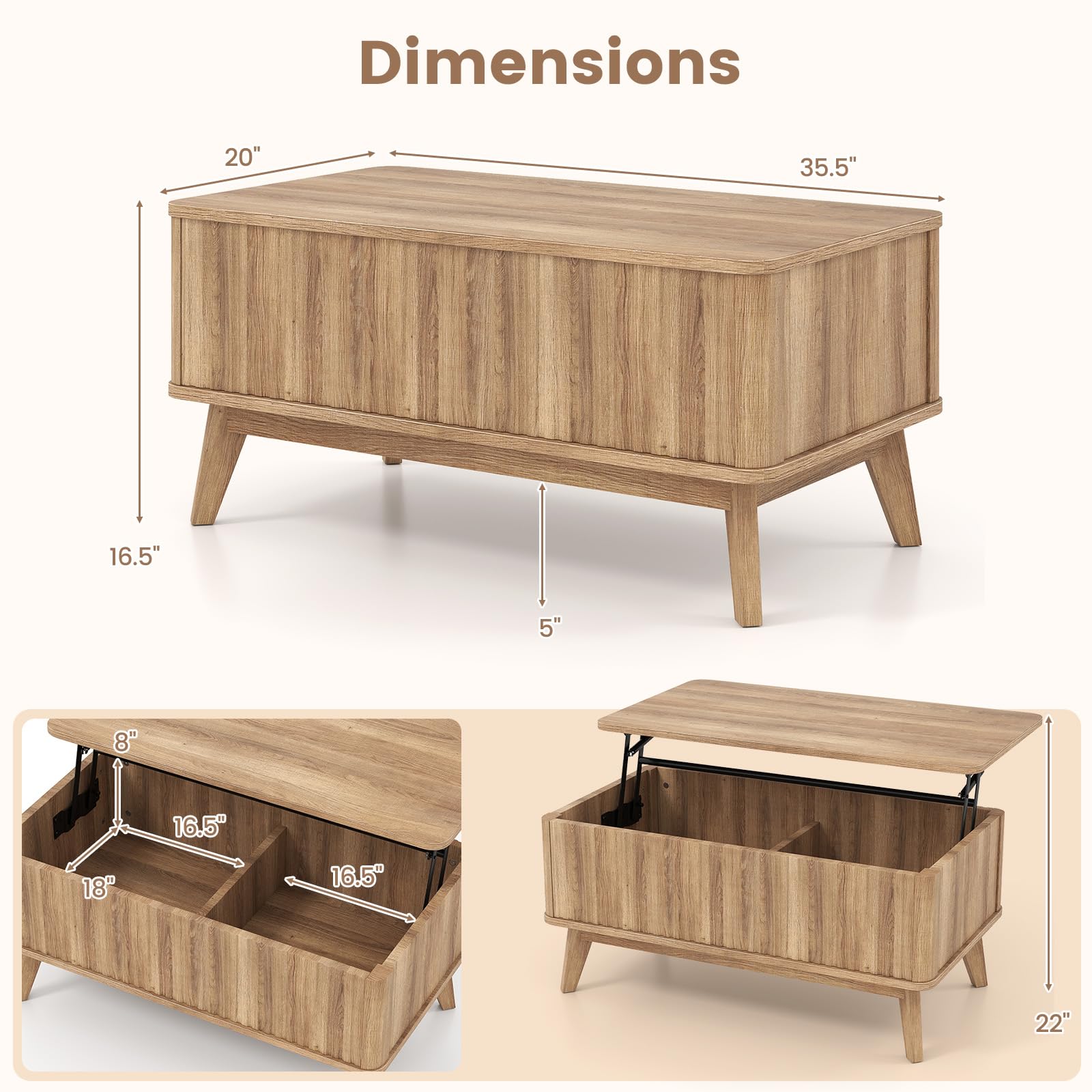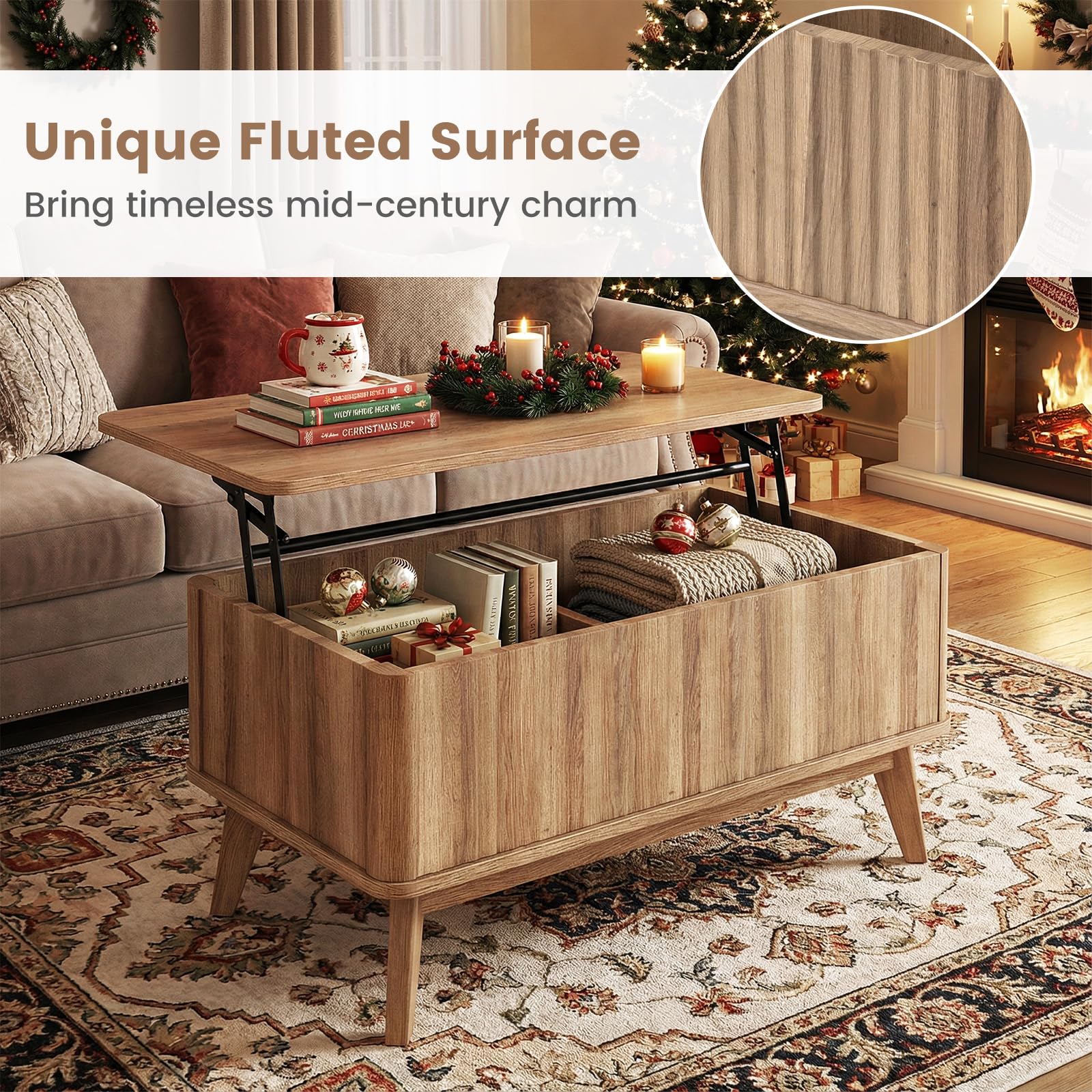 Elevate your living space with one table, dual functions that seamlessly blend modern design and practical use. This versatile lift top coffee table features a smooth lifting mechanism that transforms the piece from a classic coffee table into an elevated work table or dining surface. Spacious enough for everyday needs, it serves as your perfect storage organizer with a wide tabletop and 2 hidden compartments. Highlighting well-made details, its sleek mid-century fluted design adds a tasteful retro charm that complements various decoration styles. Built with sturdy rubber wood legs, it supports up to 200 lbs on top and 180 lbs inside each compartment, with protective foot pads to prevent floor scratches. Measuring 43.5"/35.5" long, this adaptable lift top center table fits effortlessly in living rooms, home offices, or studies, combining style and dynamic functionality for modern households.