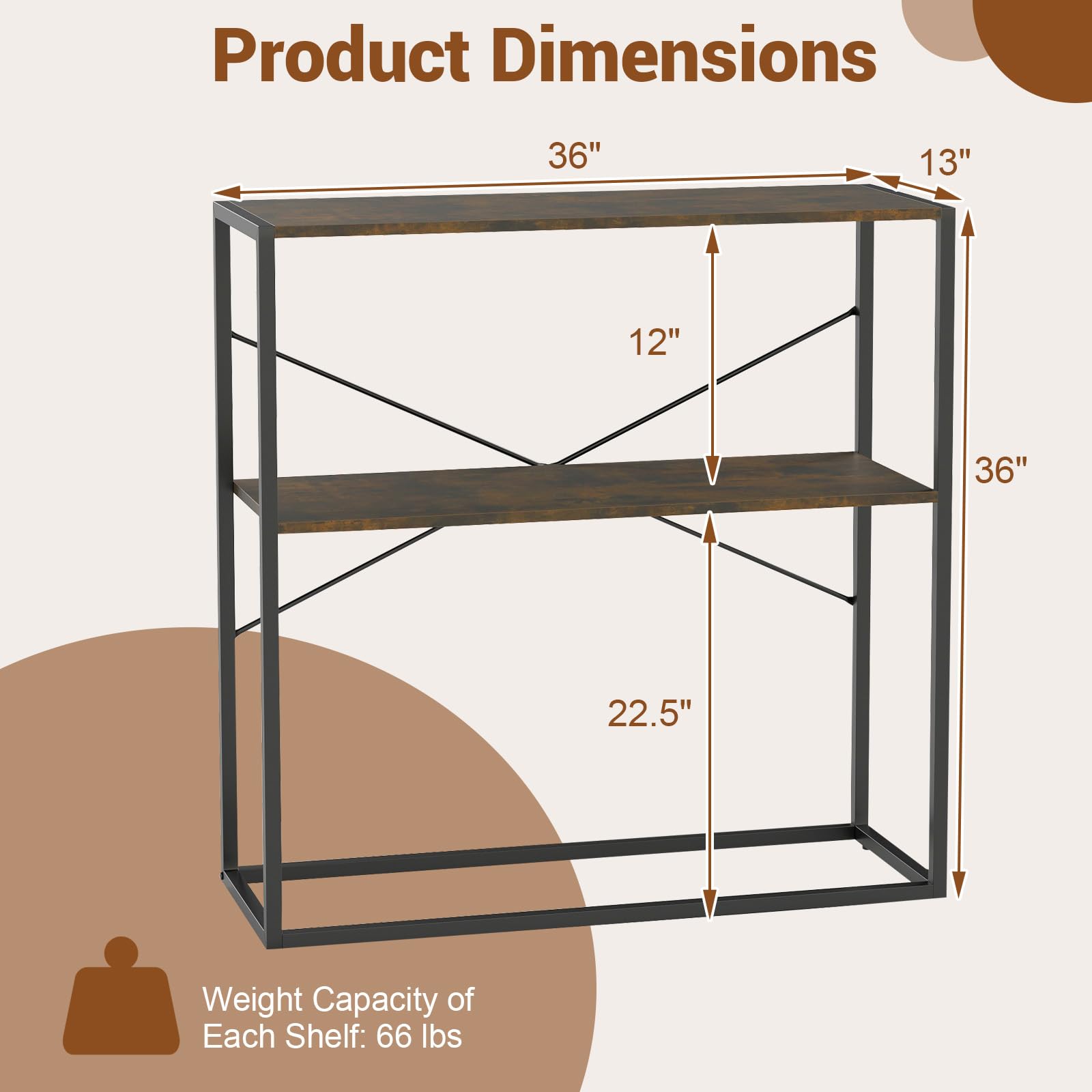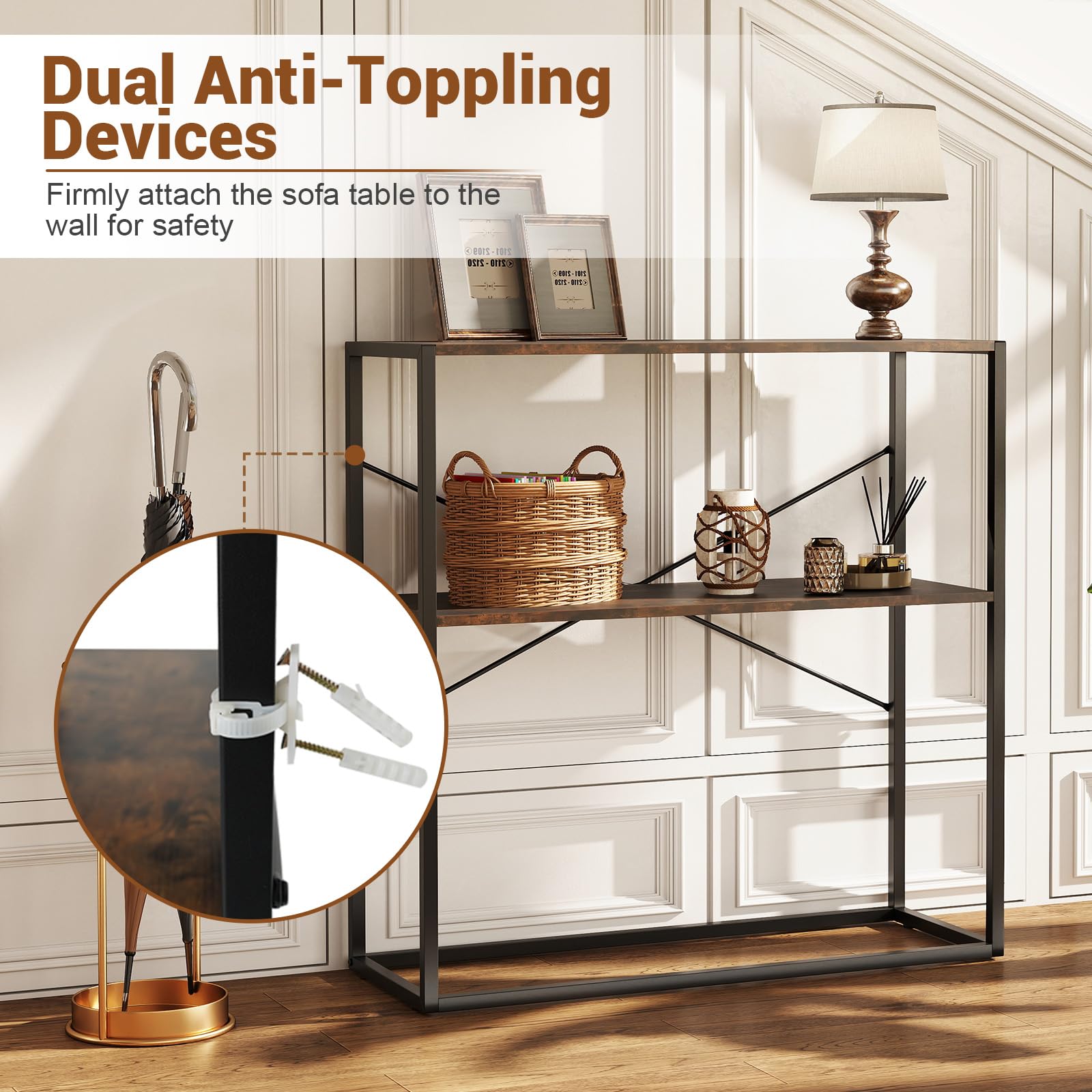 Featuring 2 spacious open shelves, this sofa table offers ample room for organizing your belongings. The sturdy metal frame, reinforced by X-shaped braces, ensures exceptional stability and durability, further supported by adjustable foot pads that adapt to uneven flooring. Safety is a priority with 2 anti-toppling devices that securely anchor the behind couch table to the wall. The hallway table comes in a rustic wood grain style that adds a timeless, vintage charm. Whether positioned in an entryway or behind your couch, this console table effortlessly combines practical storage solutions with an uplifting aesthetic touch.