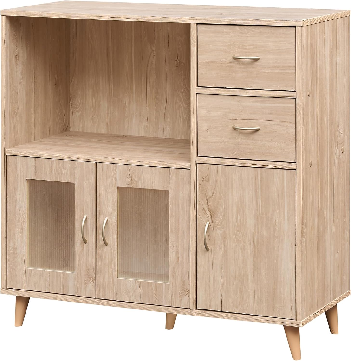 This wooden kitchen table features a wide top surface, an open compartment, 2 drawers and 3 doors, offering a flexible organization solution for your items. With convenient handles, it is easy for you to access the objects stored in the drawers or behind the doors. Plus, stability and security are ensured by sturdy tapered legs and an anti-toppling device that keeps the coffee bar station firmly anchored. Additionally, the exquisite wooden grain complements the elegant door panels, infusing your space with rustic charm, making this farmhouse storage cabinet an ideal addition to your kitchen, dining, or living room.