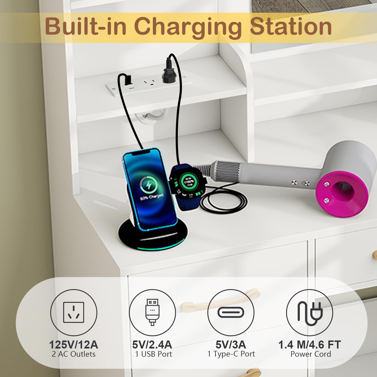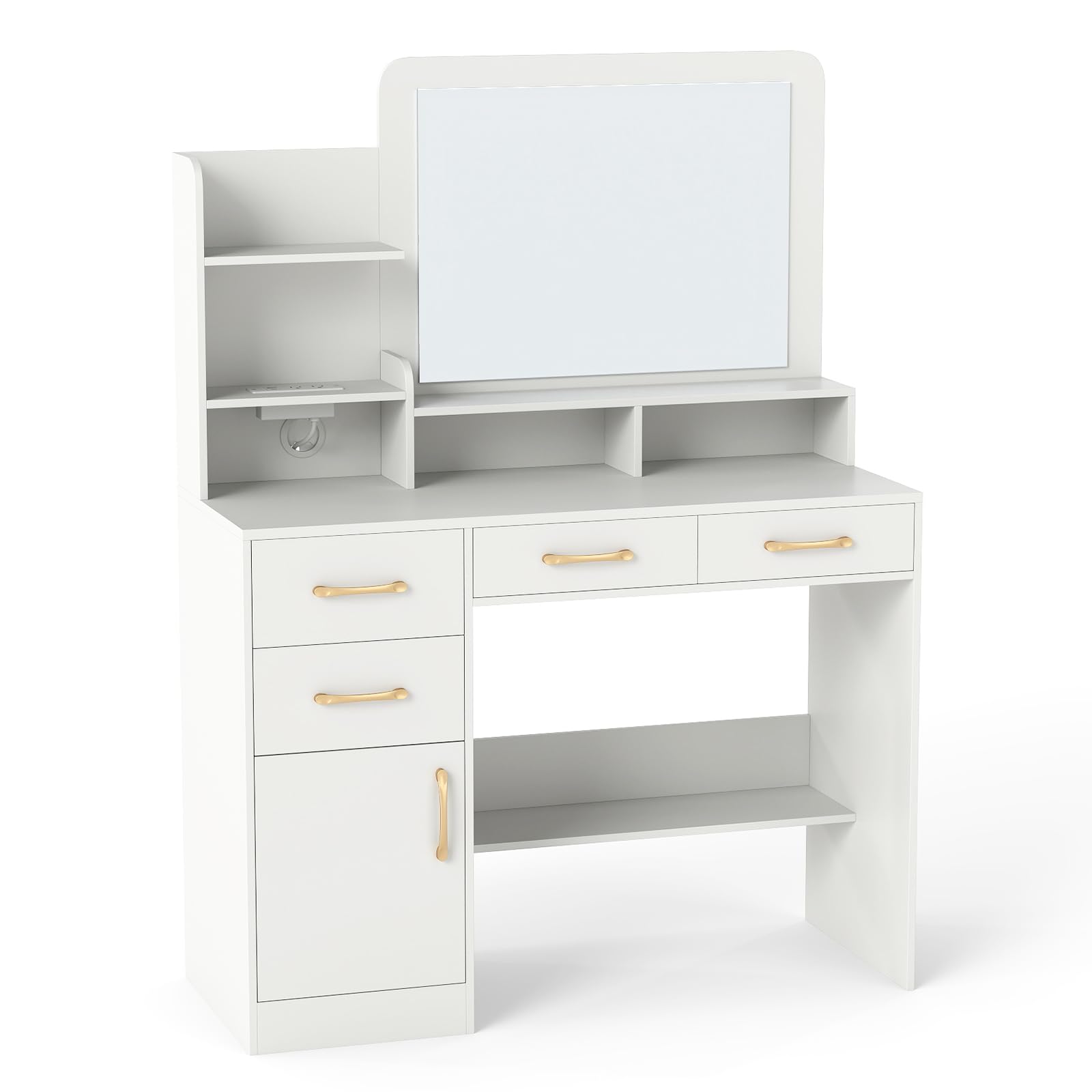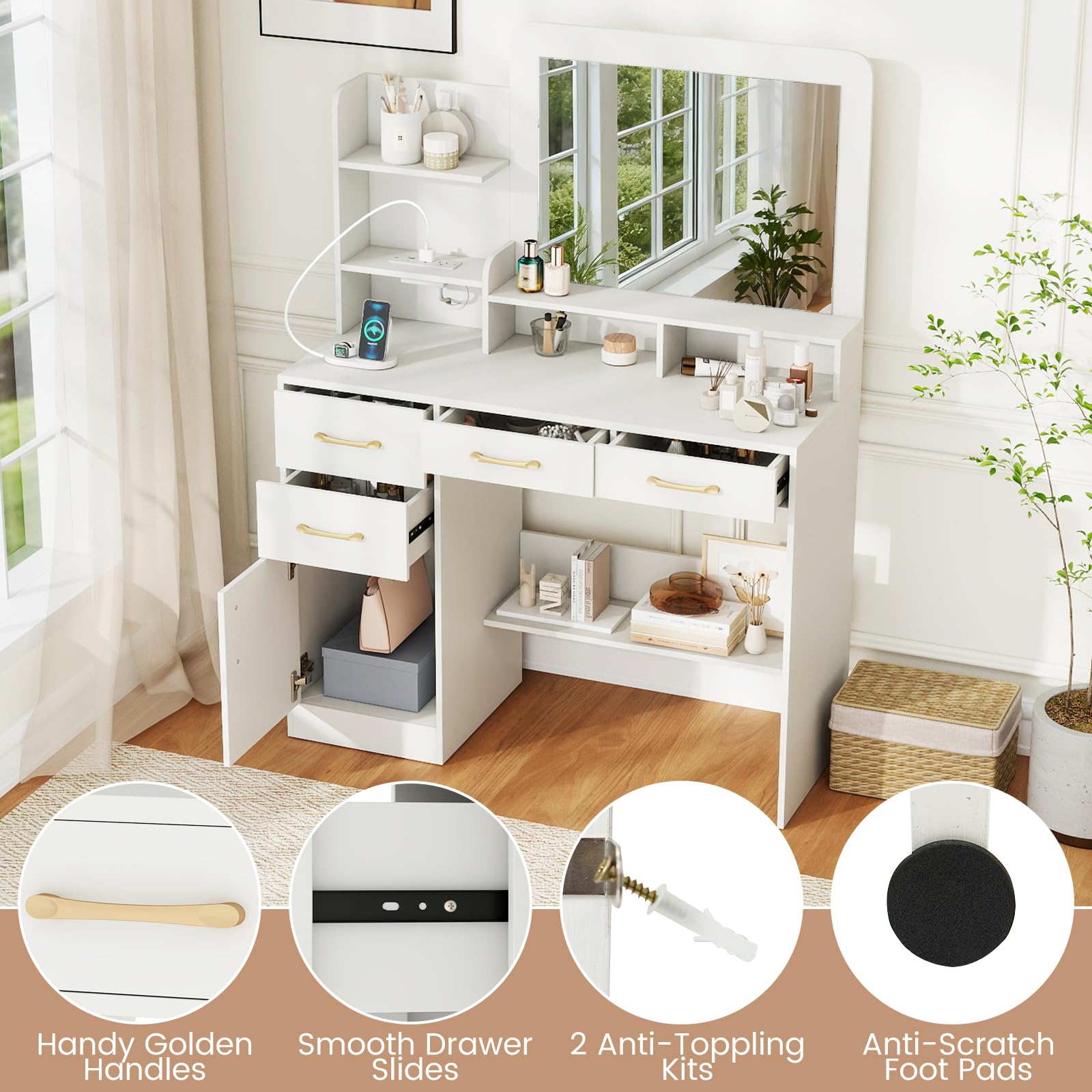 Upgrade your beauty routine with this modern vanity table. The large 23'' x 17'' mirror offers a clear view for flawless makeup and hair styling. With 4 drawers, 3 open shelves, 2 compartments, 1 side cabinet, and a spacious desktop, it provides ample storage for cosmetics, hair tools, and accessories. A built-in charging station with 2 AC outlets, 1 USB port, and 1 Type-C port keeps your devices powered while you get ready. Designed with cable management, anti-toppling kits, and non-slip foot pads, this vanity ensures stability, safety, and a neat setup.