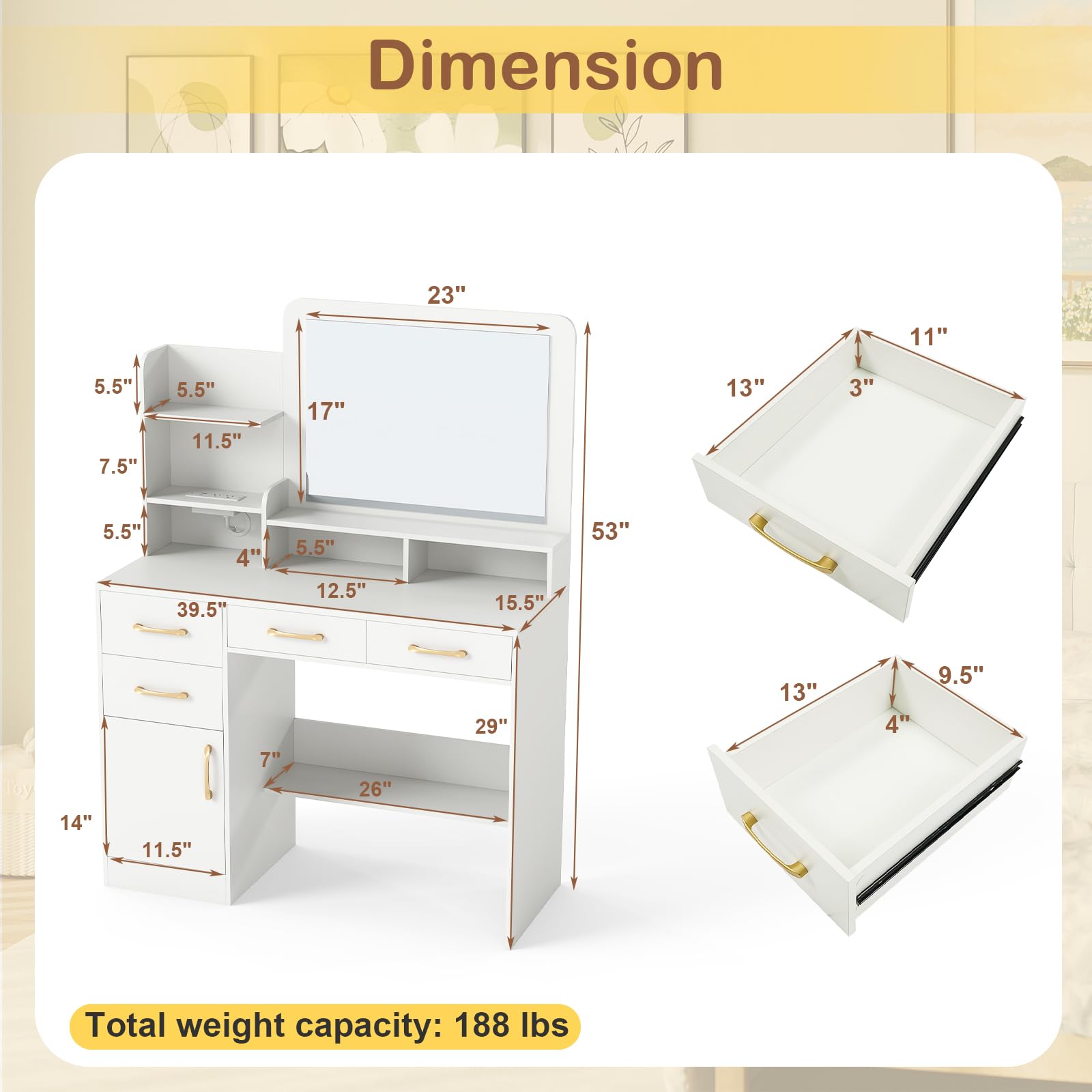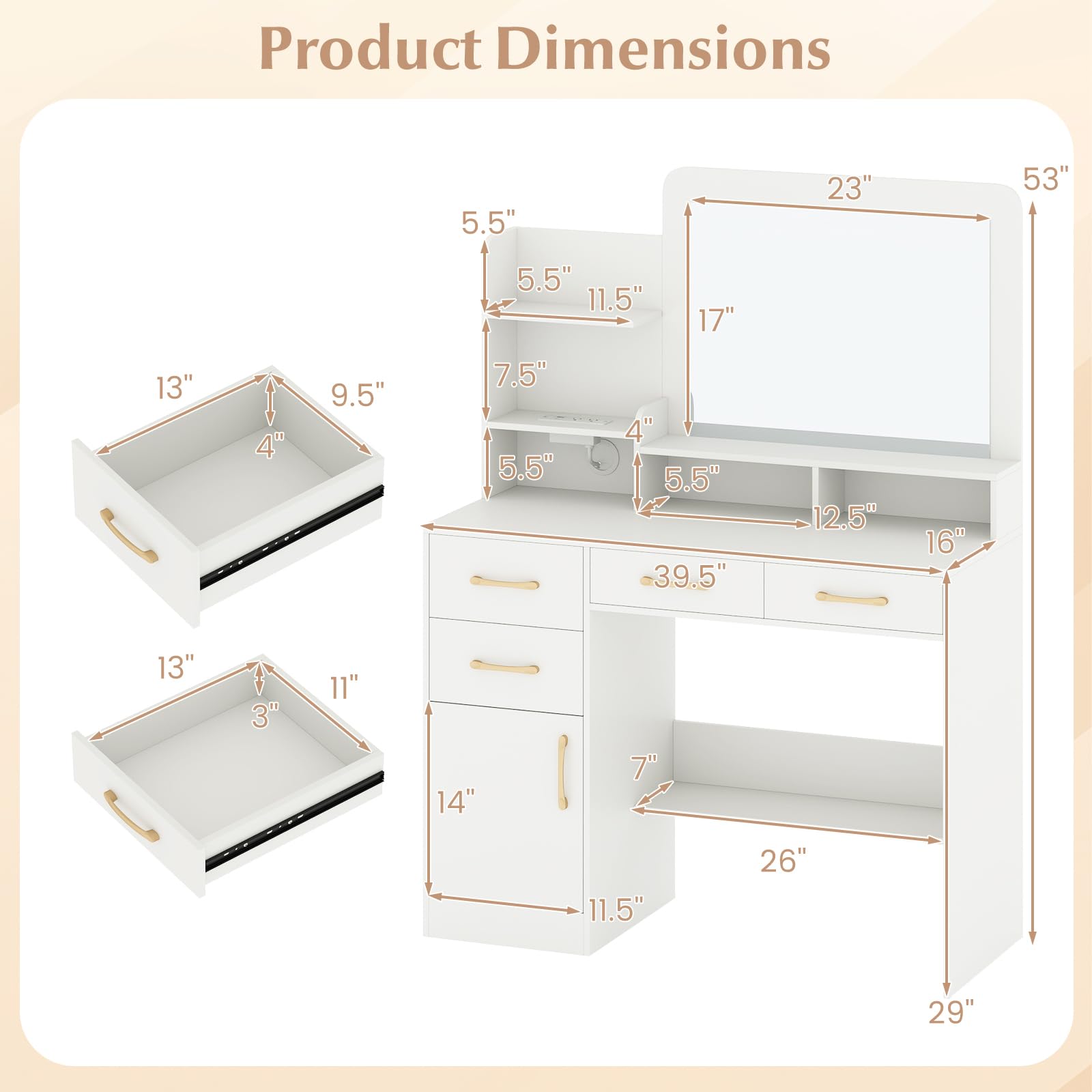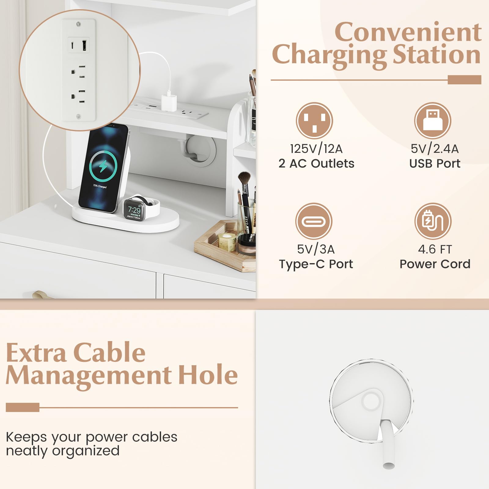 Upgrade your beauty routine with this modern vanity table. The large 23'' x 17'' mirror offers a clear view for flawless makeup and hair styling. With 4 drawers, 3 open shelves, 2 compartments, 1 side cabinet, and a spacious desktop, it provides ample storage for cosmetics, hair tools, and accessories. A built-in charging station with 2 AC outlets, 1 USB port, and 1 Type-C port keeps your devices powered while you get ready. Designed with cable management, anti-toppling kits, and non-slip foot pads, this vanity ensures stability, safety, and a neat setup.